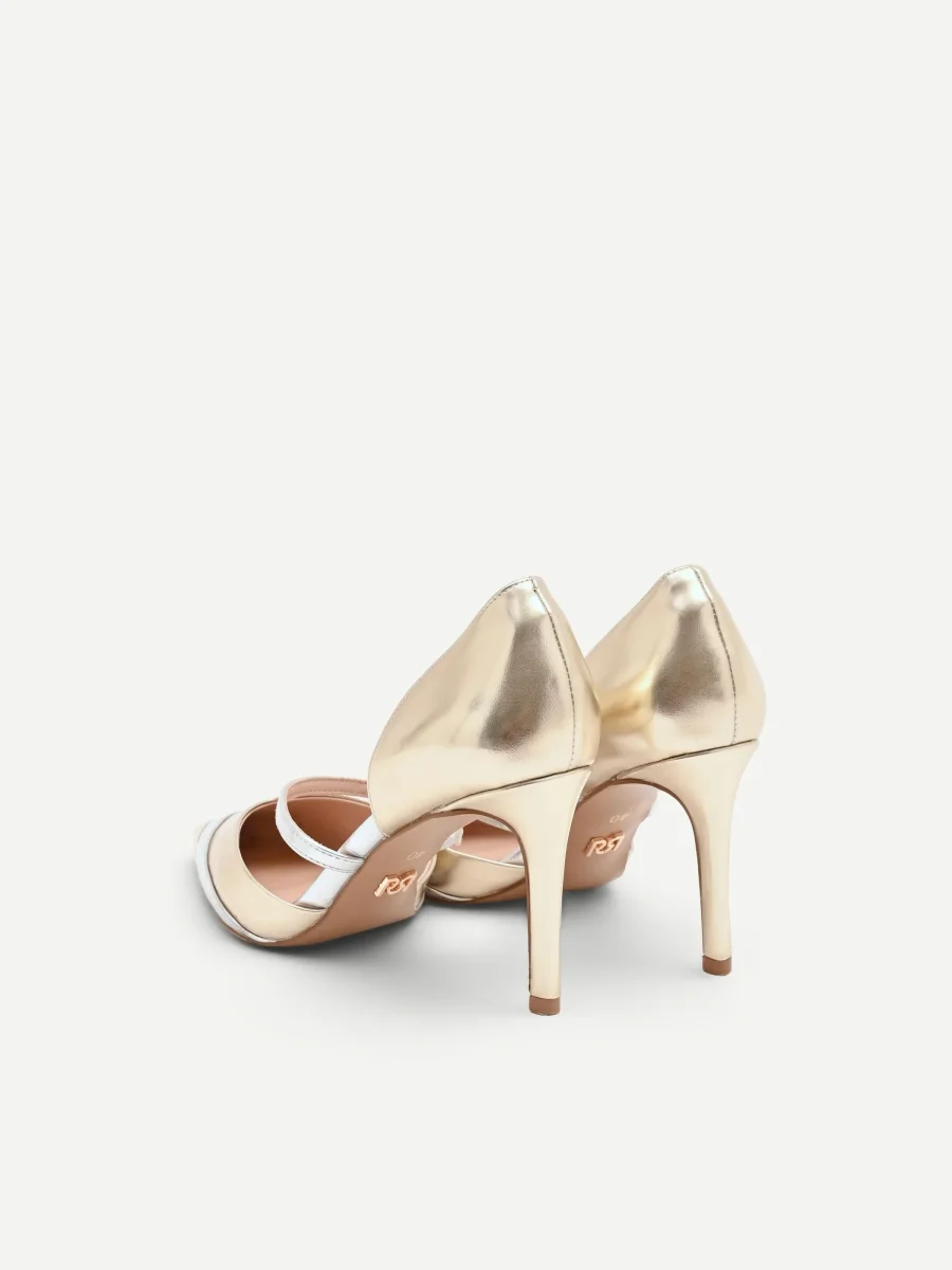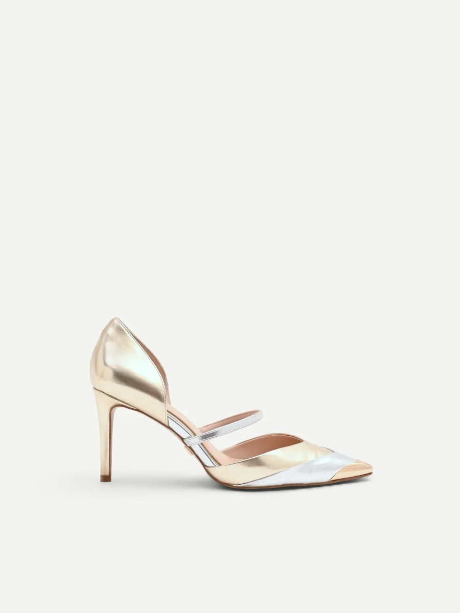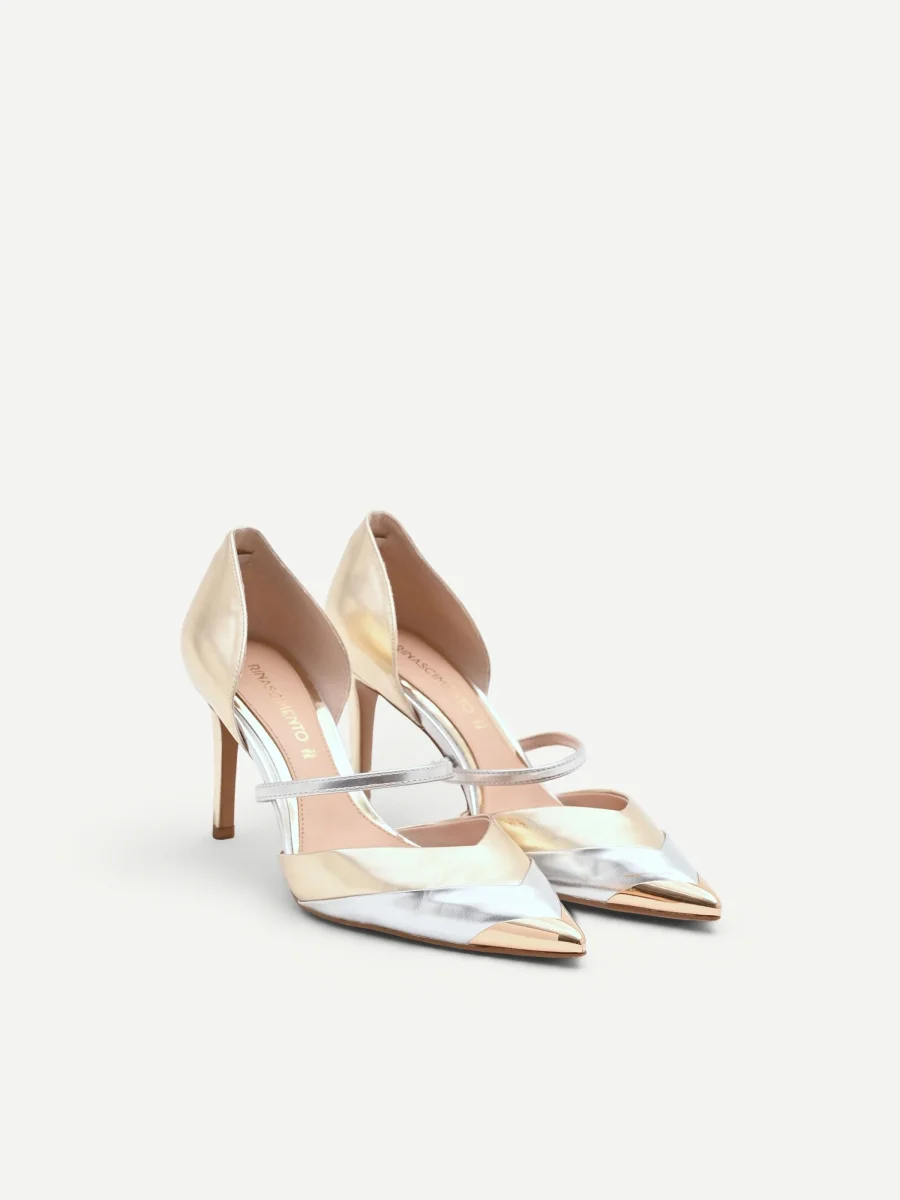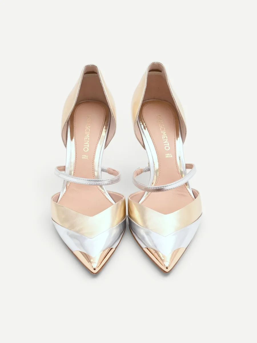 Realizzata in materiale effetto pelle, la sua silhouette è definita dall’elegante design d’Orsay, con un’apertura laterale che lascia scoperto l’arco del piede con raffinata sensualità. L’estetica si arricchisce di un sofisticato effetto bicolore: la struttura principale e il contrafforte risplendono nelle calde note dell’oro, mentre la punta affusolata e il sottile cinturino sul collo del piede brillano a contrasto nelle sfumature dell’argento. Questa alternanza cromatica crea un dinamismo visivo unico che sottolinea la linea del piede. Il tacco a spillo, alto e slanciato, accompagna il passo con sicurezza e femminilità. Pensata per gli eventi più importanti, dalle cerimonie alle serate esclusive, questa décolleté completa con maestria abiti da cocktail e look da sera, diventando protagonista assoluta dell’outfit. Un accessorio distintivo per la donna che ama esprimere il proprio stile attraverso dettagli ricercati e luminosi.