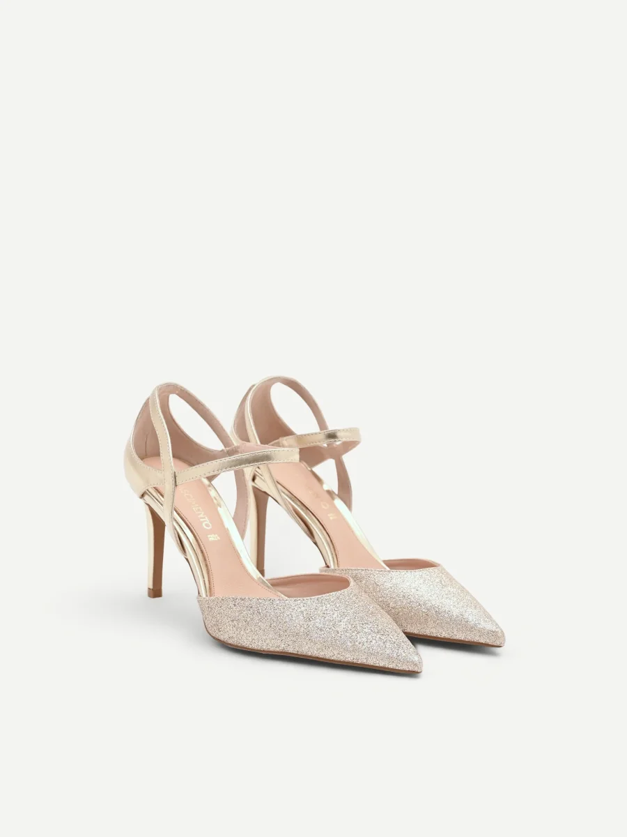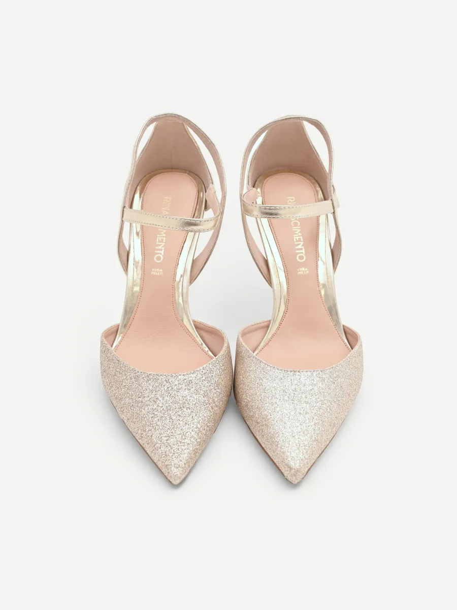 Un riflesso dorato che illumina ogni passo, la décolleté slingback è l’accessorio che trasforma un look in una dichiarazione di stile. Il design gioca con un affascinante contrasto di texture: la punta sfilata è avvolta da un luminoso tessuto glitter, mentre il tallone e i cinturini in effetto pelle risplendono grazie alla finitura laminata. La costruzione d’Orsay lascia sensualmente scoperto il lato interno del piede, aggiungendo un dettaglio di raffinatezza. Il modello è definito da una doppia legatura: un sottile cinturino che attraversa il collo del piede e un secondo che avvolge la caviglia, disegnando un’elegante apertura sul tallone. Con il suo tacco a spillo, slancia la silhouette con femminilità e sicurezza. Perfette per una cerimonia o una serata glamour, queste décolleté completano abiti lunghi e look da cocktail, diventando il punto focale di un outfit indimenticabile.