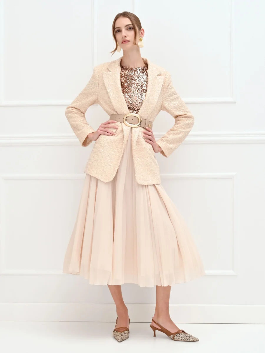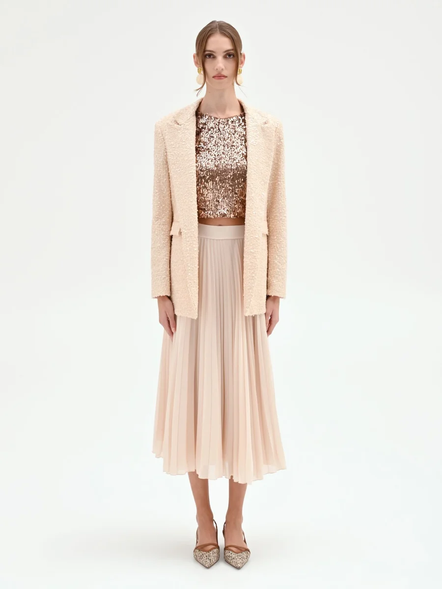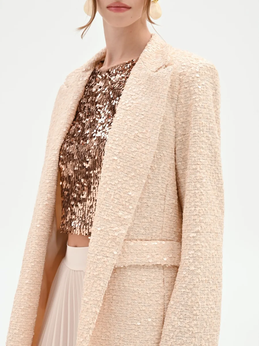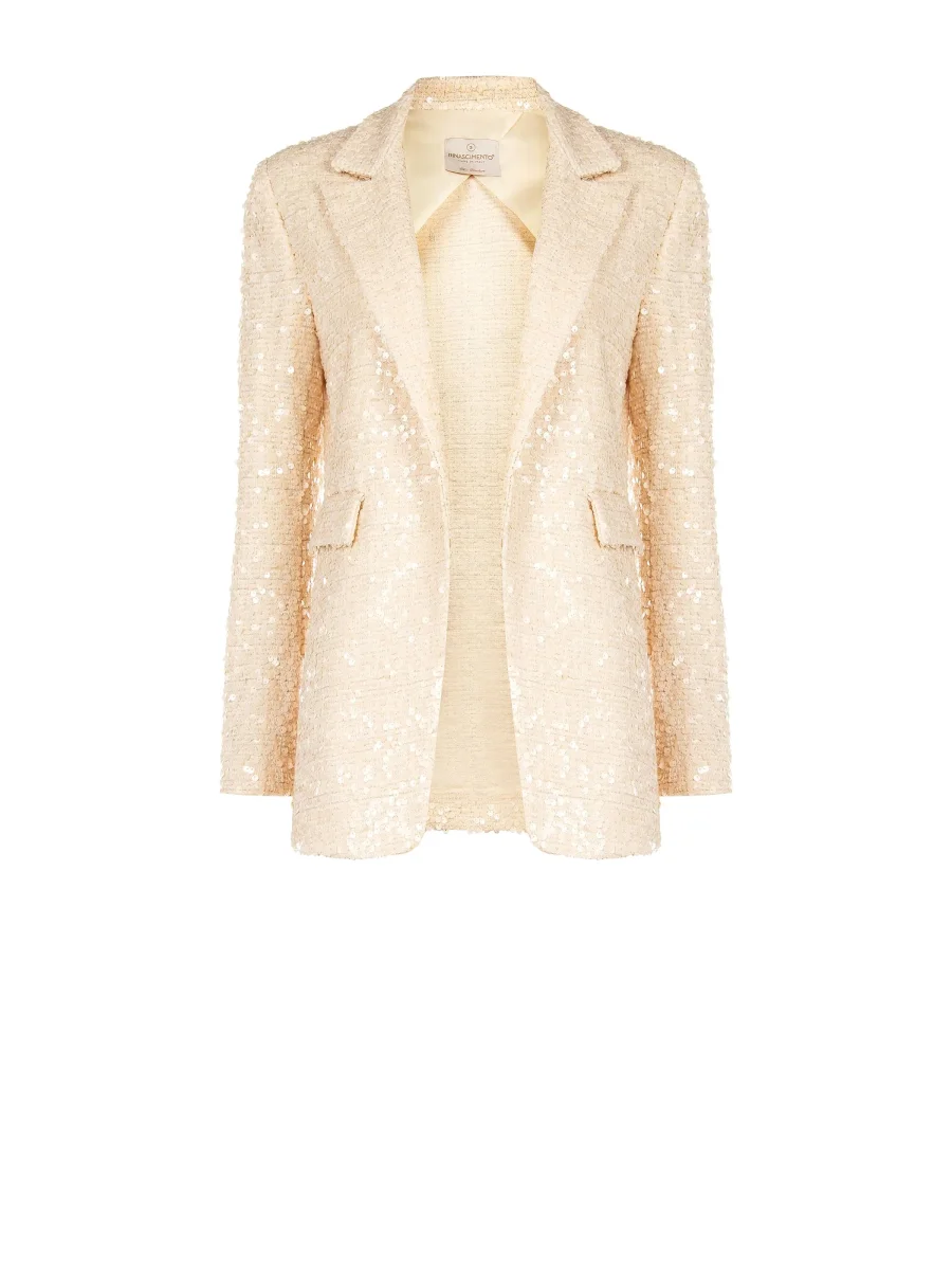 Un bagliore discreto illumina il design essenziale della giacca blazer monopetto beige chiaro. La sua superficie, interamente ricamata con paillettes tono su tono, crea una texture luminosa e ricercata. Il modello presenta un taglio dritto e pulito, con rever classico e tasche a pattina che ne definiscono la silhouette formale. Il design aperto la rende un capo versatile e facile da indossare, perfetto per aggiungere un punto luce al look.