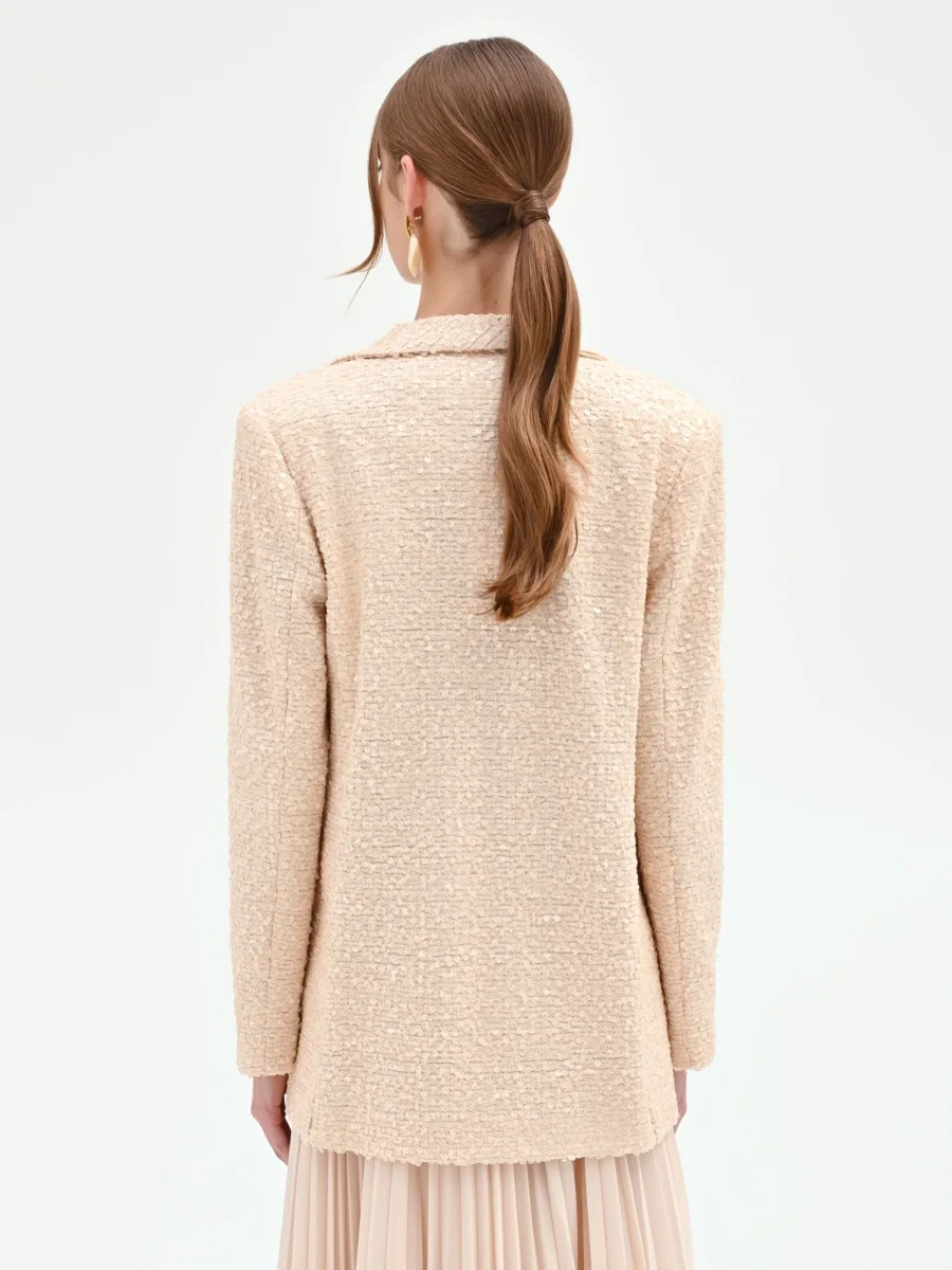 Perfetta da indossare in completo con la sua gonna coordinata, per creare un tailleur dall’allure contemporanea e femminile. Indossala per un aperitivo o una cena speciale, abbinandola a top leggeri e accessori luminosi della collezione. Grazie alla sua eleganza misurata, questa giacca si presta anche a interpretazioni più casual: provala su un jeans e una blusa essenziale per dare un tocco glam a un look da giorno o a un appuntamento di lavoro.