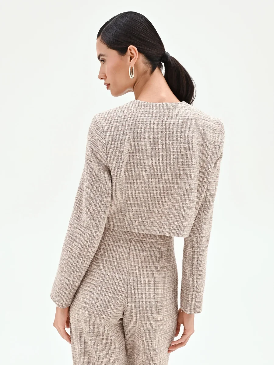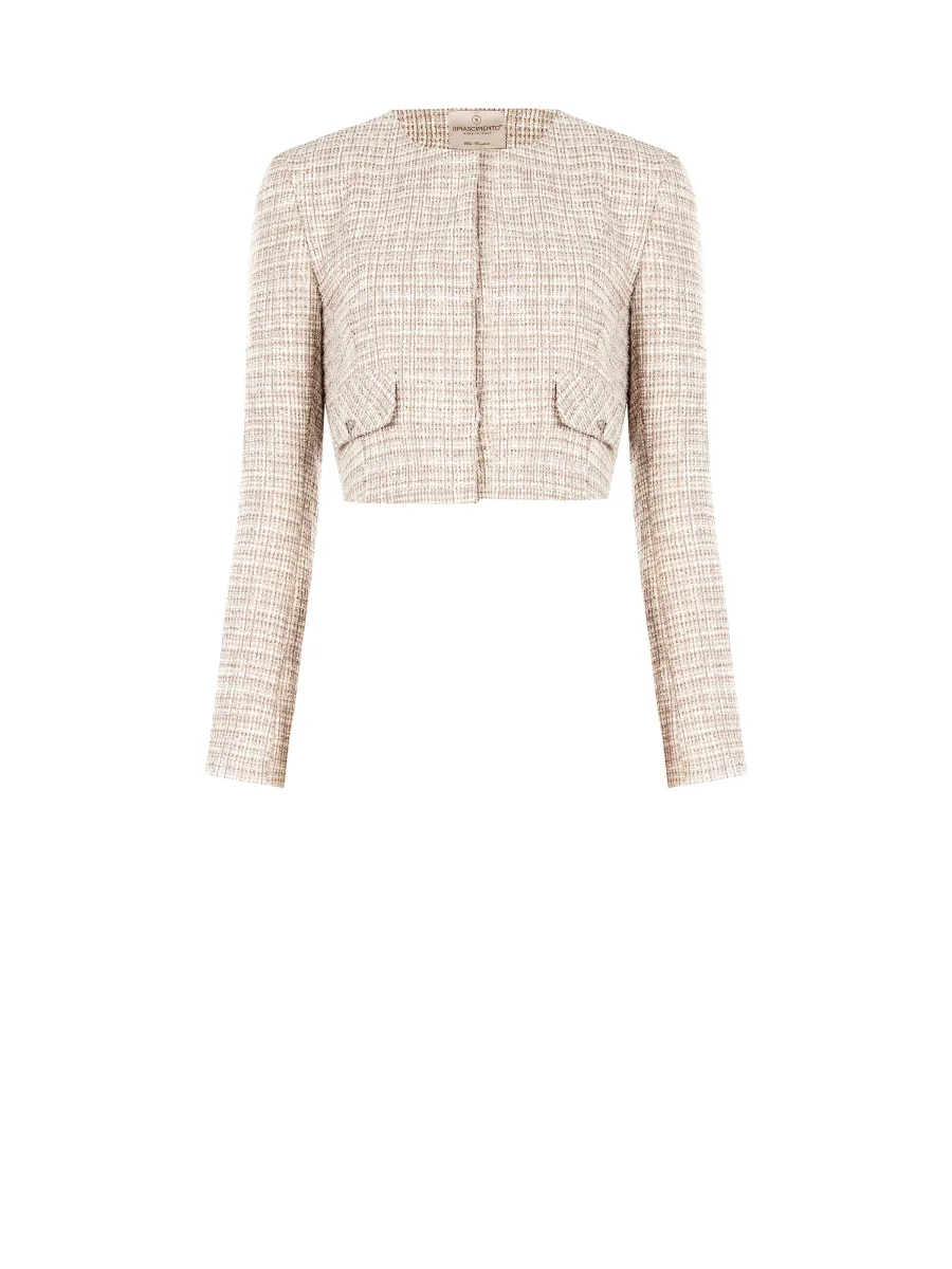 Realizzata in un tessuto bouclé, la sua texture è definita da una delicata fantasia a quadretti che nasce dall’intreccio di fili color beige e panna. Il design è pulito e strutturato, con scollo rotondo e un taglio corto che valorizza il punto vita. La chiusura centrale con bottone automatico nascosto mantiene l’essenzialità della linea. Ad impreziosire il modello sono le due tasche applicate sul petto, i cui angoli sono decorati da piccole borchie piramidali che aggiungono un tocco grintoso e luminoso.