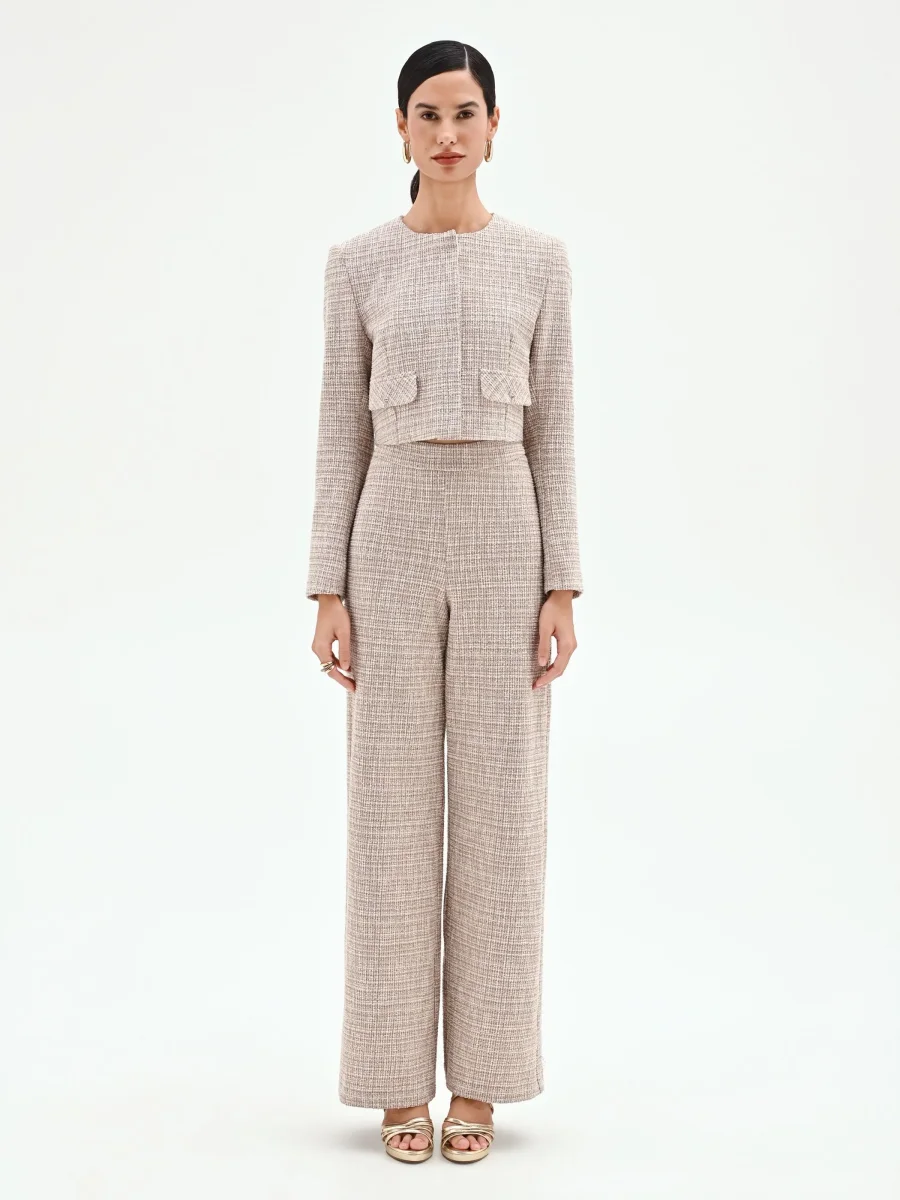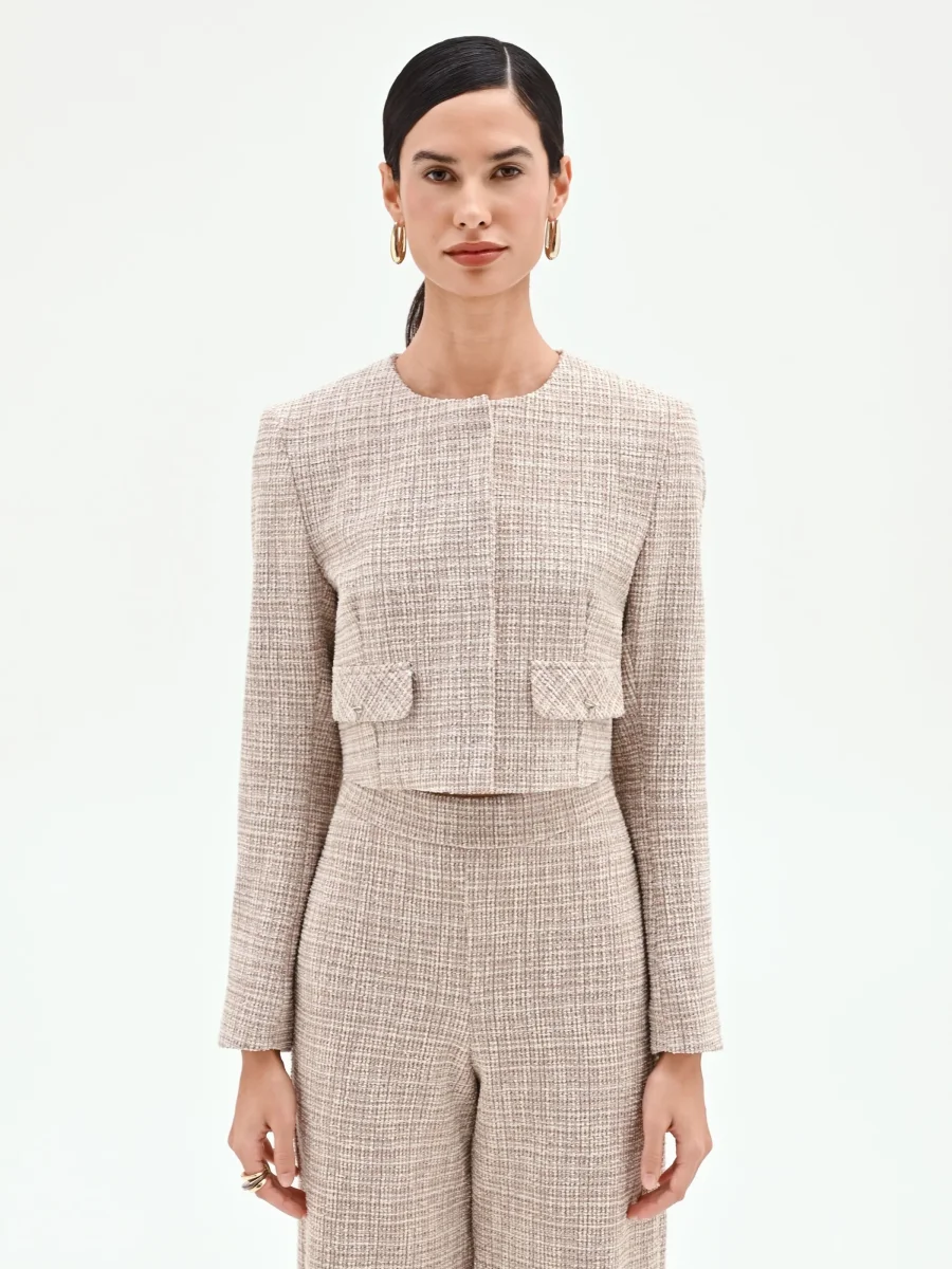 Il fascino intramontabile del tweed si rinnova in una giacca dalla silhouette contemporanea, un capo versatile che unisce ispirazione maschile e dettagli femminili.