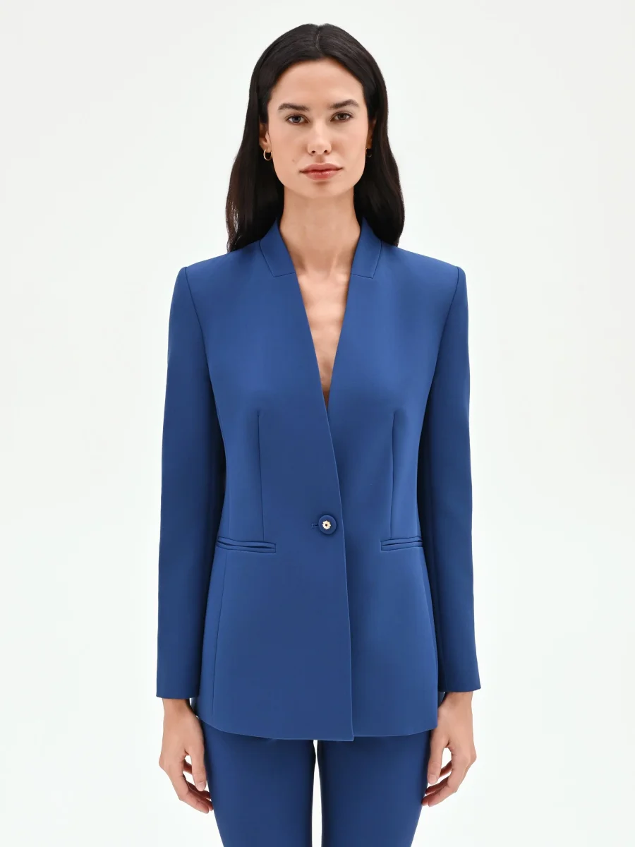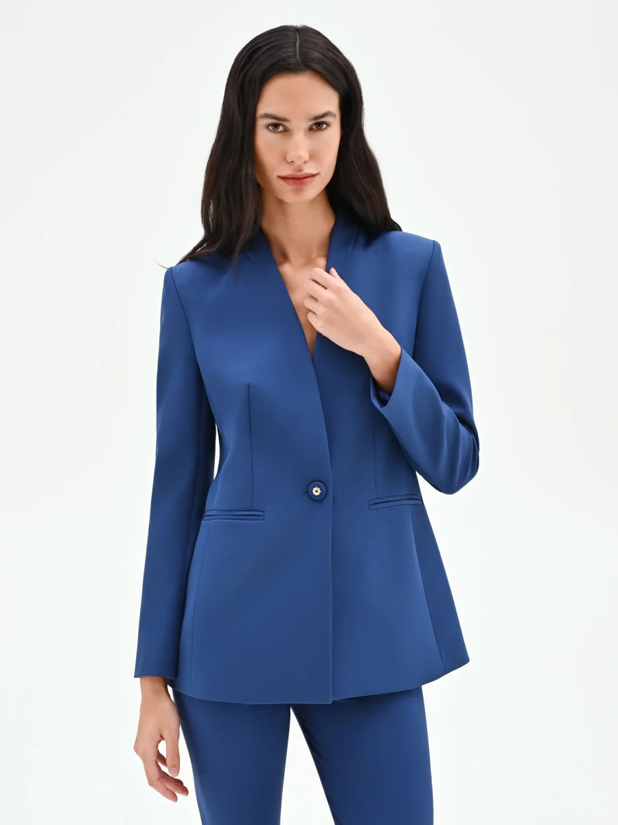 Un’interpretazione contemporanea dell’eleganza formale, la giacca blu brillante è un capo essenziale per un guardaroba versatile e ricercato. La sua silhouette pulita e strutturata, realizzata in confortevole tessuto tecnico, è disegnata per valorizzare la figura grazie a una linea leggermente sciancrata che segue le forme con armonia. Il tratto distintivo del modello è il profondo scollo a V senza rever, un dettaglio di stile che conferisce un’estetica moderna e minimalista, allungando visivamente il busto. La chiusura è affidata a un unico bottone centrale, un elemento a contrasto con dettaglio metallico dorato che illumina il colore vibrante del capo. Le spalle definite e le due tasche a filetto completano un design impeccabile nelle sue proporzioni. Perfetta da indossare con i suoi pantaloni coordinati (codice CFC0128464003B611) per creare un completo di carattere, ideale per l’ufficio o un evento diurno. Si presta anche a look spezzati, abbinata a gonne longuette o a un jeans per occasioni meno formali, confermando la sua anima versatile.