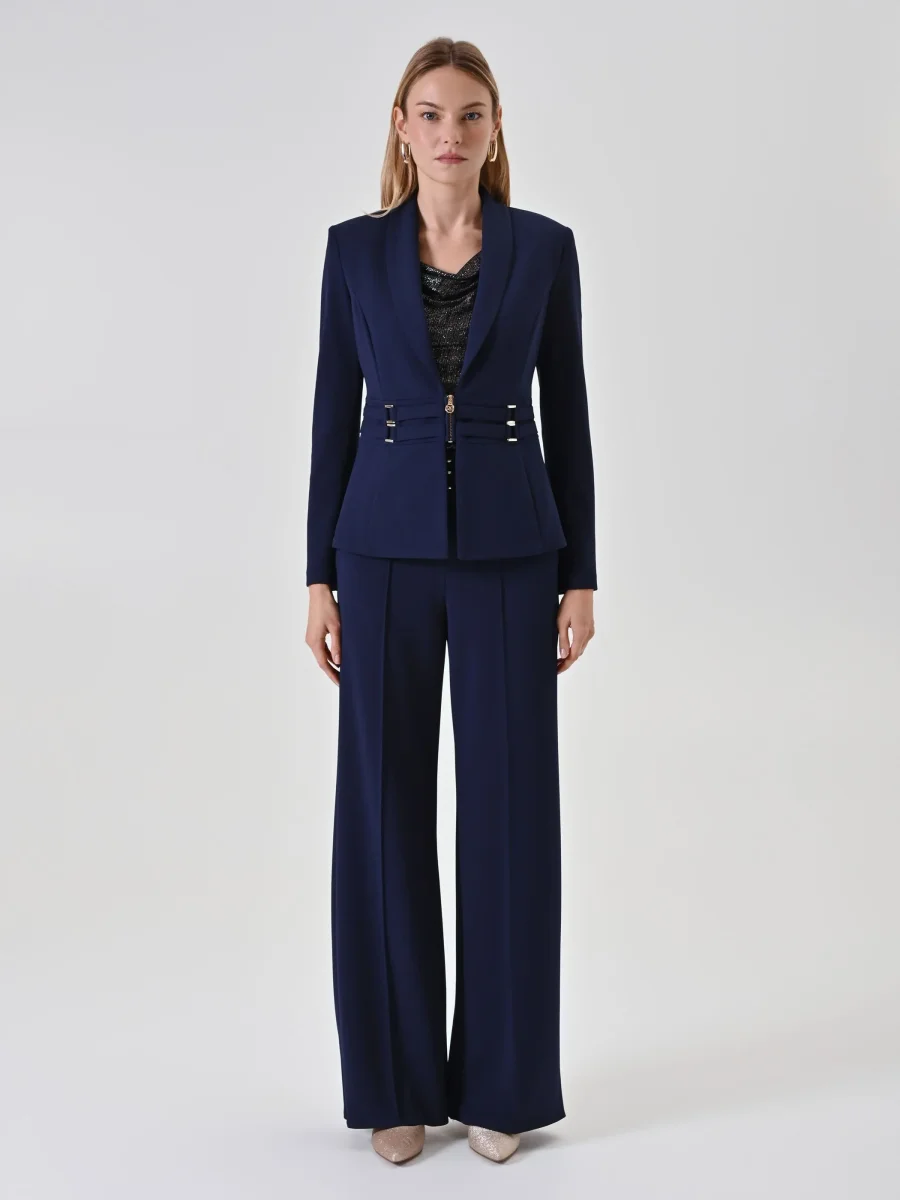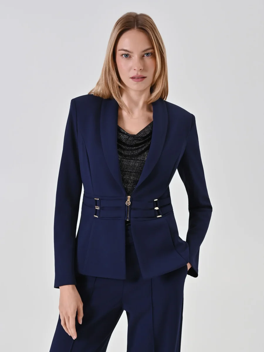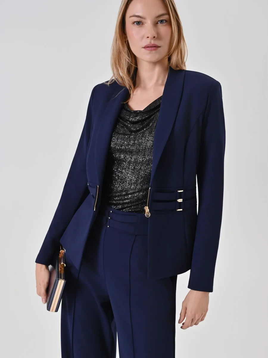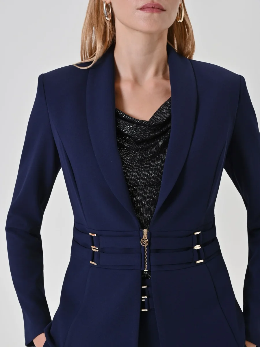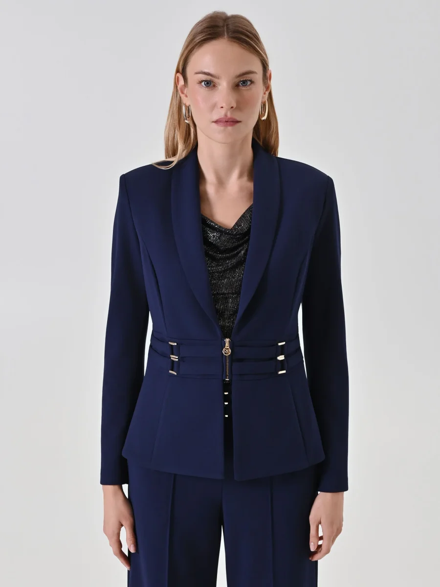 Realizzata in scuba mano crepe, questa giacca blazer blu si distingue per la sua linea sfiancata che enfatizza il punto vita grazie a un originale dettaglio effetto bustier, impreziosito da fibbie decorative in metallo dorato. Il collo con revers a scialle e la piccola zip centrale a vista definiscono un look contemporaneo e grintoso, mentre il fondo leggermente svasato a peplo aggiunge un movimento armonioso.