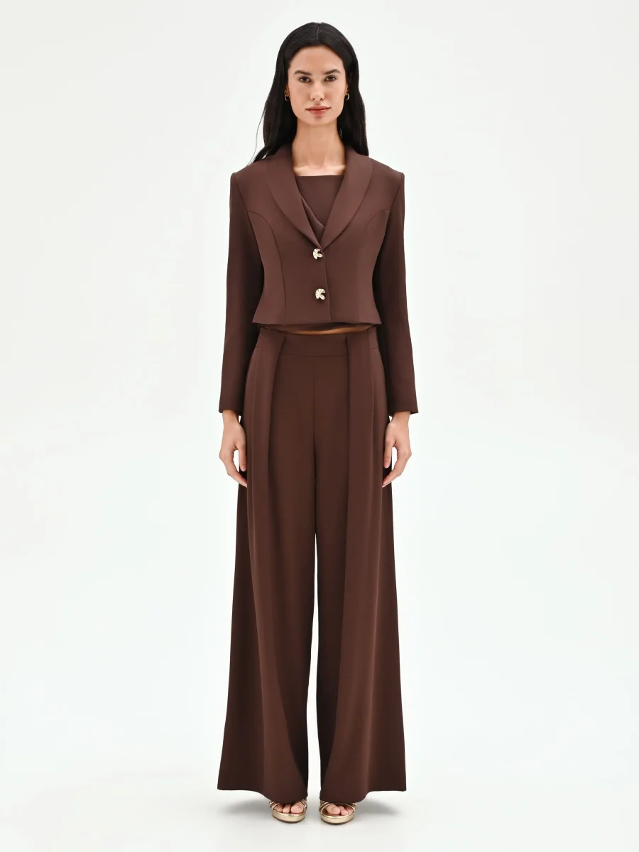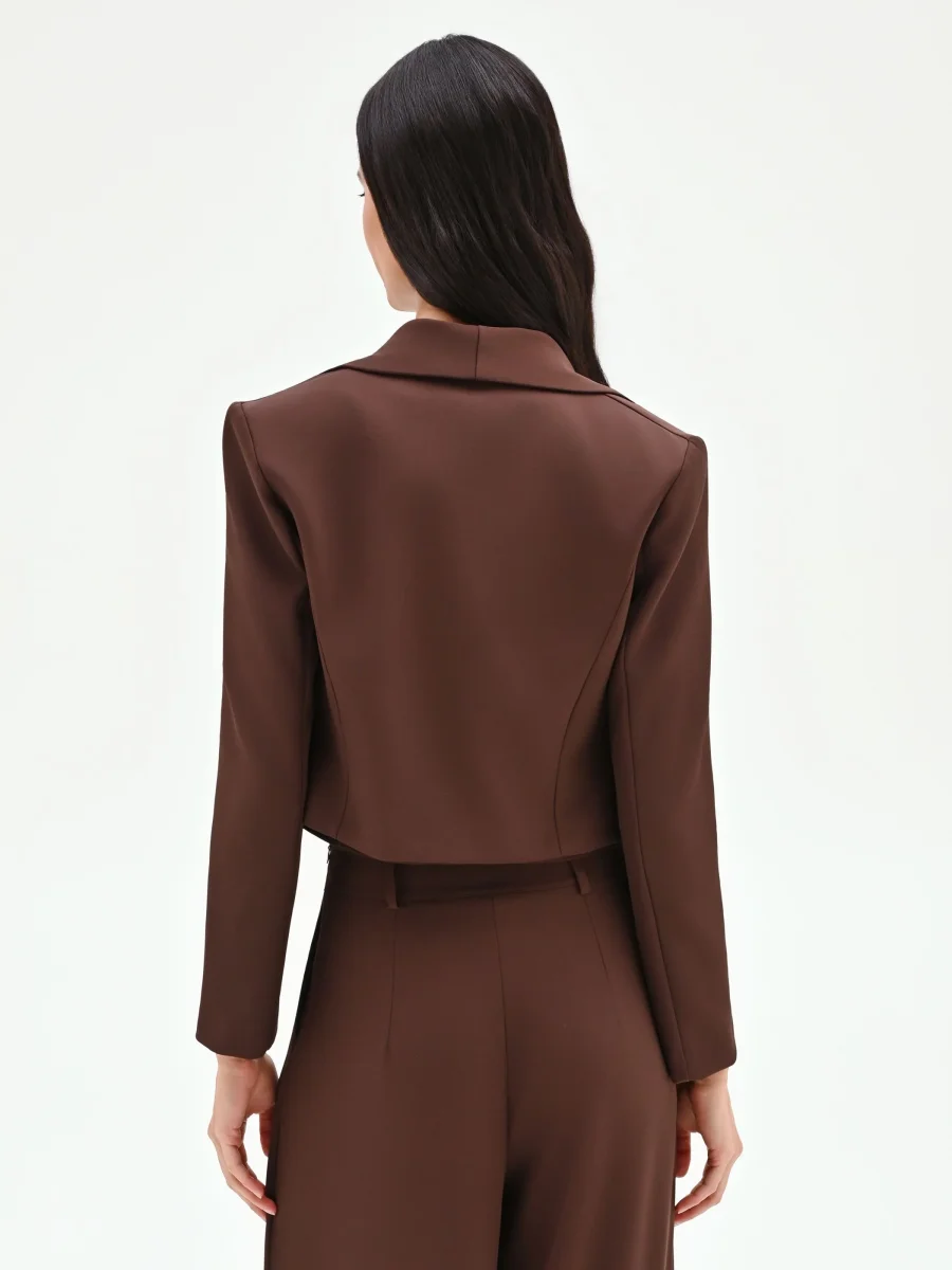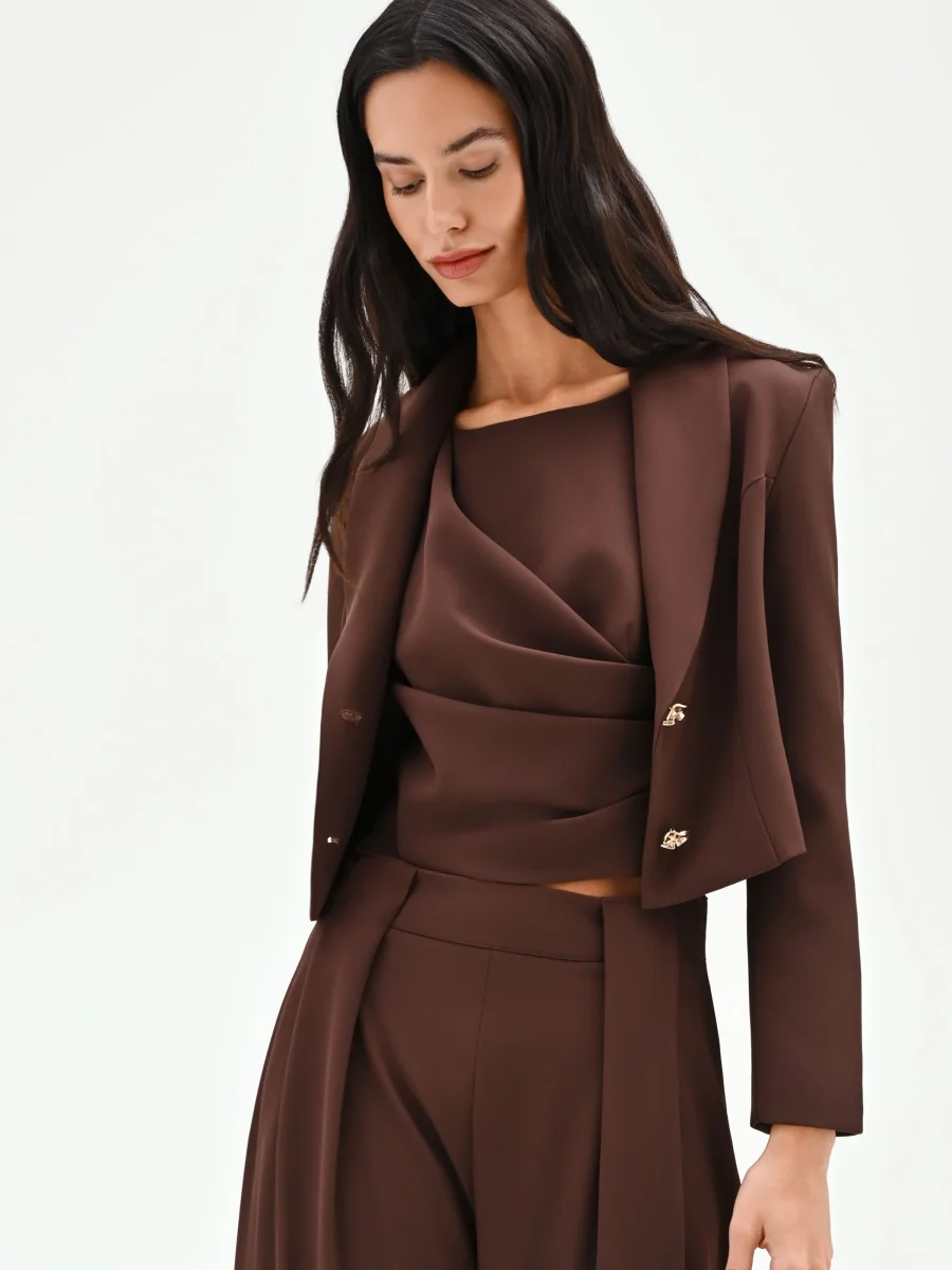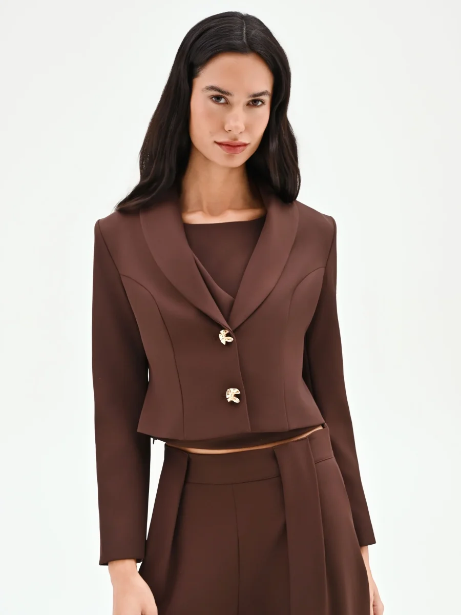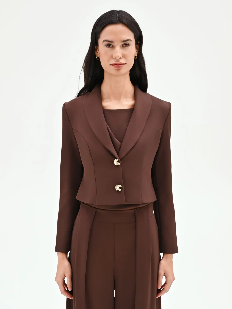 Una silhouette decisa e una nuance calda e avvolgente: la giacca blazer color cioccolato è il capo chiave per definire un look contemporaneo e ricco di personalità. Realizzata in cadi, un tessuto fluido e piacevole al tatto, questa giacca presenta una linea studiata per esaltare la figura. Il taglio corto si ferma in vita, mentre la costruzione avvitata è accentuata da cuciture a vista che seguono e definiscono le forme con armonia. L’ampio rever sagomato incornicia un profondo scollo a V, un dettaglio che conferisce slancio e femminilità. A rendere unico il modello è la chiusura monopetto, affidata a due bottoni design dalla finitura dorata e dalla forma scultorea, veri e propri punti luce che catturano l’attenzione. Un capo versatile, perfetto per completare un completo elegante se abbinato al suo pantalone coordinato CFC0127533003B401 e al top CFC0127545003B401. Ideale per l’ufficio o per appuntamenti formali, è la scelta perfetta per la donna che cerca un capo funzionale senza mai rinunciare a un tocco di stile.