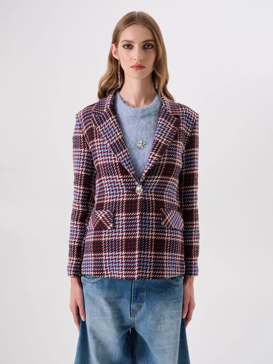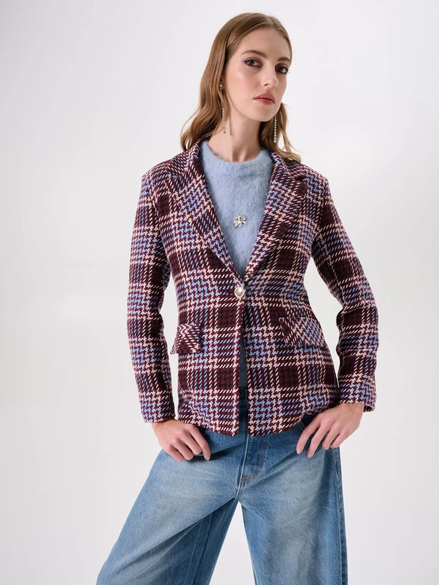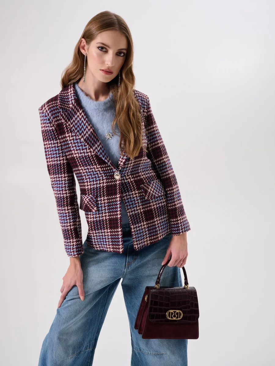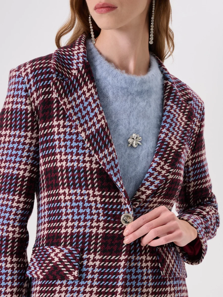 Il gusto classico per i tessuti di ispirazione maschile incontra un design contemporaneo nella giacca blazer in tweed rosso bordeaux. La sua fantasia, un gioco sofisticato di motivi pied-de-poule e quadri, si declina in una palette che unisce il bordeaux all’azzurro, il beige e il nero, rendendola un capo chiave del guardaroba invernale.