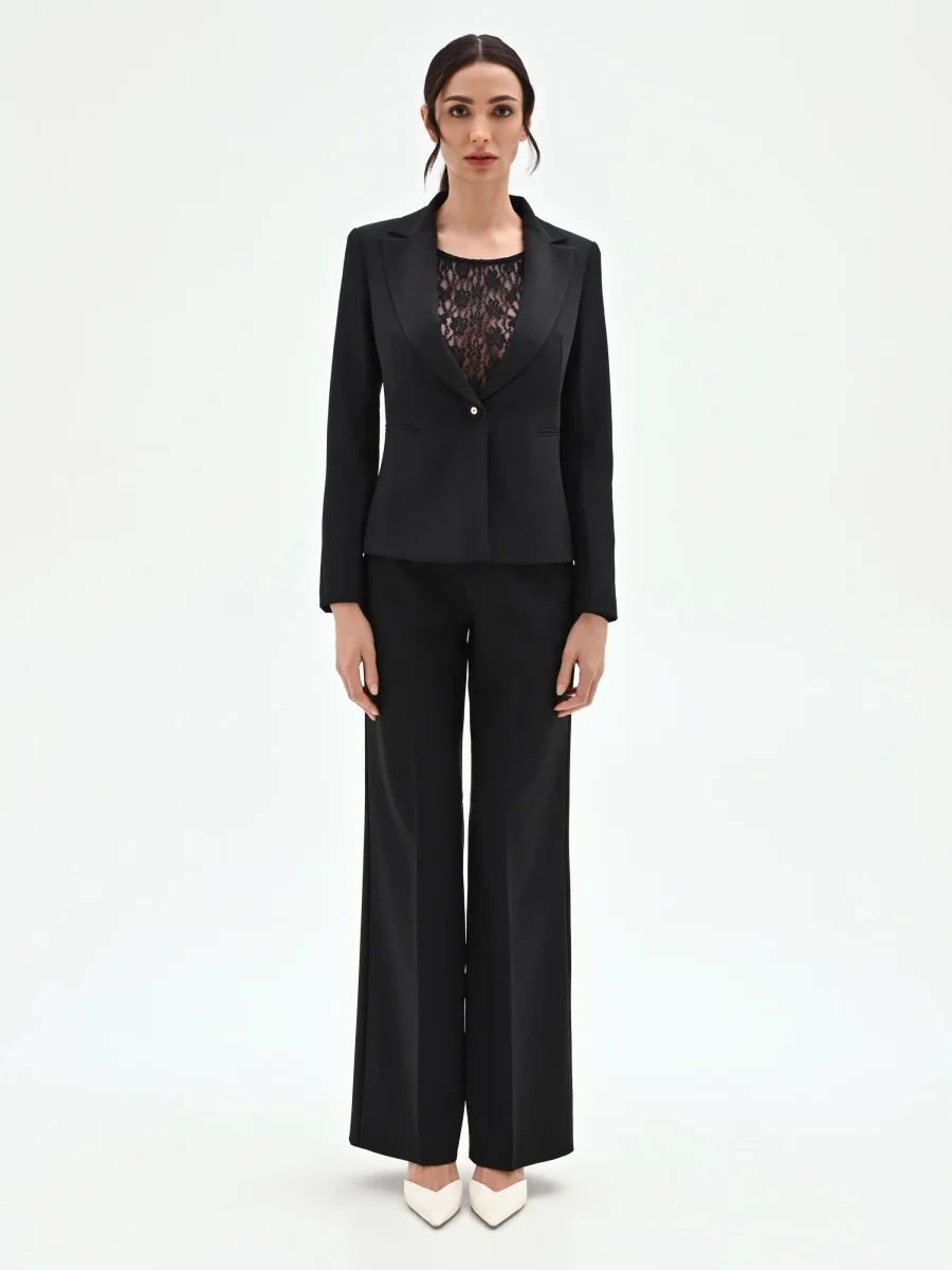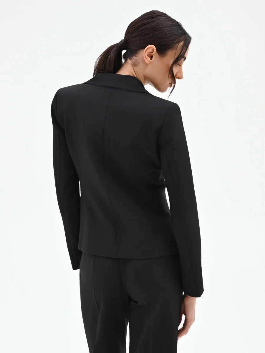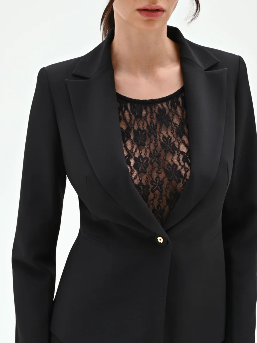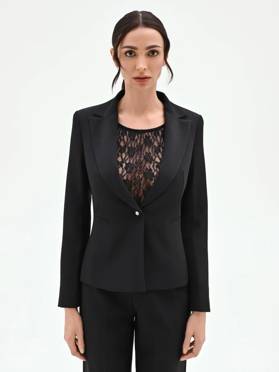 La definizione di un’eleganza funzionale, che non rinuncia a un dettaglio ricercato. Questa giacca blazer, realizzata in tessuto tecnico nero, è un pilastro del guardaroba femminile, pensato per accompagnare la donna in molteplici occasioni. La sua linea sfiancata segue e valorizza la silhouette con naturalezza. Il design monopetto si distingue per i raffinati revers a lancia in tessuto lucido a contrasto, che creano un interessante gioco di texture. La chiusura è affidata a un unico e distintivo bottone gioiello a forma di fiore, un punto luce che cattura lo sguardo. Completano la costruzione del capo le discrete tasche a filetto e le maniche lunghe.