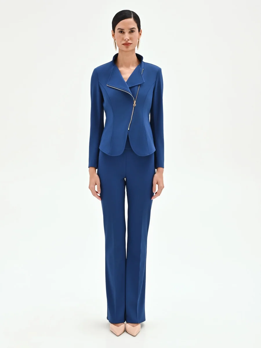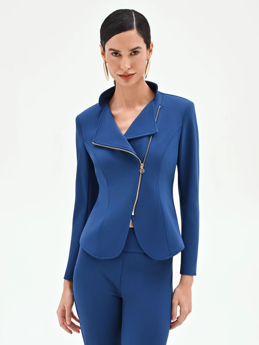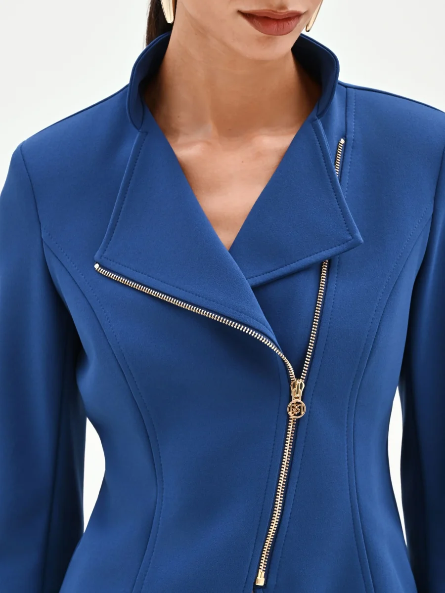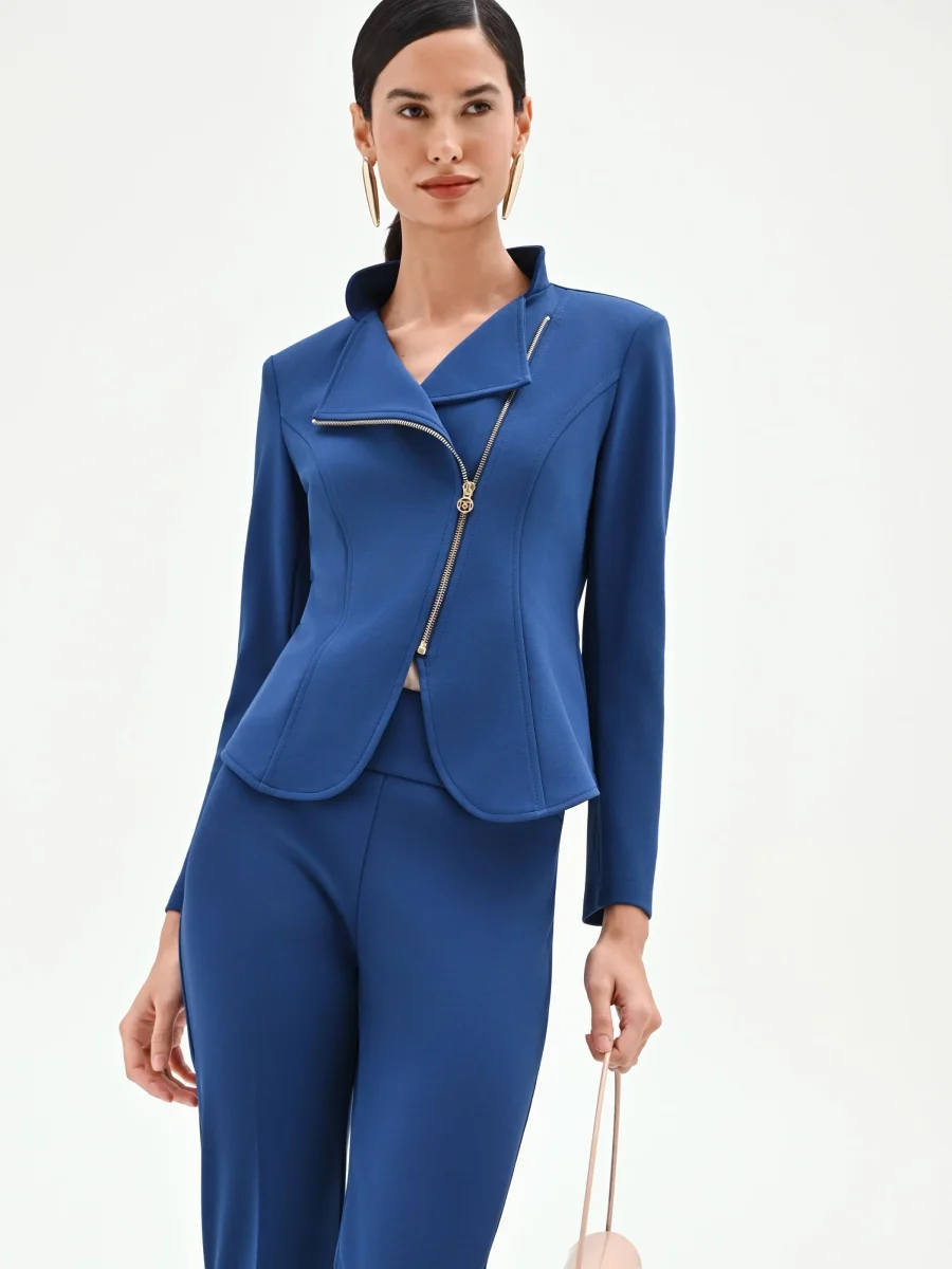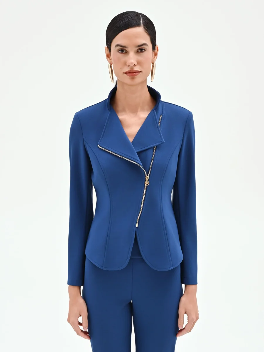 Realizzata in scuba crèpe, un tessuto tecnico che unisce comfort e una caduta strutturata, la giacca presenta una linea sciancrata, disegnata per valorizzare la silhouette attraverso precisi tagli verticali. Il collo alto si trasforma in un rever asimmetrico che incornicia il décolleté, mentre la chiusura diagonale con zip a vista in metallo dorato aggiunge un tocco luminoso e contemporaneo. Il fondo sagomato segue armoniosamente le linee del corpo.