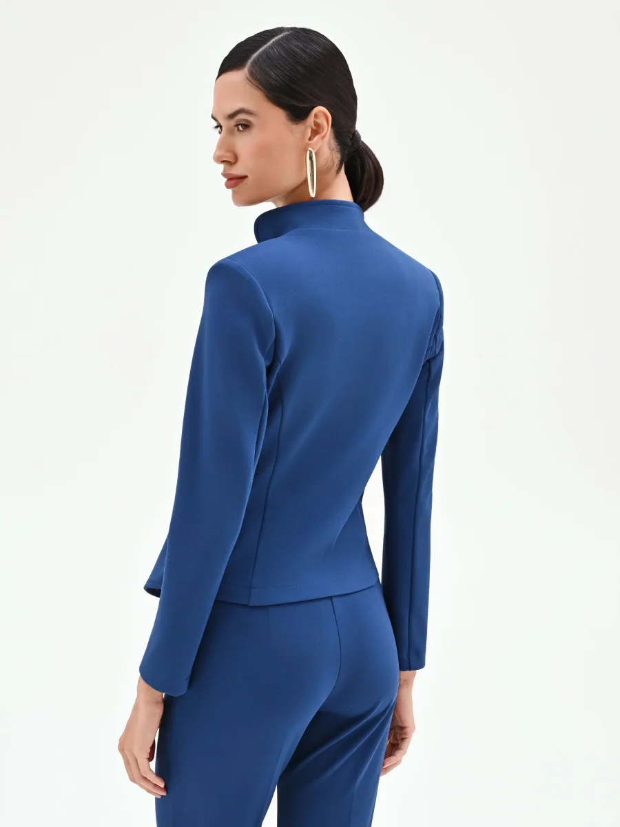 Un’interpretazione moderna della giacca formale, definita da una cromia blu brillante e un design che gioca con le asimmetrie. È il capo perfetto per la donna che desidera un look dall’eleganza decisa, capace di passare con disinvoltura da un contesto professionale a un’occasione più informale.