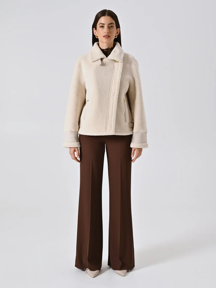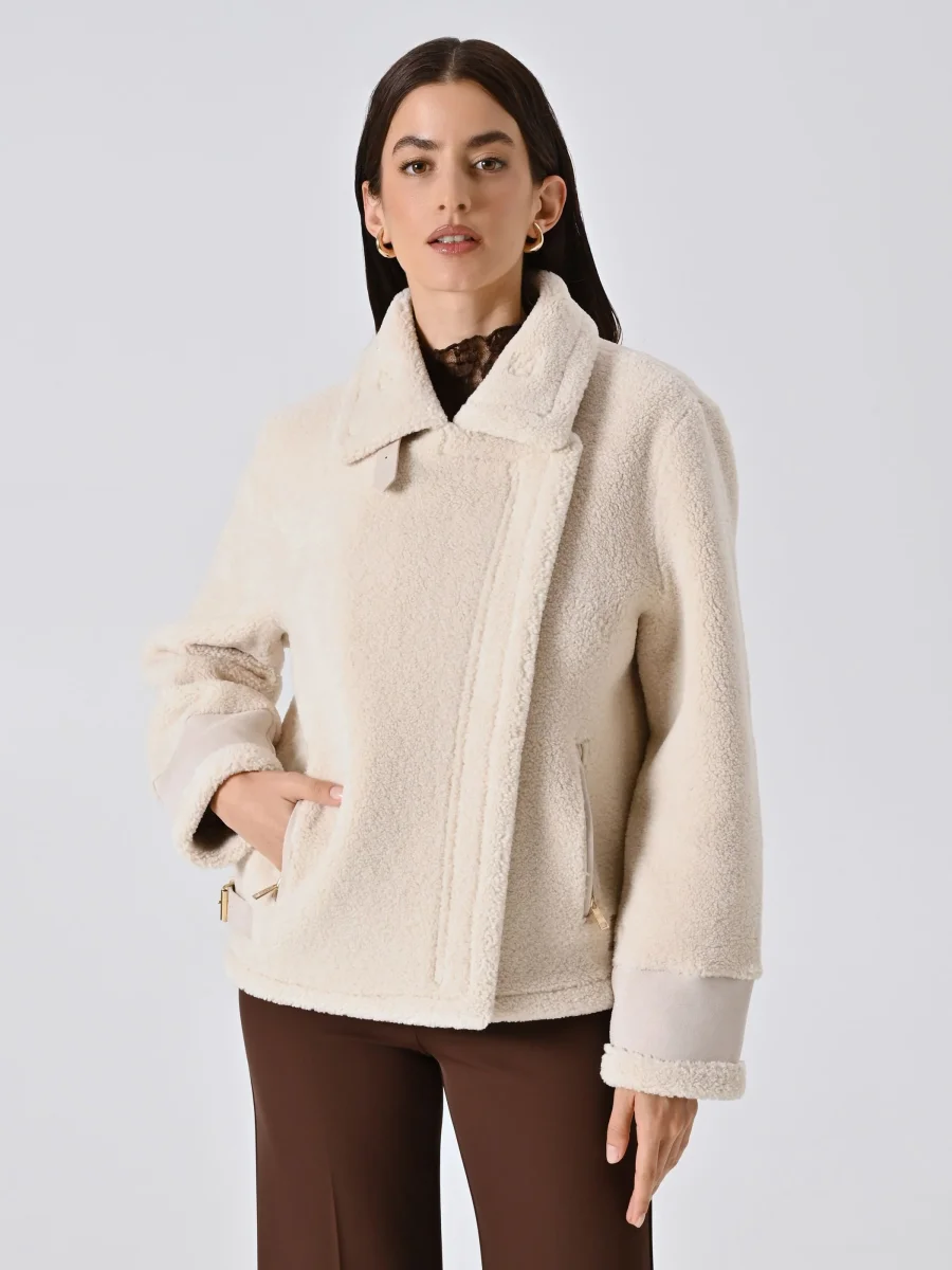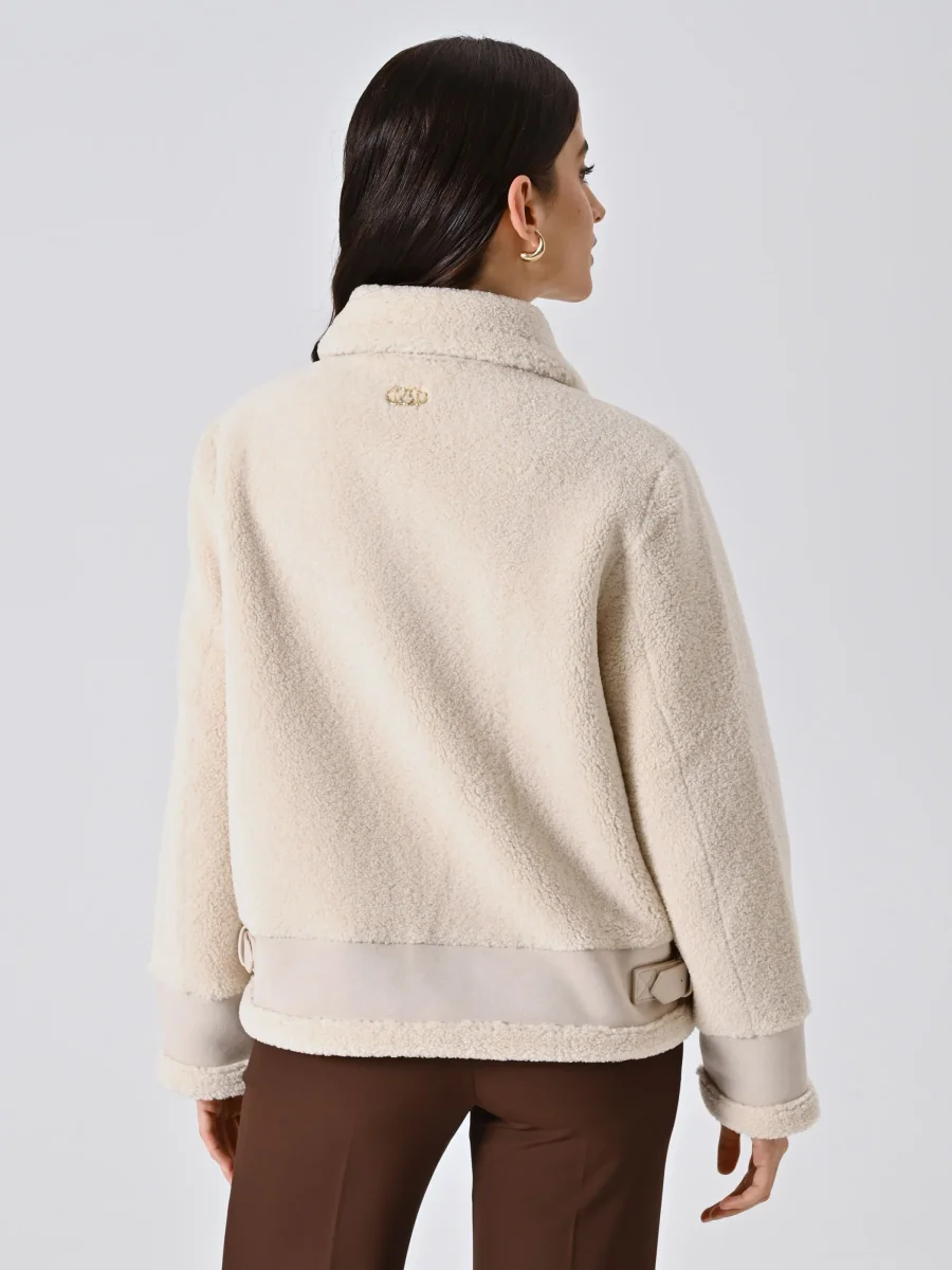 La Giacca Bombardier effetto Sherling è il capo perfetto per aggiungere carattere ai tuoi look invernali con un tocco deciso e femminile.