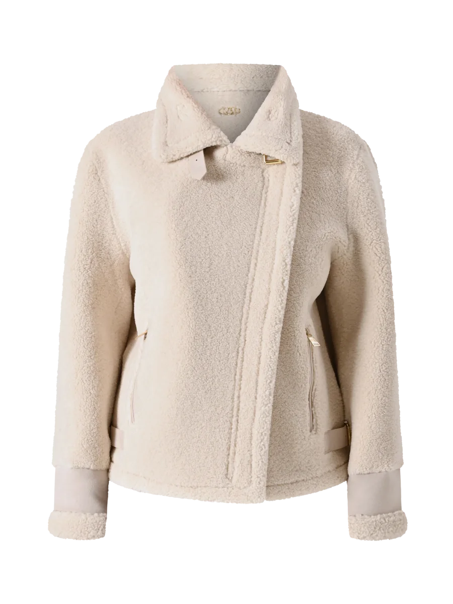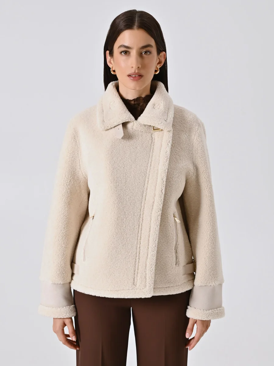 La Giacca Bombardier effetto Sherling è realizzata in morbido tessuto fake sherling, con taglio bomber e dettagli curati che fanno la differenza. Presenta tasche alla francese con zip, collo con piccoli revers e inserti in simil pelle impreziositi da fibbie dorate. La chiusura è asimmetrica con zip coperta, per un effetto avvolgente e moderno.