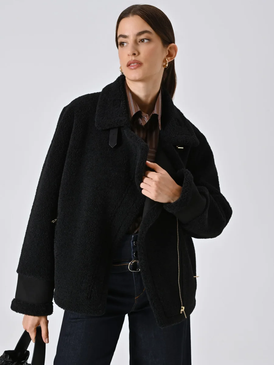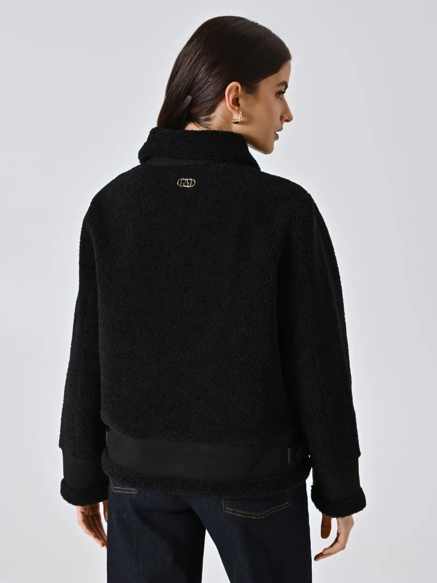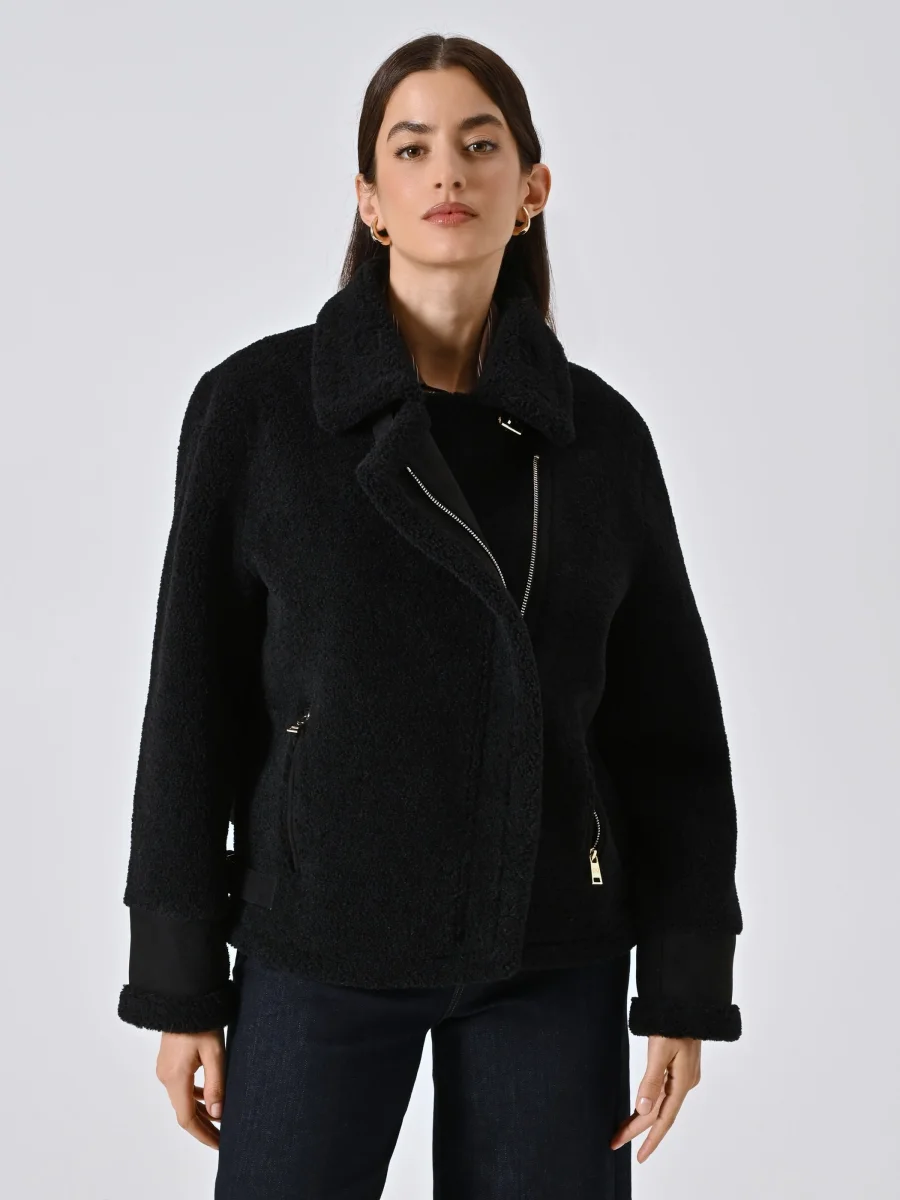 La Giacca Bombardier effetto Sherling è il capo perfetto per aggiungere carattere ai tuoi look invernali con un tocco deciso e femminile.