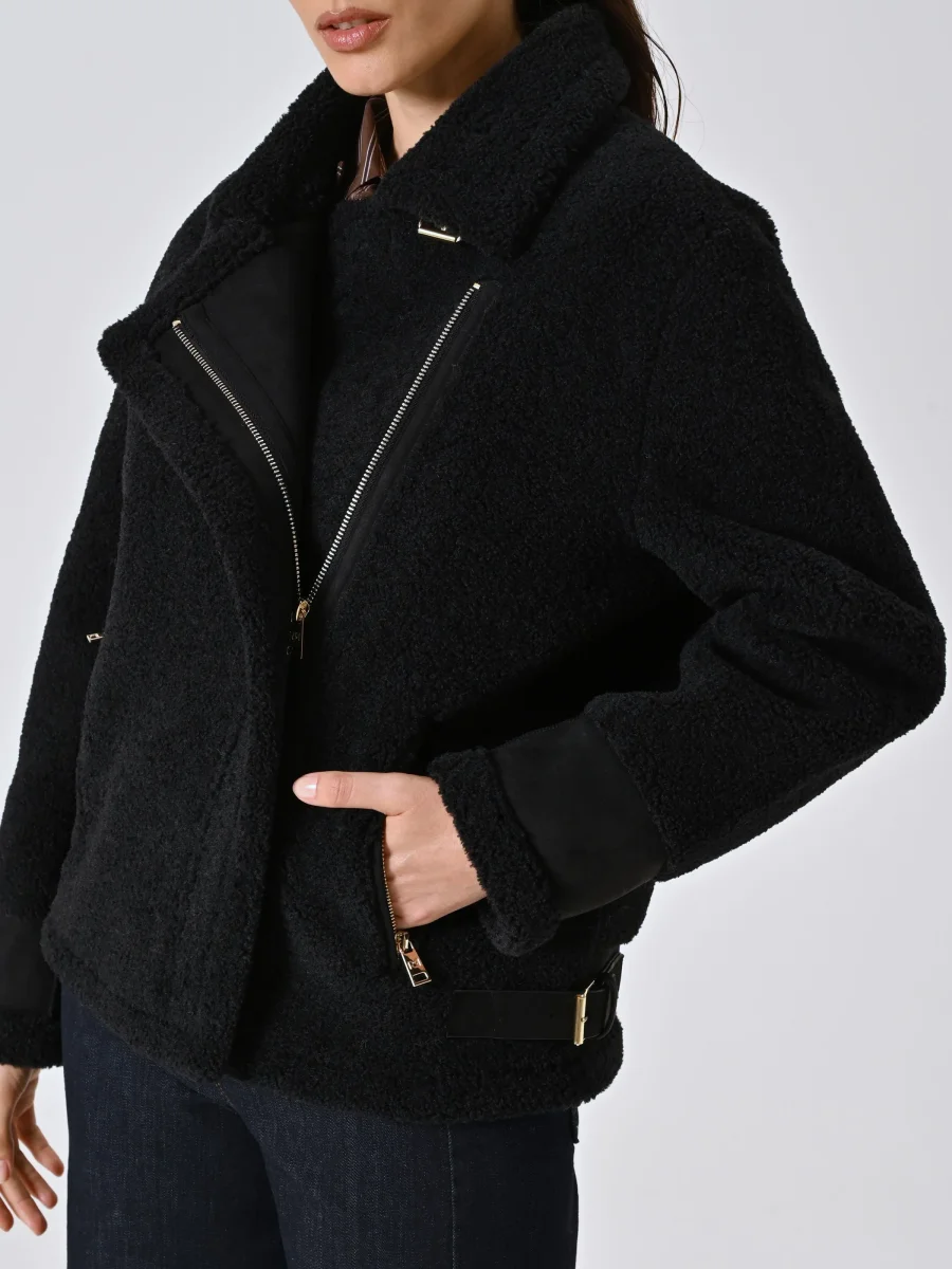 La Giacca Bombardier effetto Sherling è realizzata in morbido tessuto fake sherling, con taglio bomber e dettagli curati che fanno la differenza. Presenta tasche alla francese con zip, collo con piccoli revers e inserti in simil pelle impreziositi da fibbie dorate. La chiusura è asimmetrica con zip coperta, per un effetto avvolgente e moderno.