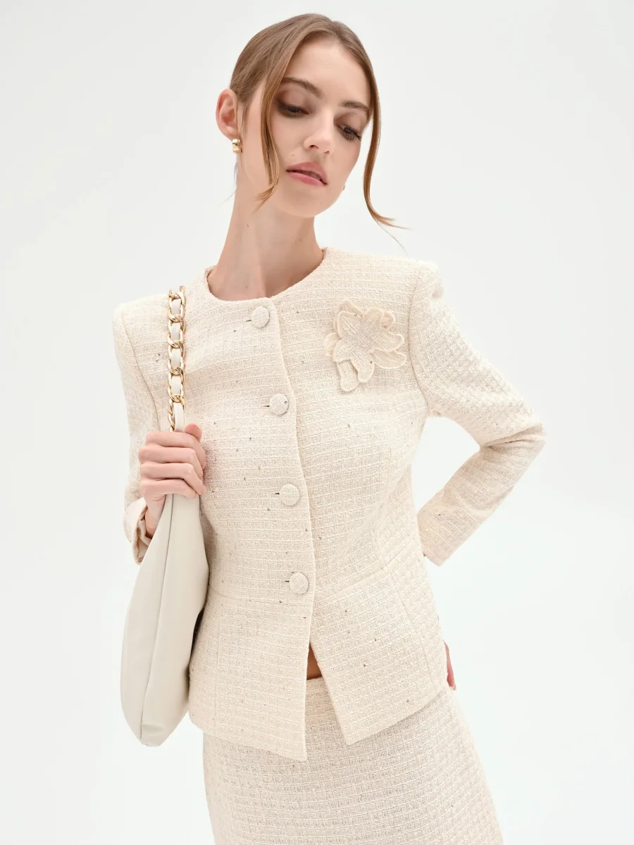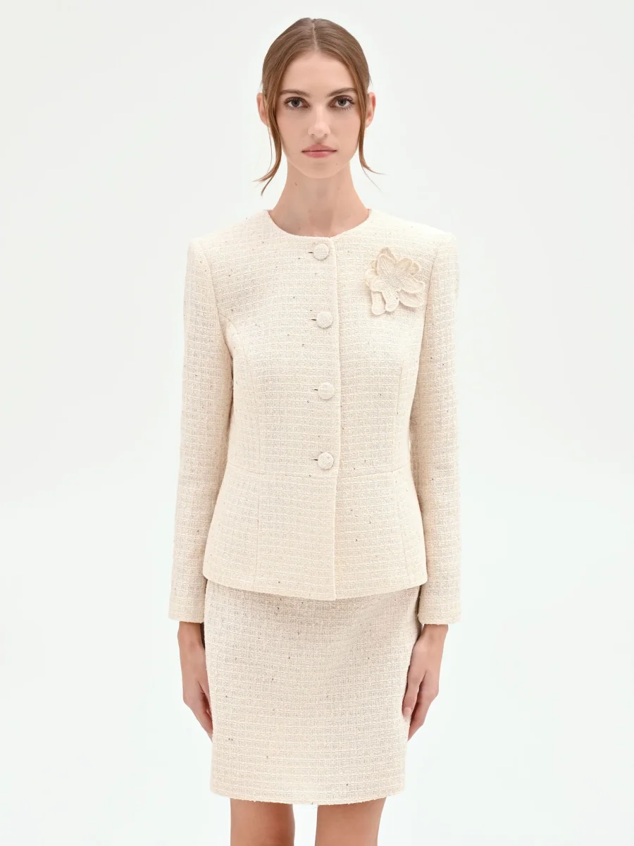 Realizzata in un morbido tessuto effetto bouclé, presenta una linea avvitata studiata per valorizzare la silhouette, con uno scollo rotondo che lascia spazio a bluse e collane. La chiusura frontale con bottoni rivestiti scompare nella trama del tessuto, mentre il fiore stilizzato applicato sul petto diventa un punto focale di grande raffinatezza. Il leggero effetto peplum sul fondo aggiunge un tocco di grazia e movimento.