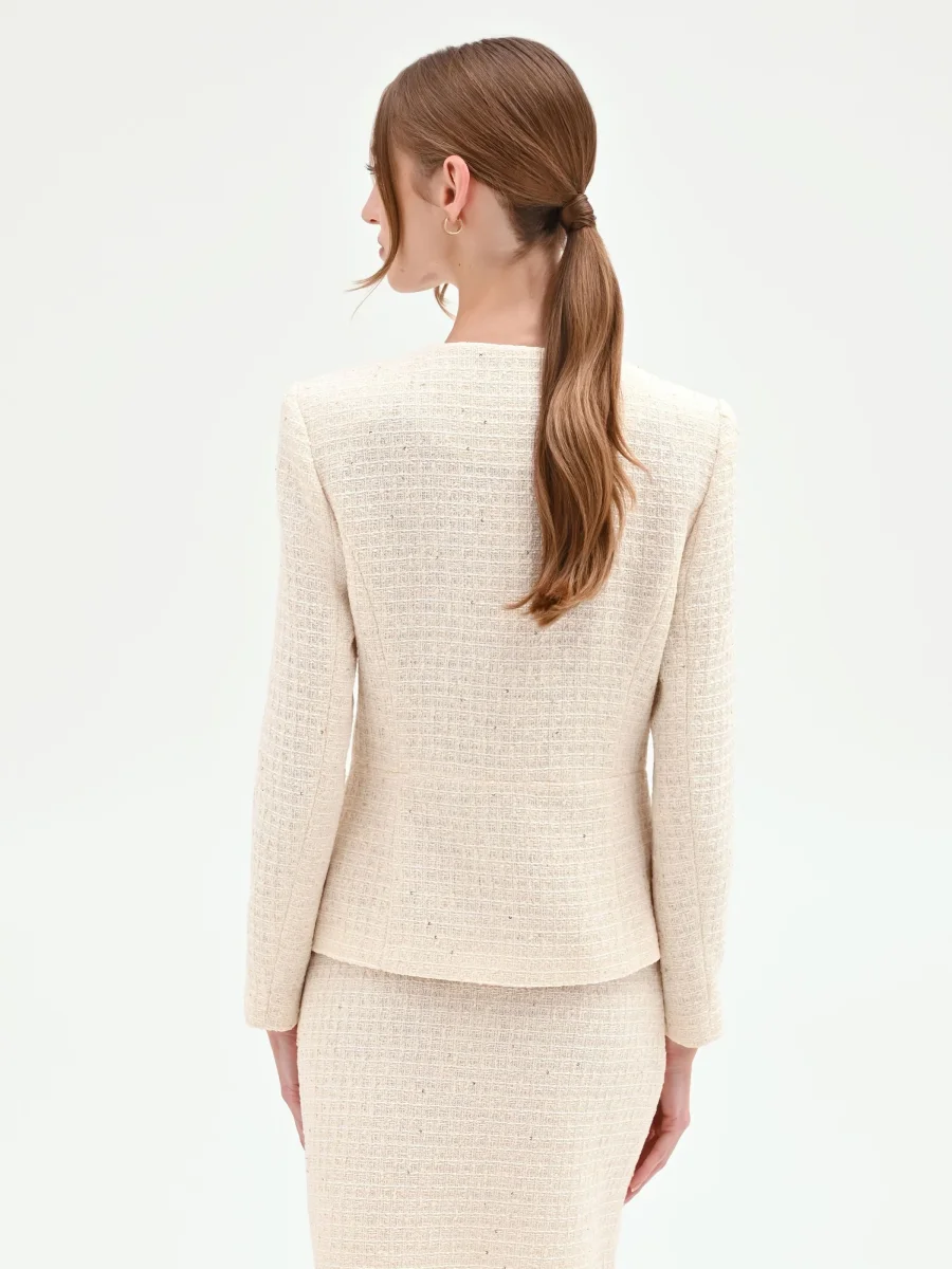 Un’interpretazione contemporanea del classico Chanel, la giacca beige chiaro ridefinisce l’eleganza quotidiana con dettagli femminili e una texture ricercata.