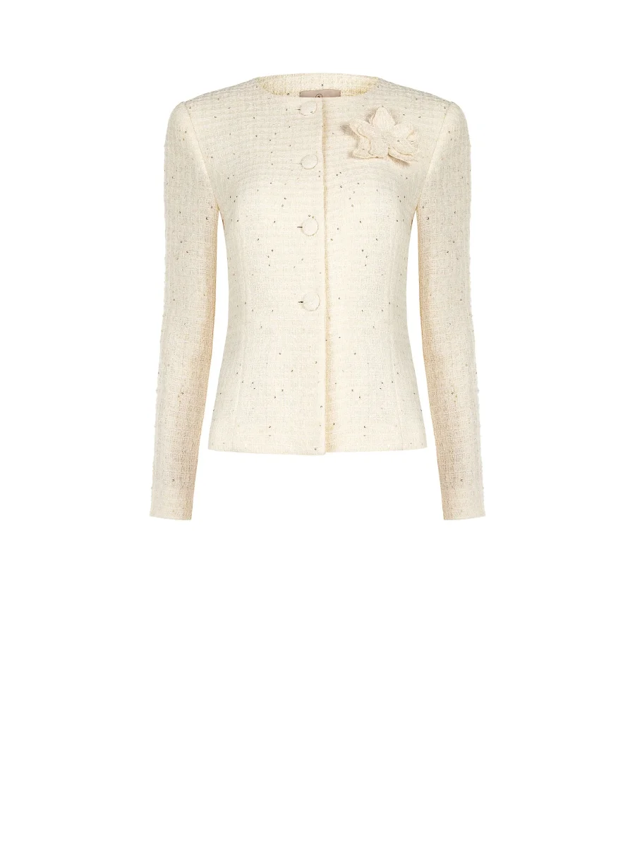 Giacca bouclé beige chiaro con fiore applicato
