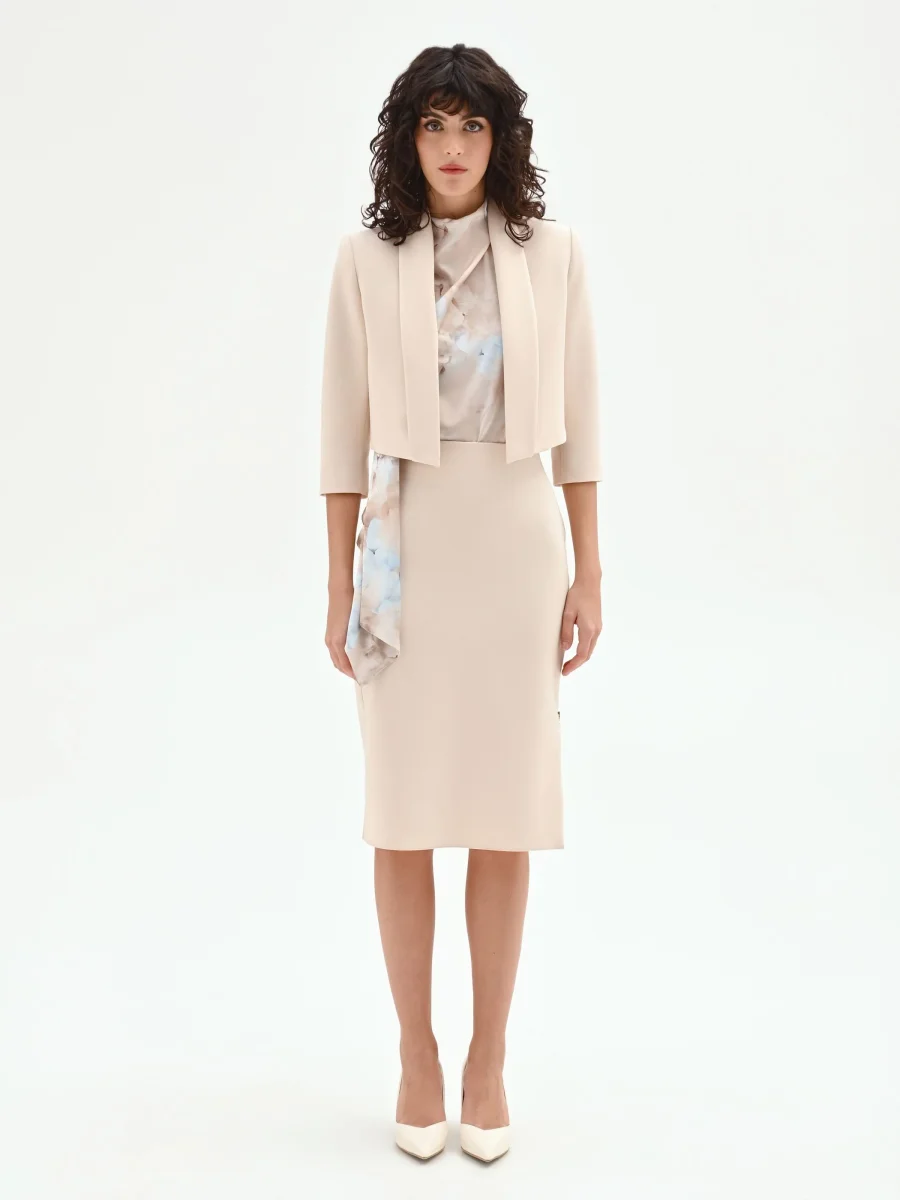 Realizzata in tessuto tecnico, presenta un design ispirato alla linea del bolero, con una vestibilità sagomata che valorizza la silhouette. Il modello è aperto sul davanti, caratterizzato da ampi revers che incorniciano la figura e da maniche a tre quarti che aggiungono un tocco di ricercata semplicità. La sua linea pulita e strutturata è studiata per fermarsi sopra il punto vita, creando un equilibrio perfetto nelle proporzioni.