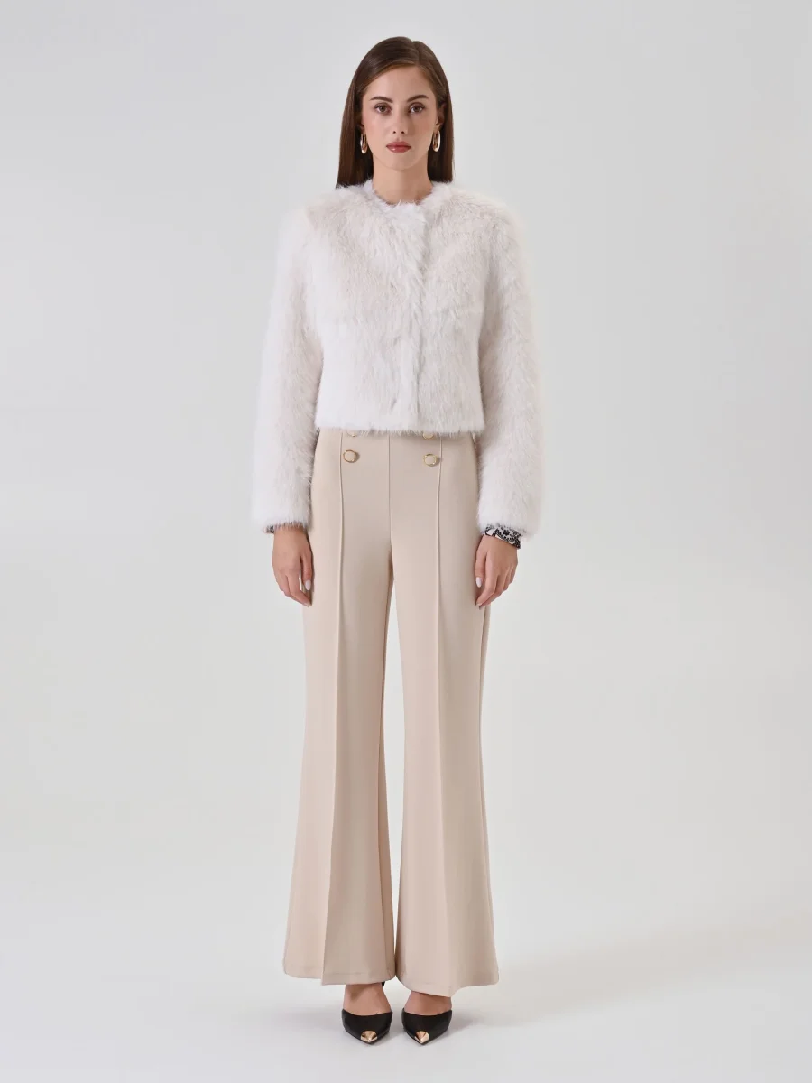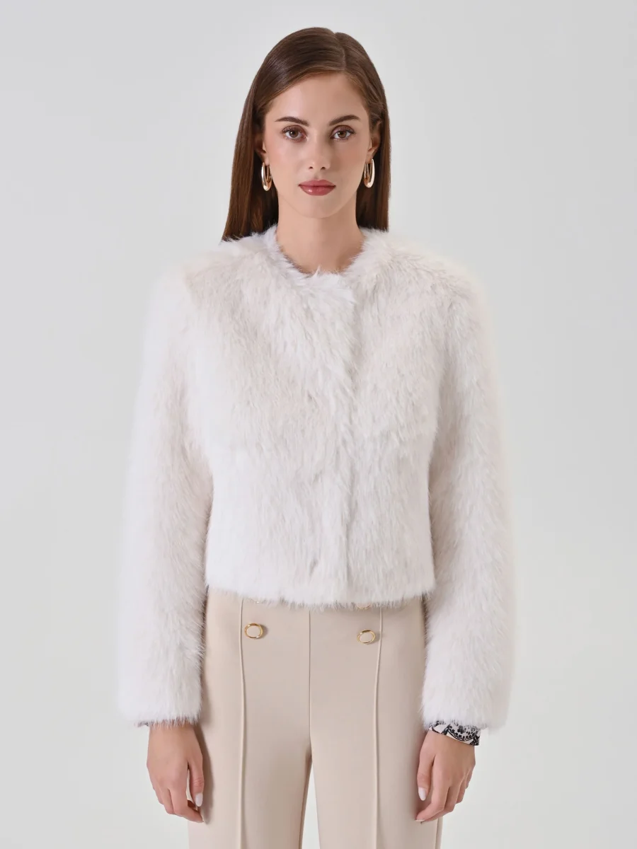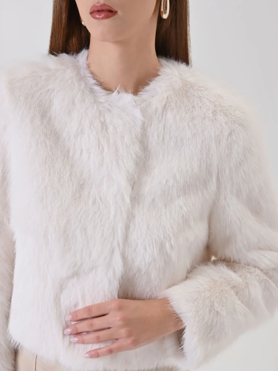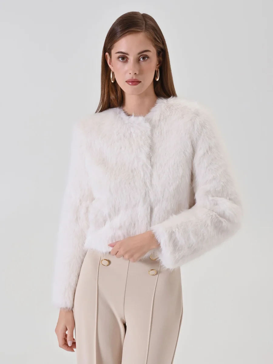 Realizzata in soffice pelliccia sintetica, questa giacca corta presenta una linea pulita dal taglio dritto, che si ferma alla vita per valorizzare la silhouette. Il design è essenziale e contemporaneo, con uno scollo rotondo e maniche lunghe che la rendono estremamente versatile. La chiusura frontale nascosta contribuisce a mantenere un’estetica minimale e raffinata, lasciando che la texture del capo sia la vera protagonista.