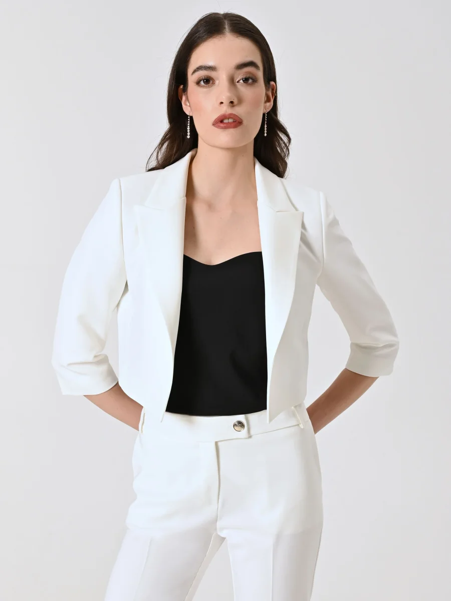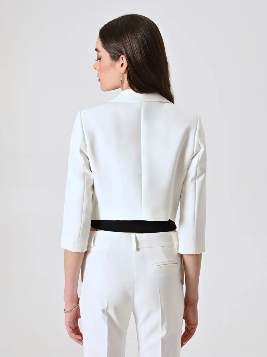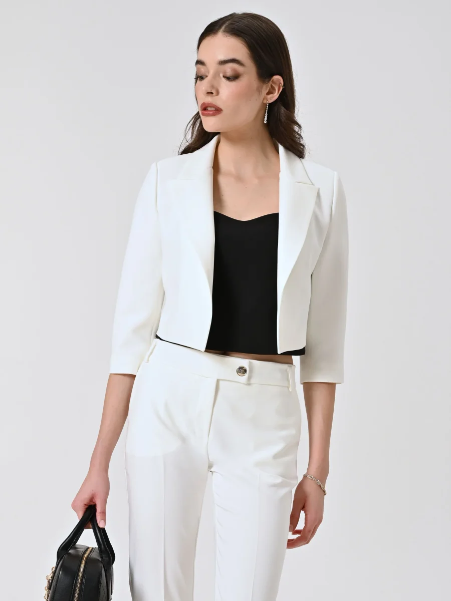 La Giacca Corta in Tessuto Tecnico è un capo elegante e versatile, pensato per valorizzare con stile sia i look formali che quelli più casual chic.