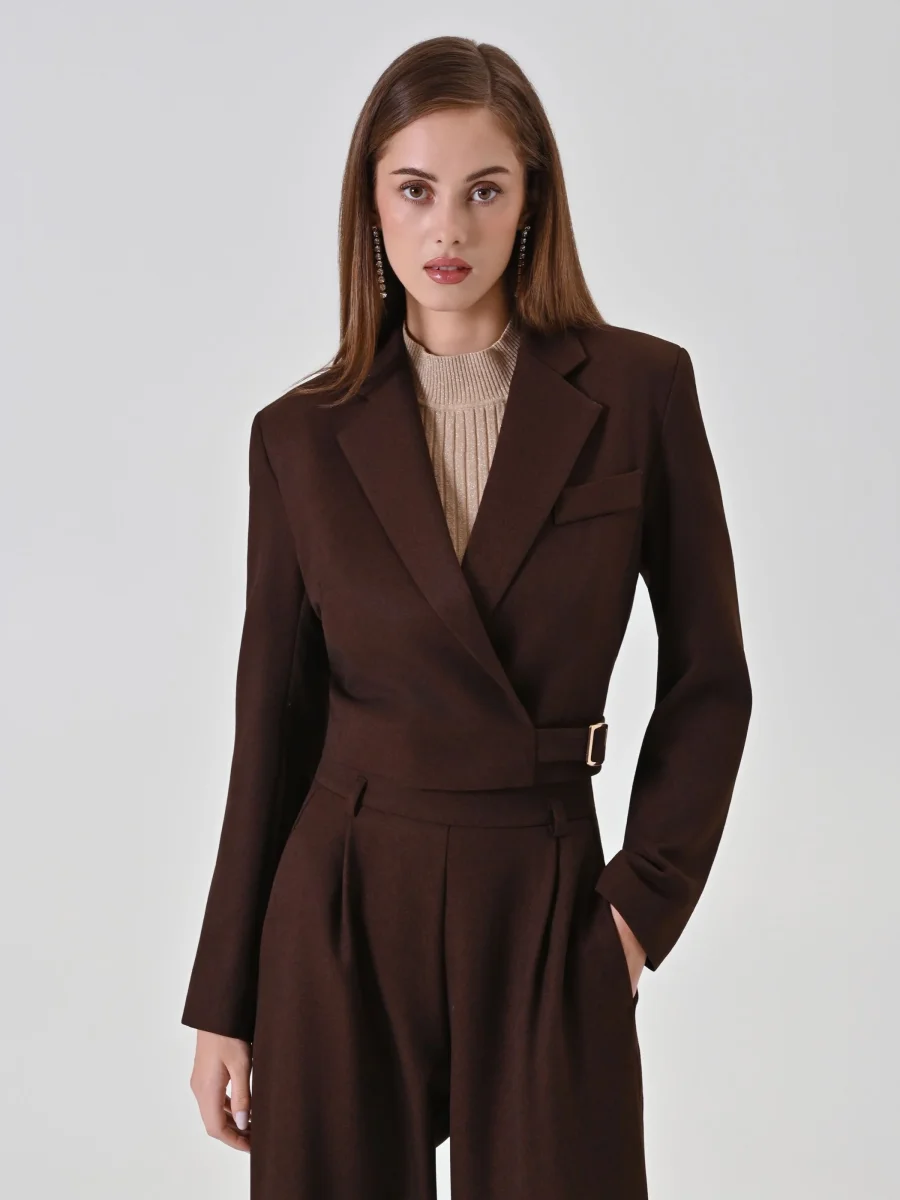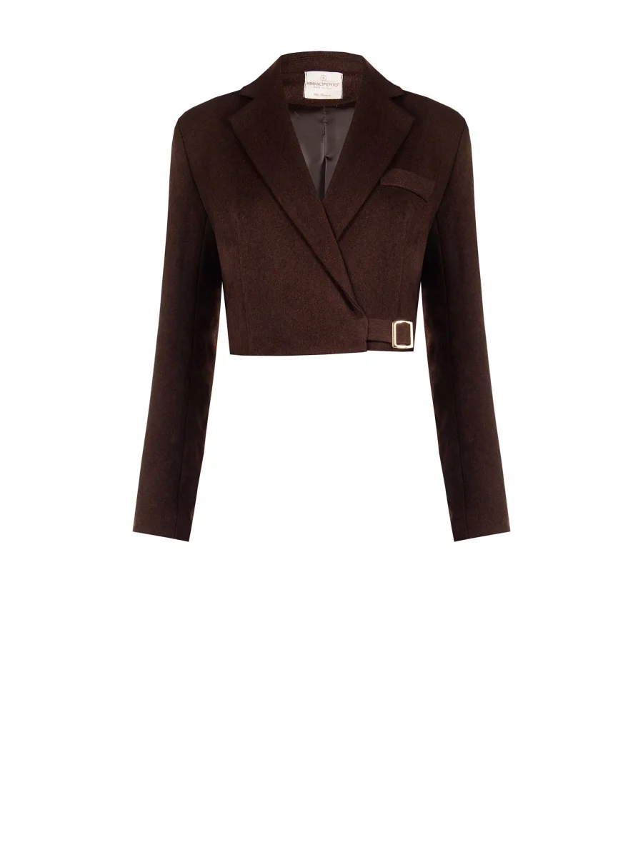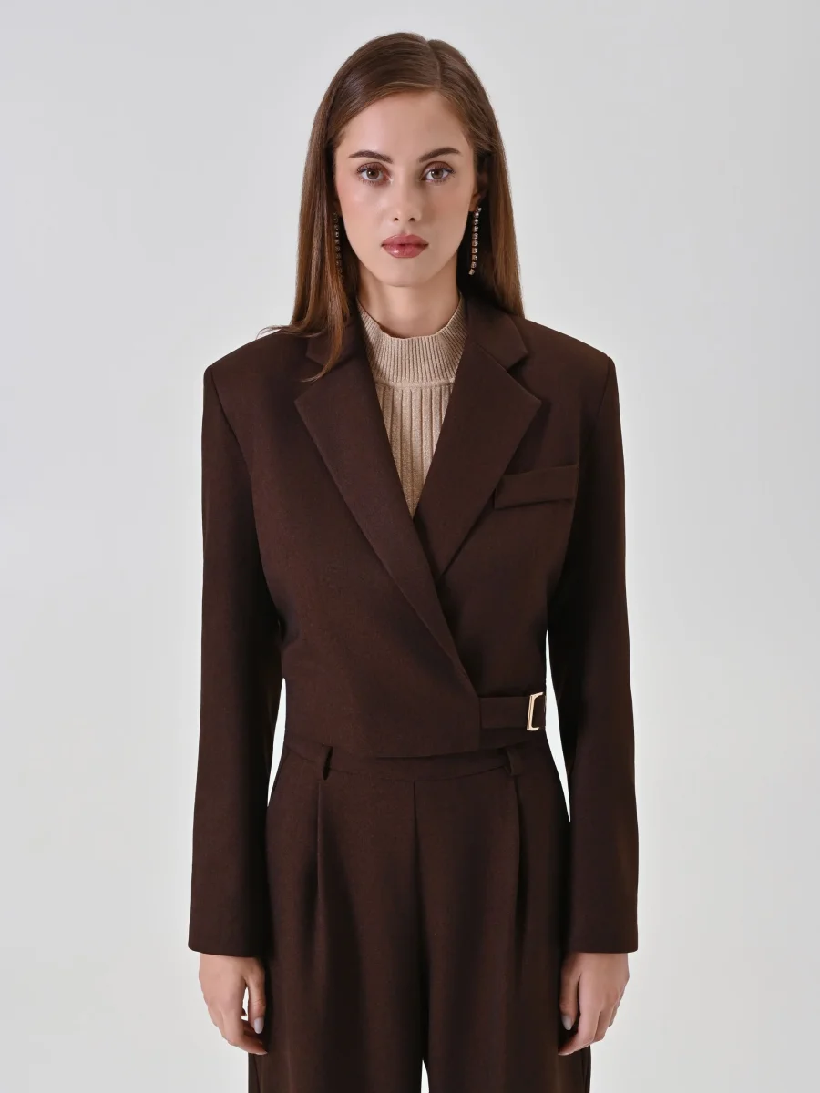 Un design essenziale che si tinge delle calde tonalità del cioccolato, pensato per la donna contemporanea che desidera definire con carattere i look quotidiani. Realizzata in un tessuto effetto frescolana, questa giacca dal taglio corto e strutturato si distingue per i suoi dettagli ricercati: lo scollo a V è incorniciato da ampi rever a lancia, mentre la chiusura asimmetrica a portafoglio è impreziosita da una fibbia metallica laterale che aggiunge un punto luce. Un taschino a filetto sul petto completa il modello con un tocco sartoriale.