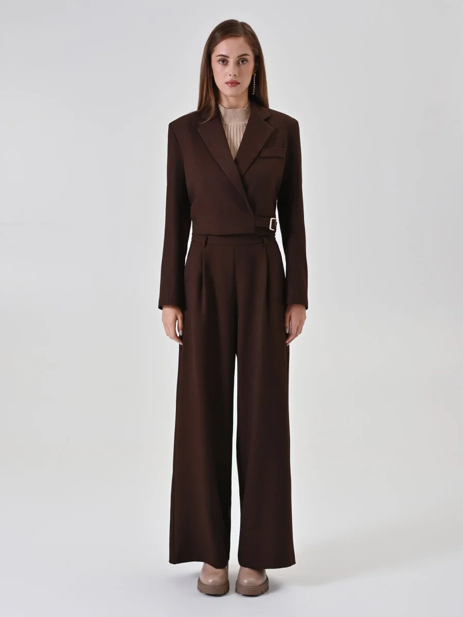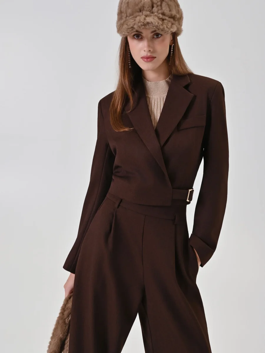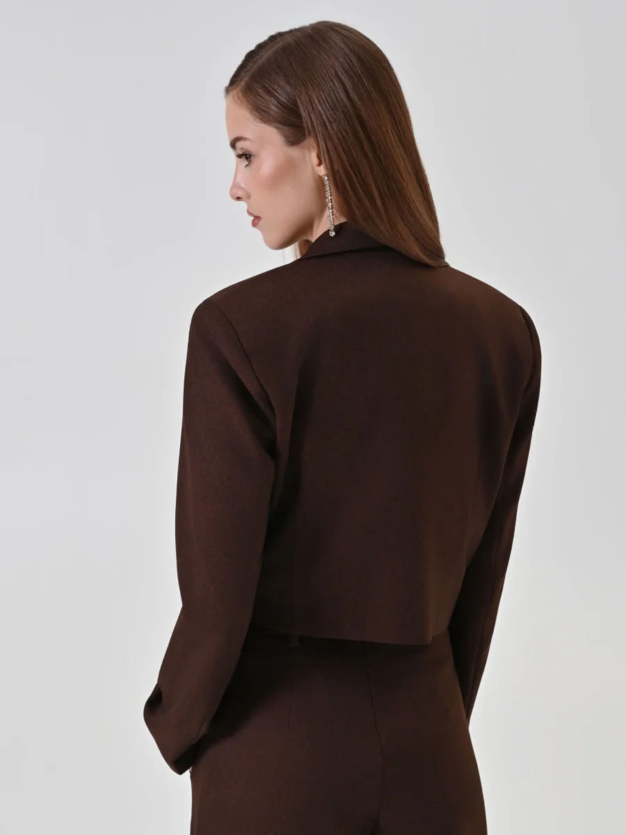 Un design essenziale che si tinge delle calde tonalità del cioccolato, pensato per la donna contemporanea che desidera definire con carattere i look quotidiani. Realizzata in un tessuto effetto frescolana, questa giacca dal taglio corto e strutturato si distingue per i suoi dettagli ricercati: lo scollo a V è incorniciato da ampi rever a lancia, mentre la chiusura asimmetrica a portafoglio è impreziosita da una fibbia metallica laterale che aggiunge un punto luce. Un taschino a filetto sul petto completa il modello con un tocco sartoriale.