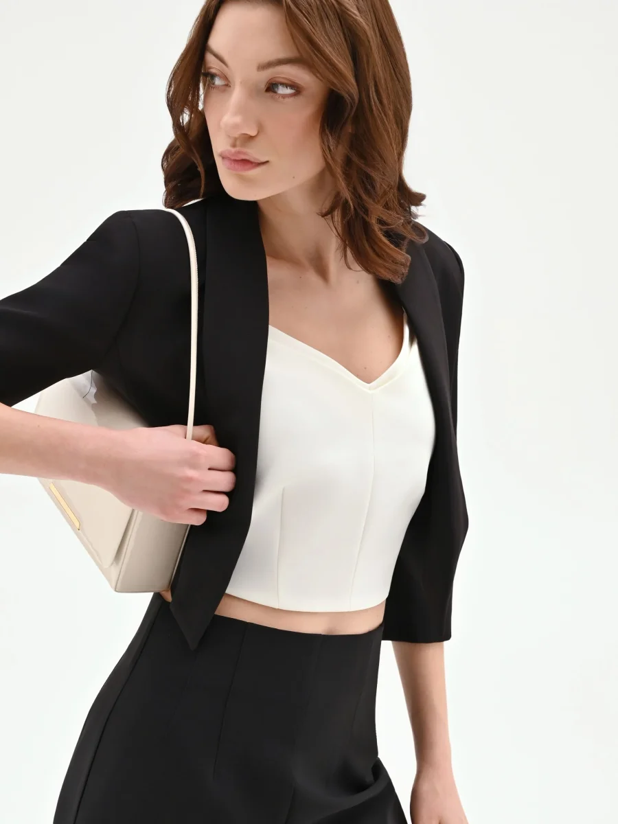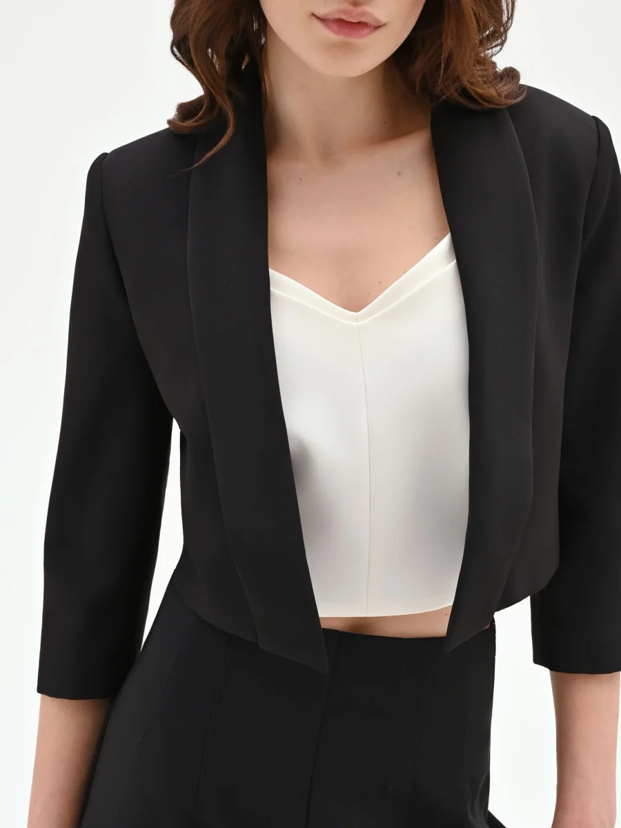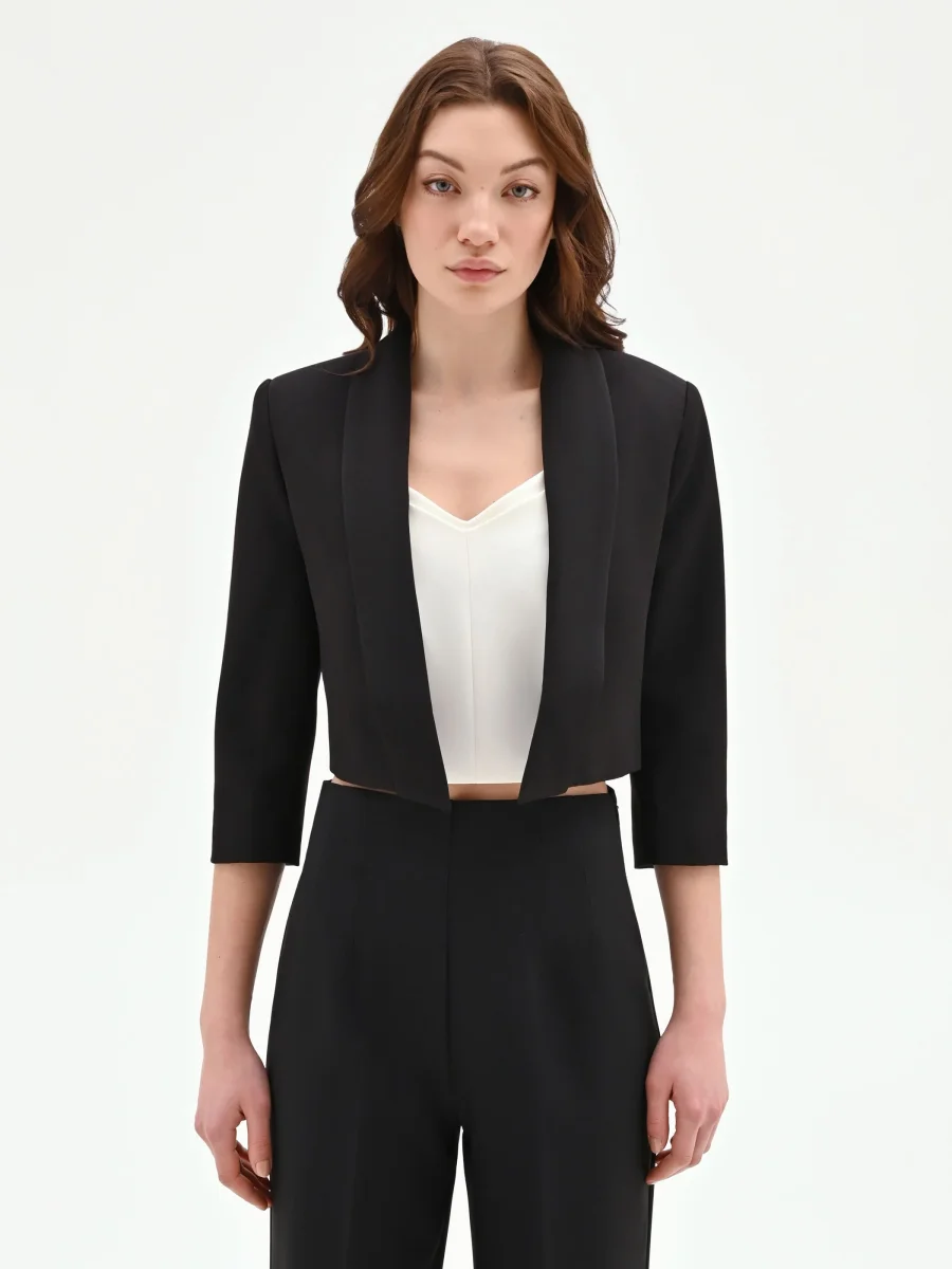 Un’interpretazione moderna e femminile di un classico del guardaroba: la giacca corta nera stile bolero è il capo chiave che completa con eleganza ogni look. La sua linea essenziale, realizzata in confortevole tessuto tecnico, è studiata per valorizzare la silhouette senza costrizioni. Il design aperto è impreziosito da un raffinato collo con revers a scialle che incornicia il décolleté, mentre le maniche a tre quarti aggiungono una nota di ricercata sobrietà. La sua lunghezza calibrata al punto vita la rende perfetta da abbinare ad abiti, gonne a vita alta o pantaloni eleganti, creando un equilibrio armonioso nelle proporzioni. Ideale per l’ufficio, indispensabile per completare un outfit da cerimonia o per un’occasione formale, questo capo versatile è la scelta giusta per la donna che cerca funzionalità e stile. Per un completo sofisticato, provala con i suoi pantaloni coordinati in tessuto tecnico.