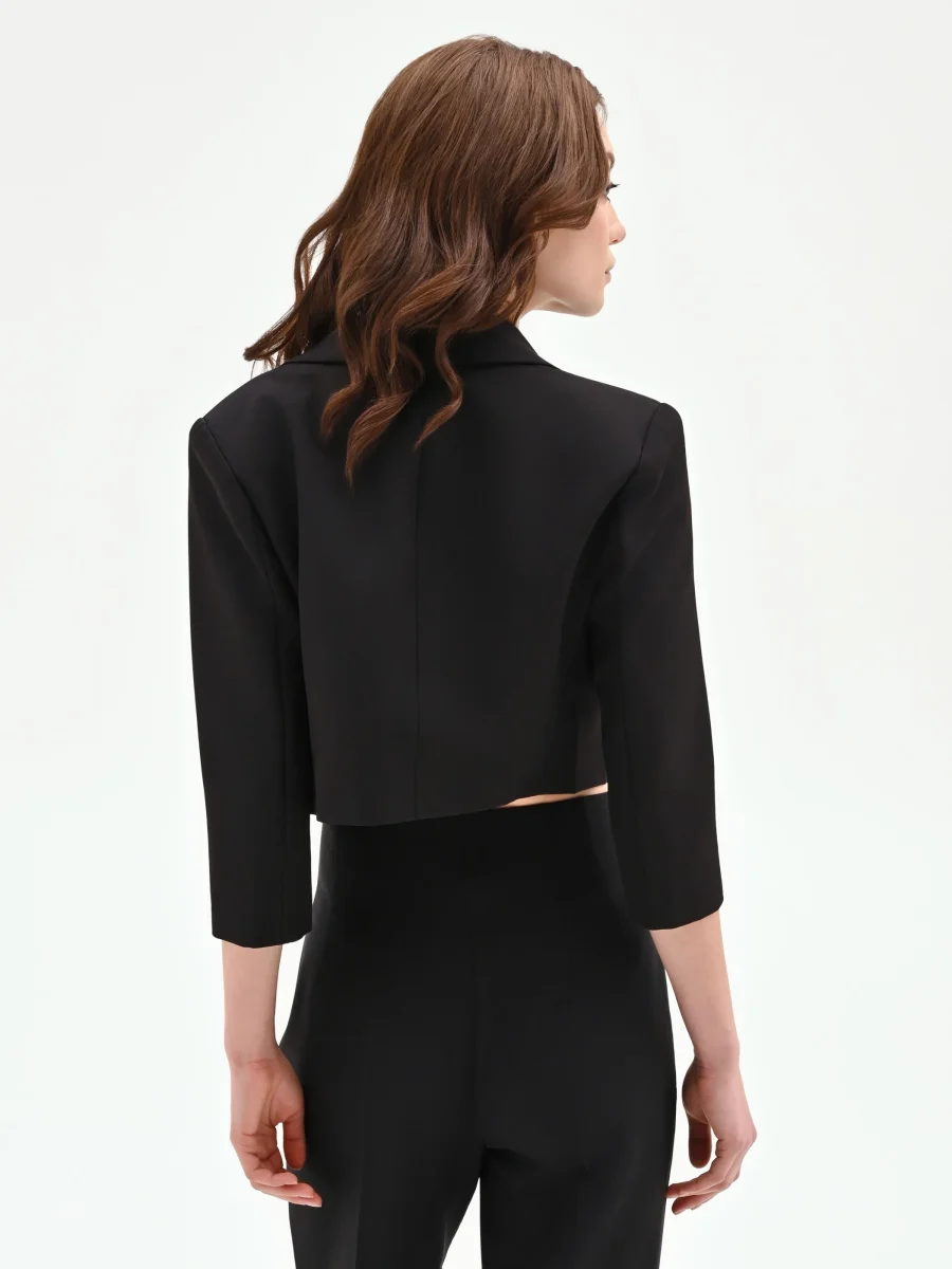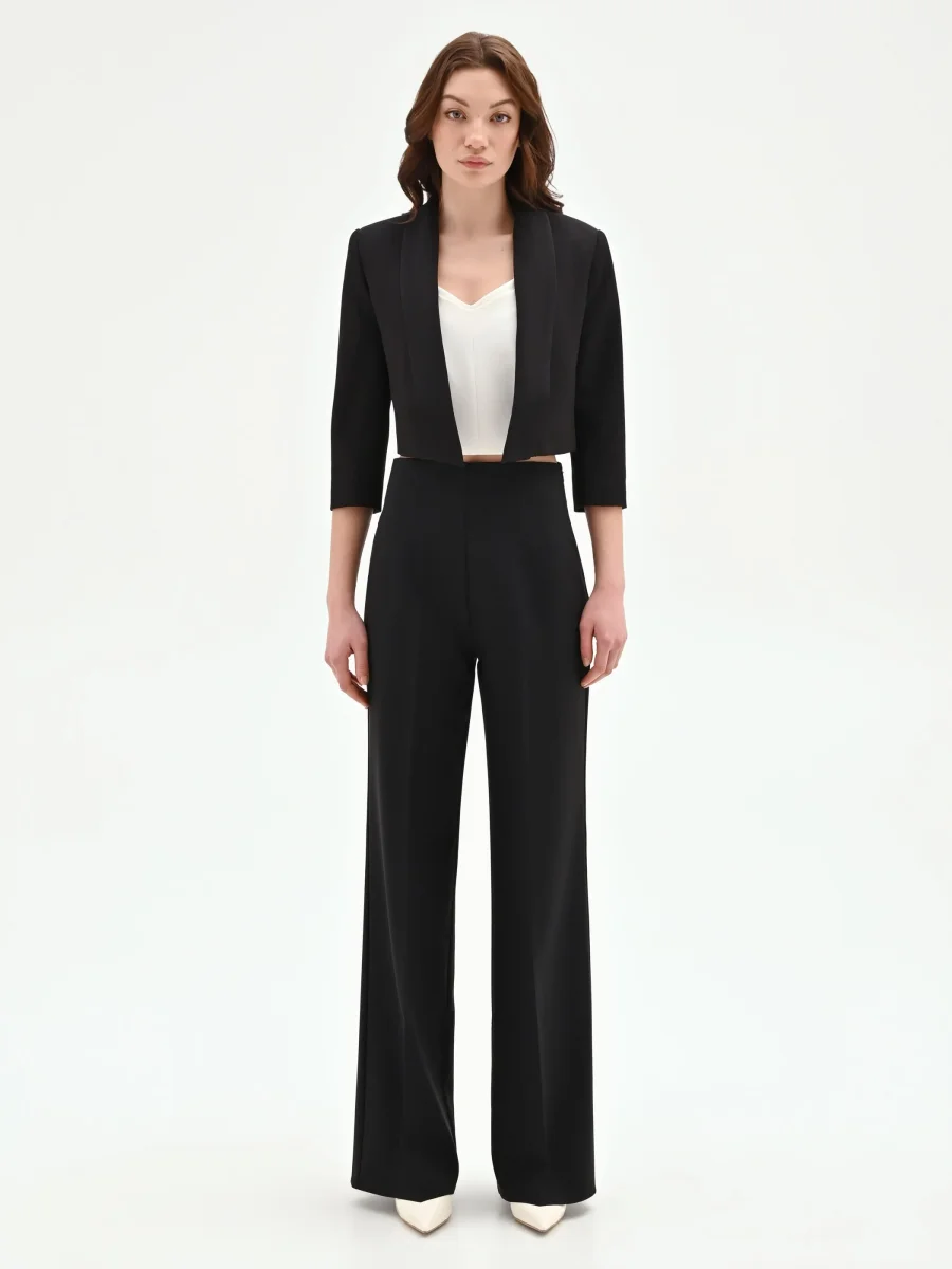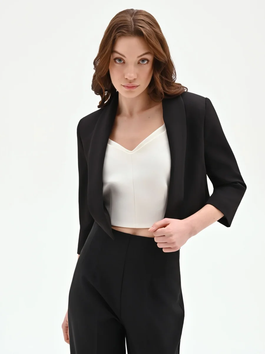 Un’interpretazione moderna e femminile di un classico del guardaroba: la giacca corta nera stile bolero è il capo chiave che completa con eleganza ogni look. La sua linea essenziale, realizzata in confortevole tessuto tecnico, è studiata per valorizzare la silhouette senza costrizioni. Il design aperto è impreziosito da un raffinato collo con revers a scialle che incornicia il décolleté, mentre le maniche a tre quarti aggiungono una nota di ricercata sobrietà. La sua lunghezza calibrata al punto vita la rende perfetta da abbinare ad abiti, gonne a vita alta o pantaloni eleganti, creando un equilibrio armonioso nelle proporzioni. Ideale per l’ufficio, indispensabile per completare un outfit da cerimonia o per un’occasione formale, questo capo versatile è la scelta giusta per la donna che cerca funzionalità e stile. Per un completo sofisticato, provala con i suoi pantaloni coordinati in tessuto tecnico.
