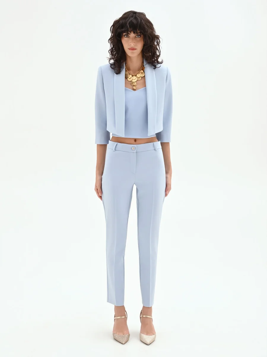 Una nota di colore delicata e una linea definita si incontrano nella giacca cielo azzurro, il capo chiave per dare un tocco di freschezza ai look primaverili. Realizzata in confortevole tessuto tecnico, si distingue per il suo taglio cropped che slancia la figura, fermandosi elegantemente sopra il punto vita. La sua costruzione è pulita e moderna, caratterizzata da maniche a tre quarti e rever classici che incorniciano con grazia il décolleté. Il design è pensato per essere indossato aperto, creando una linea fluida e versatile che si adatta a molteplici silhouette e stili. Questo capo si rivela un vero passe-partout del guardaroba: è perfetto per completare un abito elegante per una cerimonia, per dare un tocco formale a un look da ufficio o per elevare un outfit più informale. La sua tonalità luminosa la rende ideale per gli eventi della bella stagione. Per un total look sofisticato e di sicuro impatto, abbinala al pantalone coordinato (CFC0127970003B076) e alla canotta (CFC0127868003B076) per creare un tailleur contemporaneo e femminile.