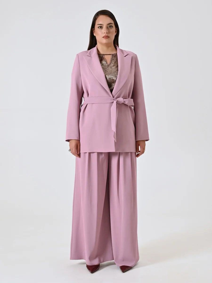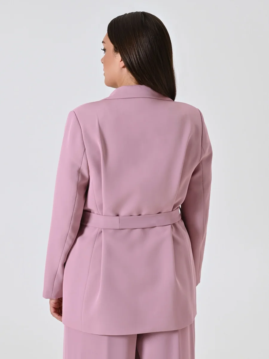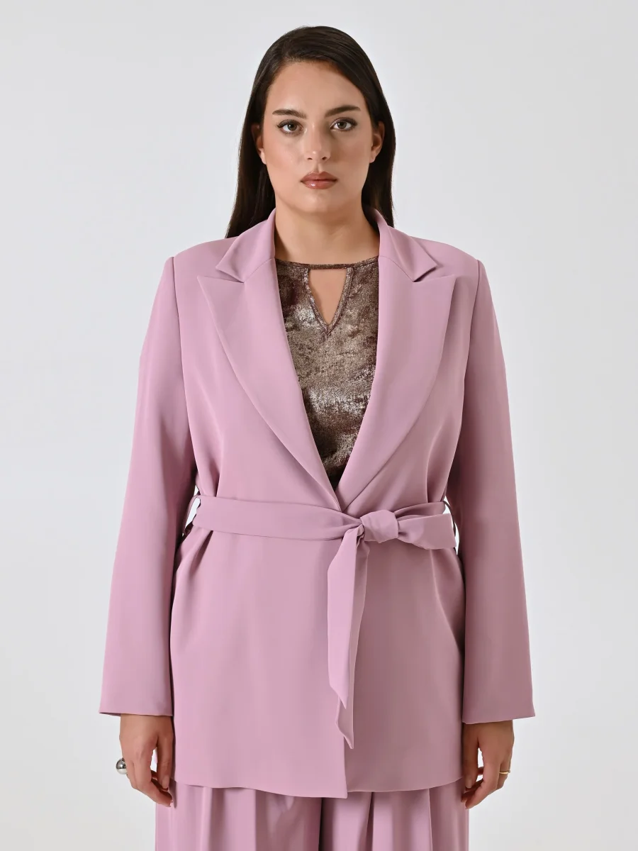 Elegante e versatile, la giacca vestaglia in cadi fluido è la scelta perfetta per completare look raffinati con un tocco moderno. Caratterizzata da una linea scivolata e senza bottoni, si chiude con cintura in tessuto removibile, con passanti, da annodare in vita per valorizzare la silhouette. Il tessuto fluido e la nuance rosa malva donano al capo un’eleganza femminile e disinvolta. Indossala in coordinato i pantaloni per un total look curvy sofisticato e armonioso, ideale per cerimonie, eventi o occasioni speciali.