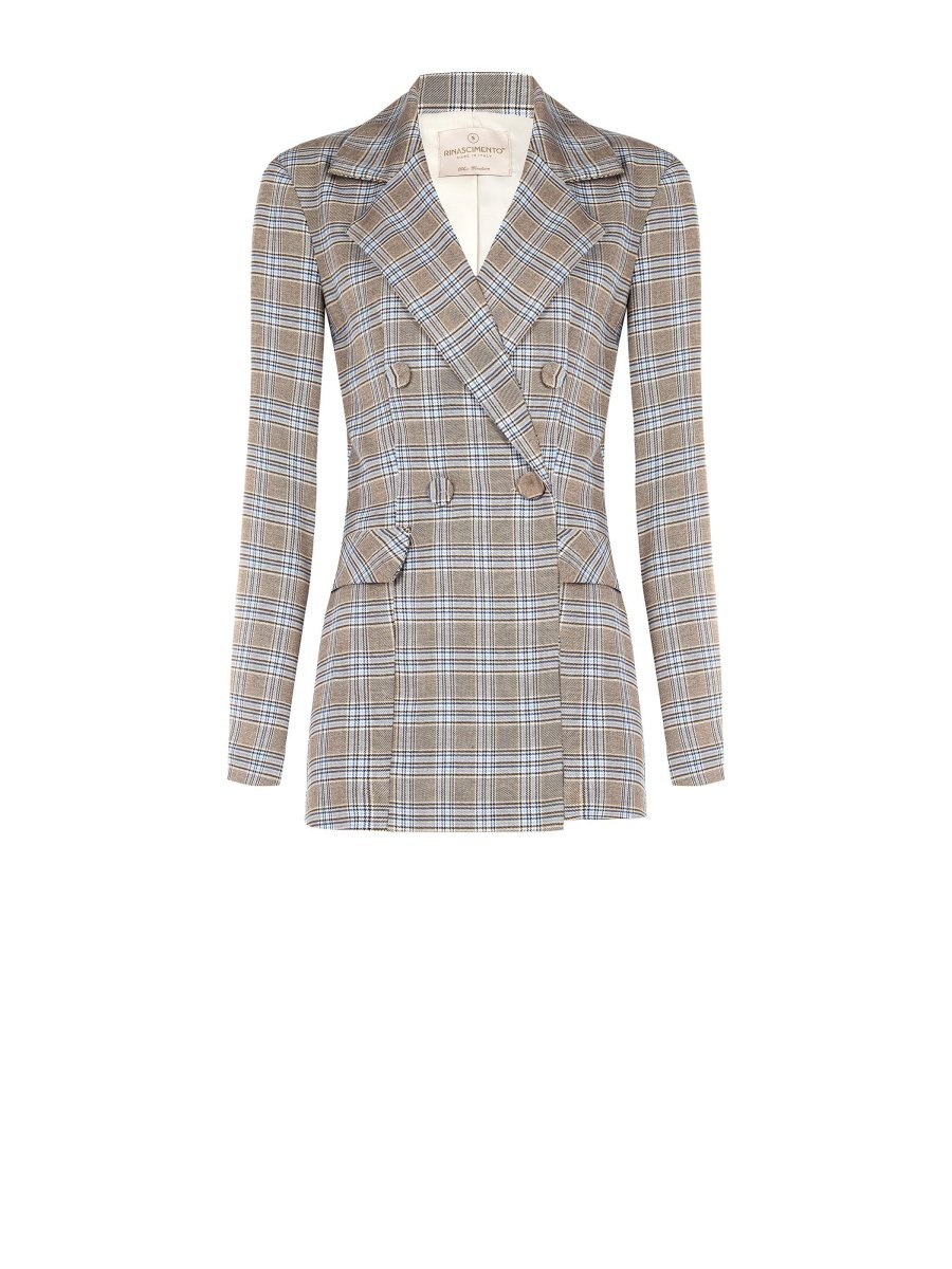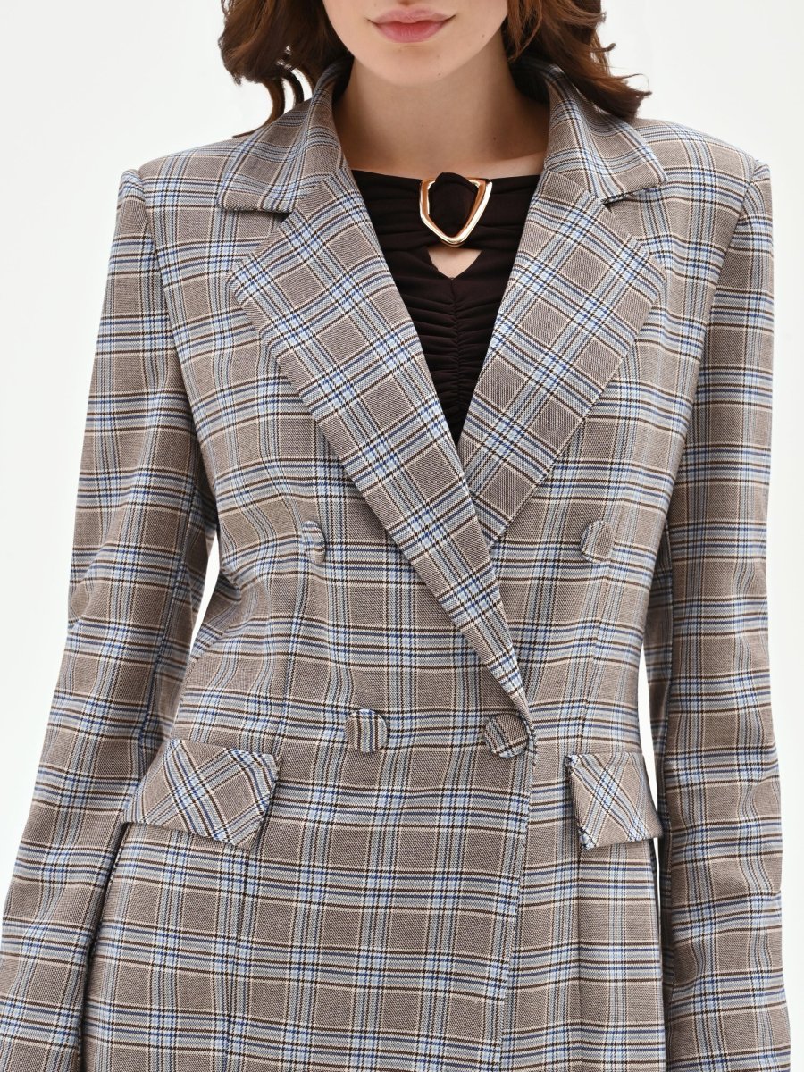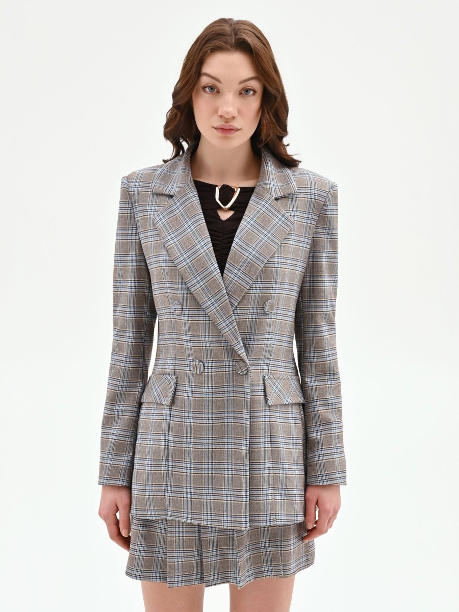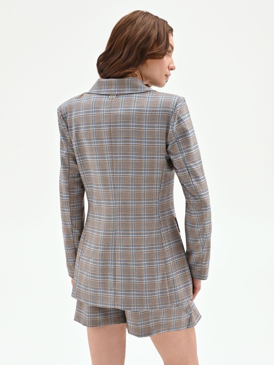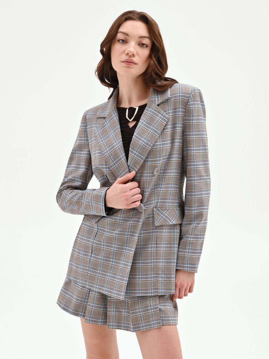 Realizzata in un tessuto con motivo check, la giacca presenta una fantasia intramontabile in cui le tonalità neutre del grigio e del marrone sono illuminate da raffinati tocchi di azzurro, creando una palette versatile per la stagione. Il modello ha una linea strutturata che valorizza la figura, con spalle definite, collo con revers a lancia e una chiusura doppiopetto con eleganti bottoni ricoperti che aggiungono un dettaglio curato. Completano il design le due tasche con pattina sul davanti.