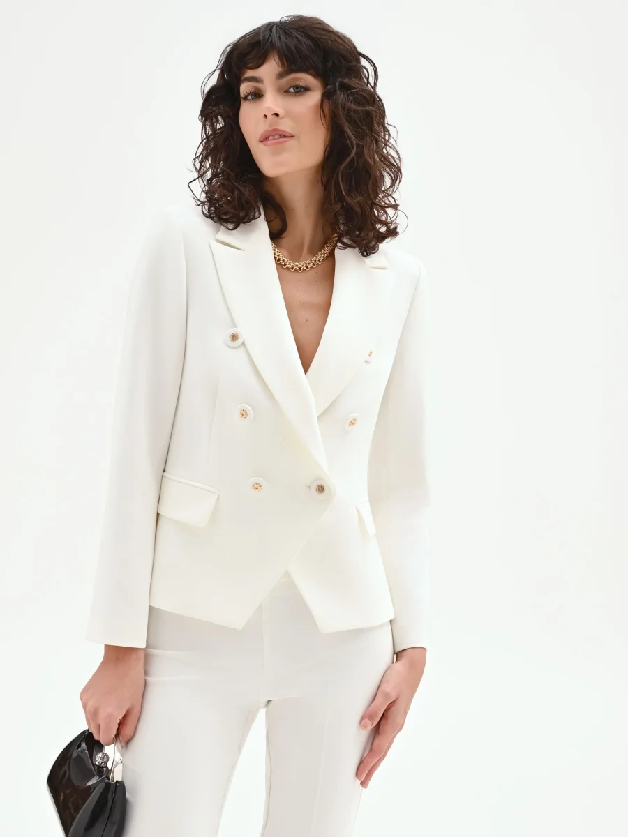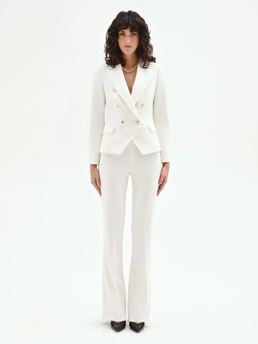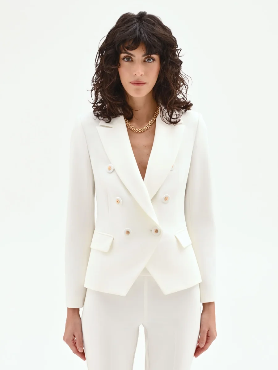 Linee decise e una silhouette femminile si incontrano nella giacca doppiopetto bianca, un capo essenziale che ridefinisce il concetto di eleganza funzionale.
