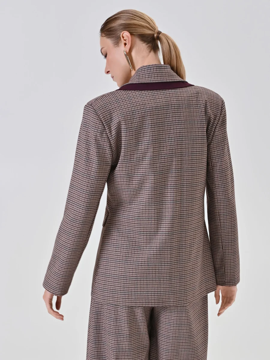 Realizzata in un tessuto dal motivo check, questa giacca presenta una linea dritta che valorizza la silhouette. Il design è reso unico dal rever a lancia, impreziosito da un elegante inserto a contrasto color bordeaux che prosegue sul colletto. La chiusura con bottoni a vista, in tinta con l’inserto, e le tasche frontali con pattina completano il modello.