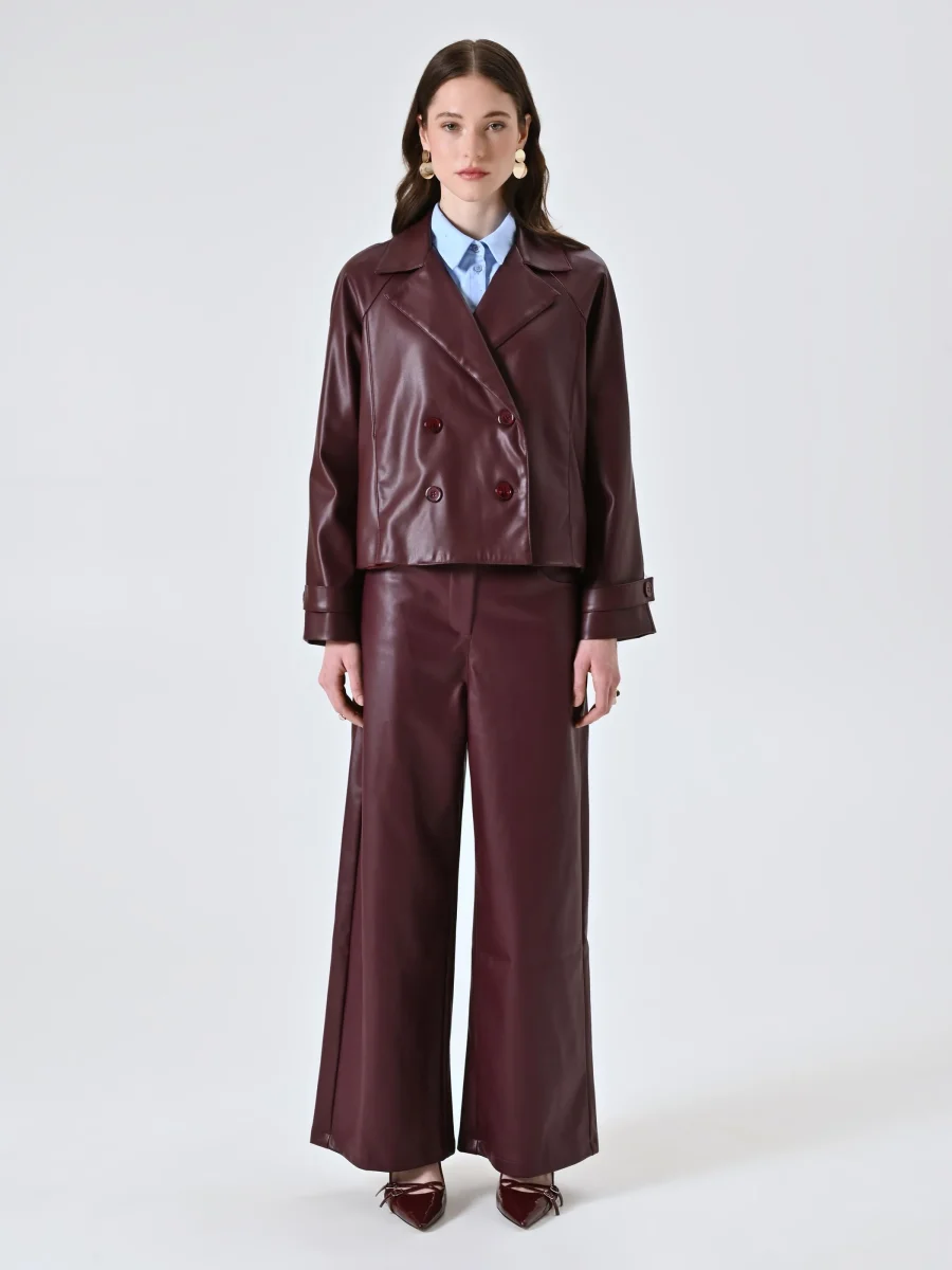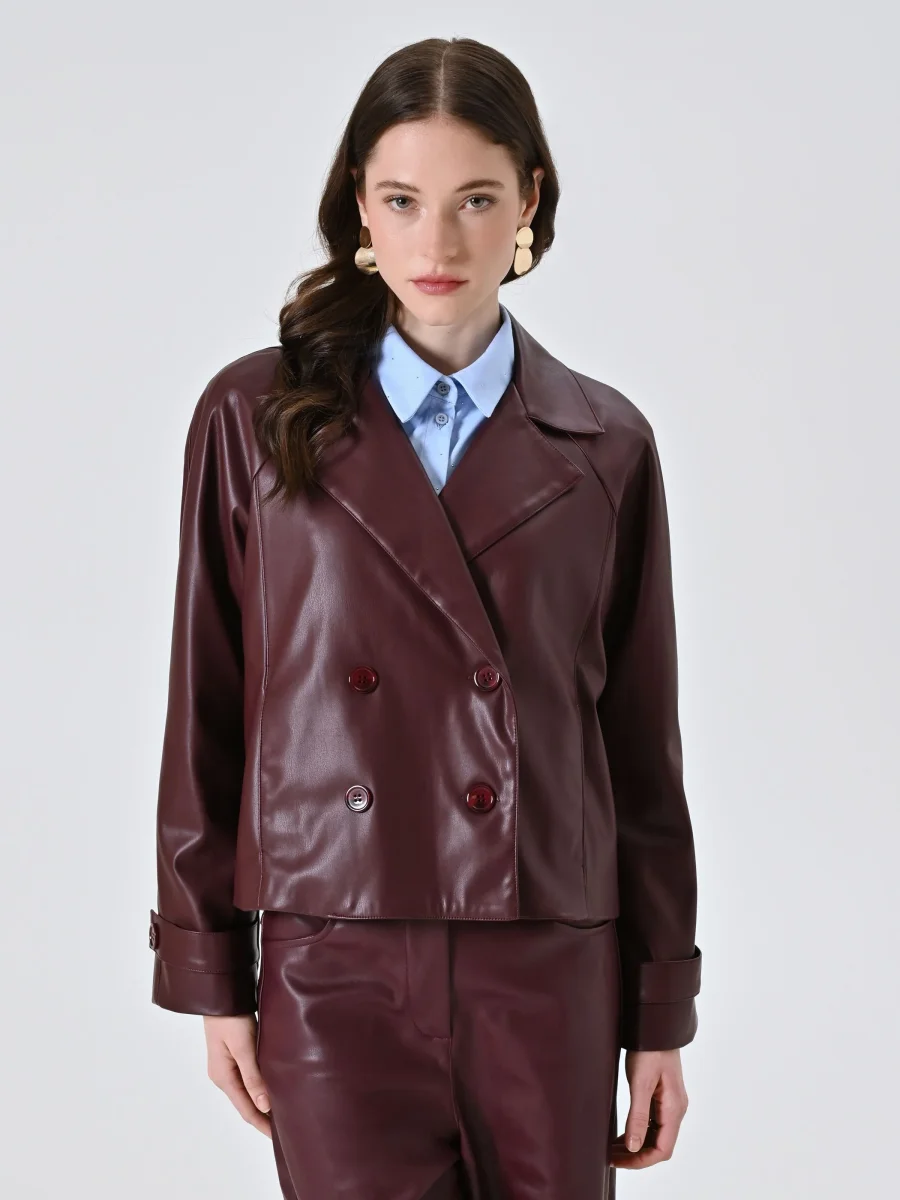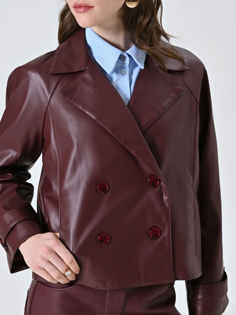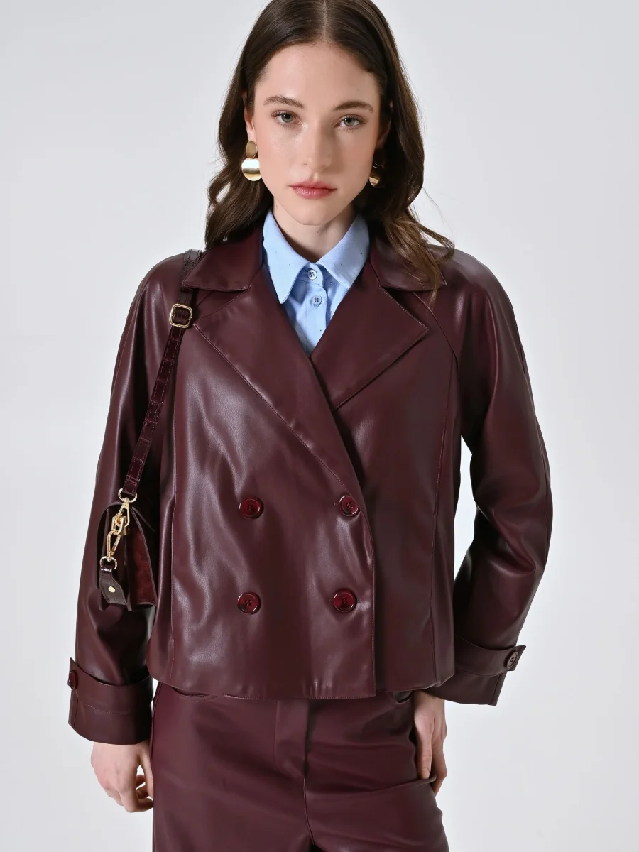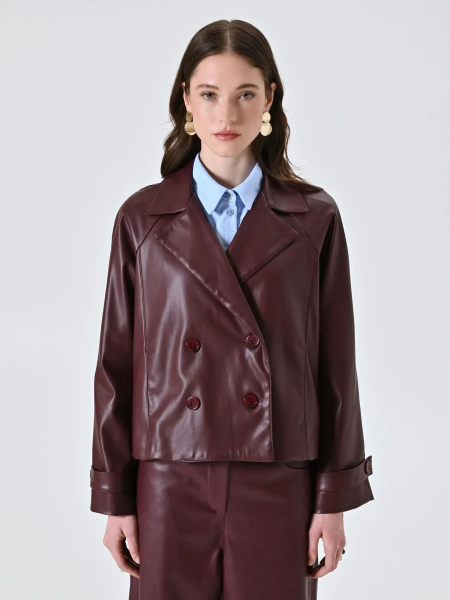 Realizzata in simil pelle bordeaux, questa giacca presenta un design doppiopetto con rever classico, maniche con cinturino e bottoni tono su tono, per un look urbano e raffinato. La lunghezza cropped valorizza la silhouette e rende il capo facile da abbinare a pantaloni a vita alta o gonne midi.