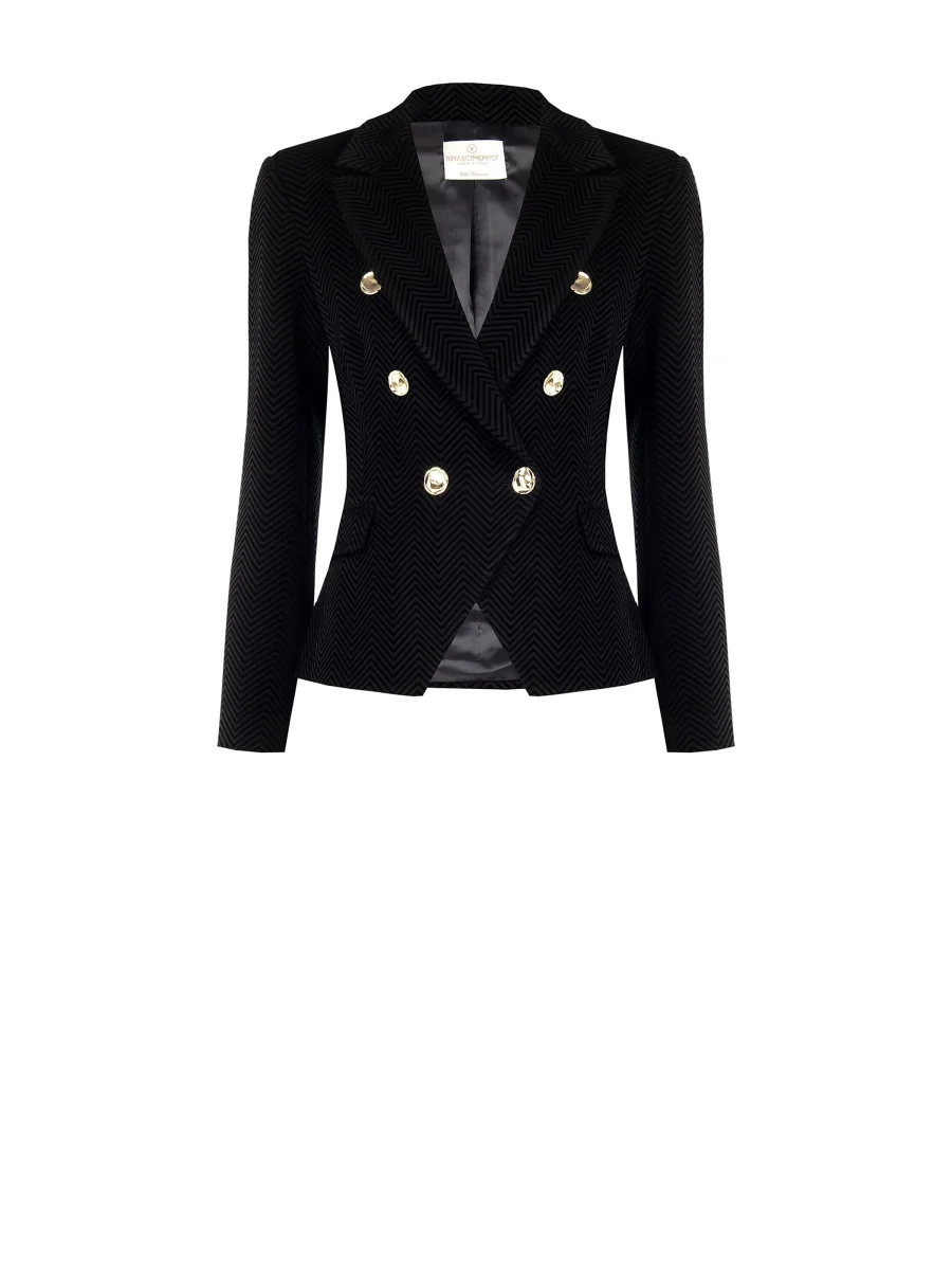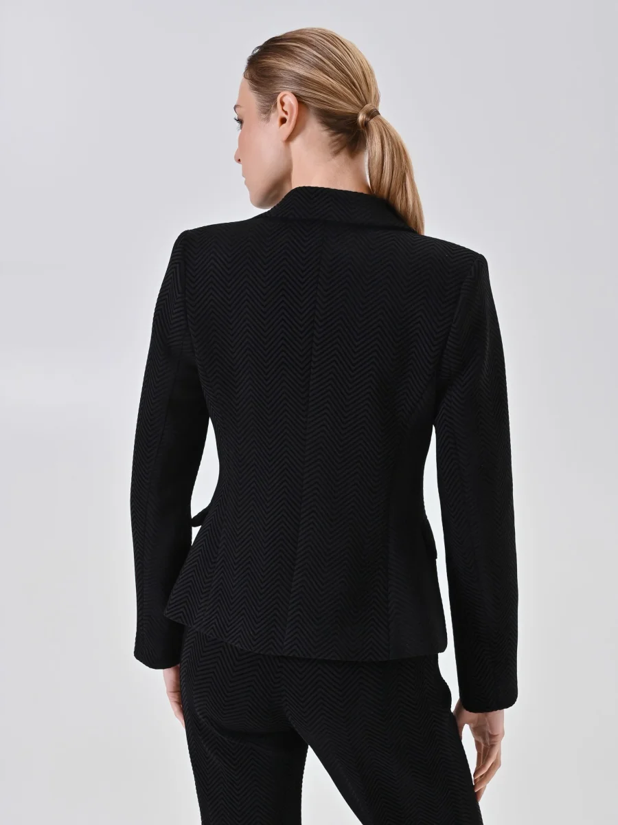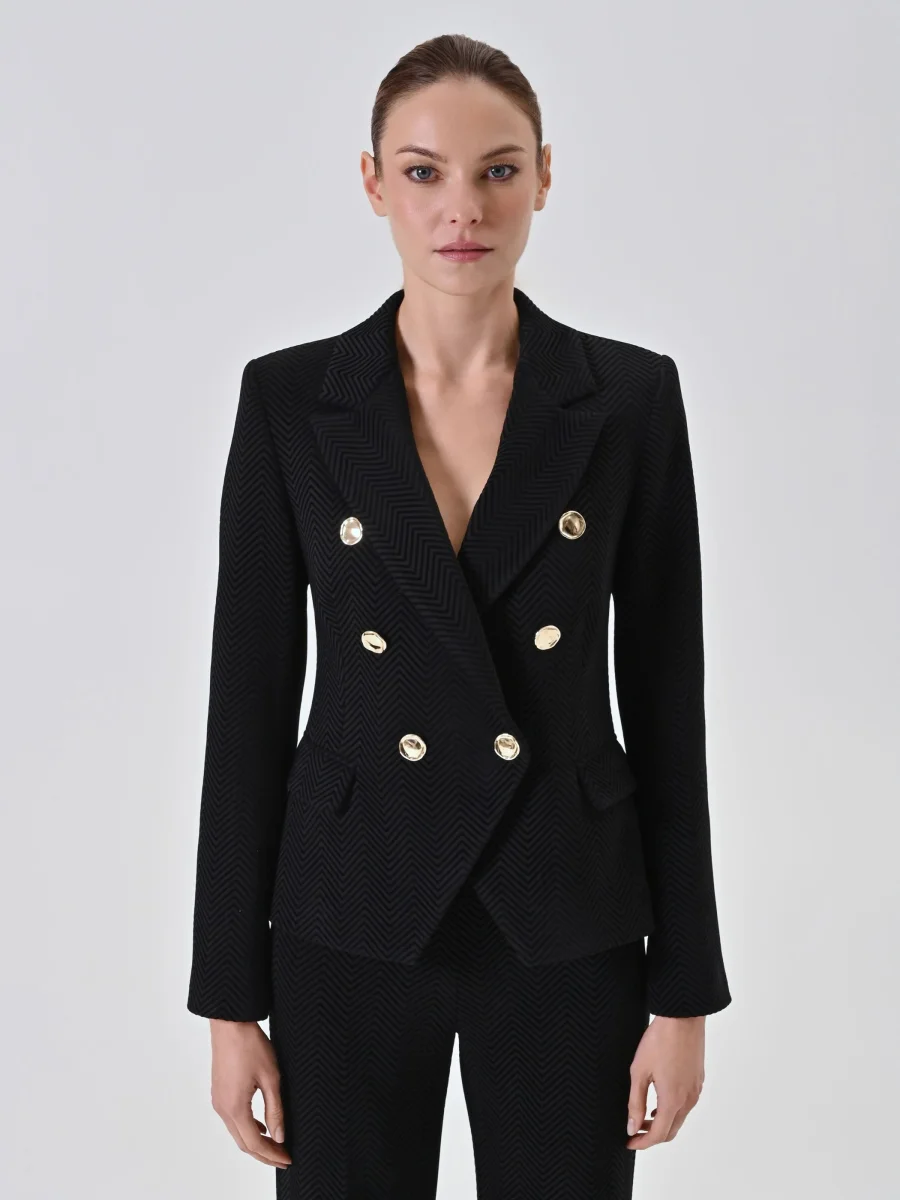 La sua unicità risiede nel prezioso tessuto floccato, che crea un sofisticato motivo chevron tono su tono, piacevole al tatto e d’impatto visivo. Il design è studiato per esaltare la silhouette: il taglio sfiancato segue le forme del corpo, mentre gli ampi revers a lancia e la chiusura con sei bottoni metallici dorati definiscono una linea sartoriale impeccabile. Le tasche a filetto con patta completano la costruzione con un tocco formale.