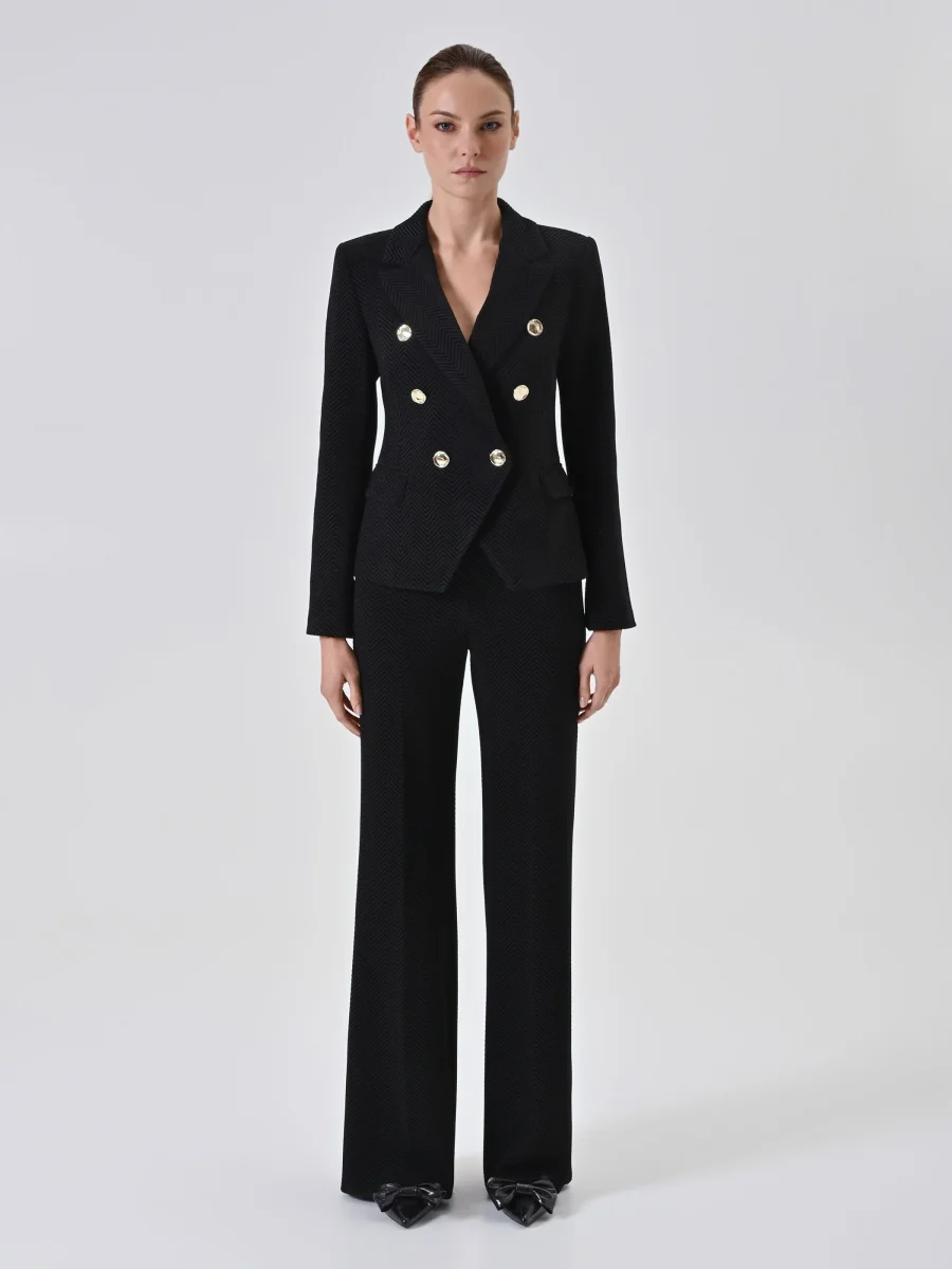 L’eleganza si veste di carattere con questa giacca doppiopetto nera, un capo statement che cattura l’essenza di una femminilità decisa e glamour.