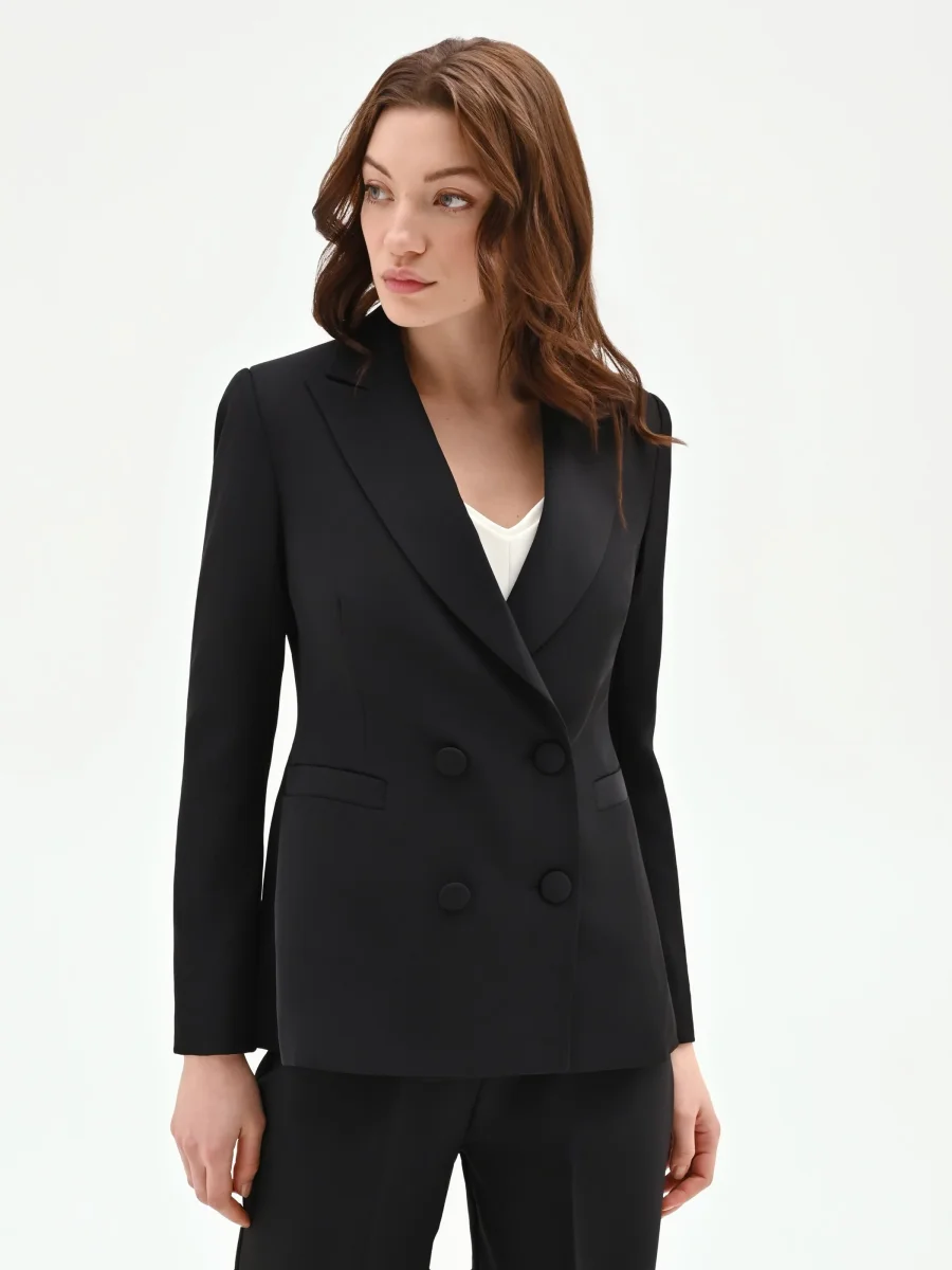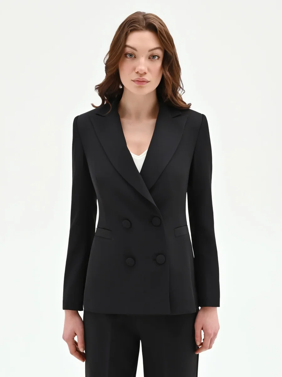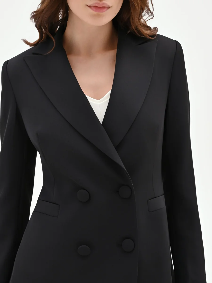 Realizzata in tessuto cadi fluido, la sua linea sciancrata è studiata per seguire e valorizzare la silhouette, definendo con grazia il punto vita. Il design è impreziosito dai revers a lancia con una finitura delicatamente lucida, un dettaglio che cattura la luce e conferisce raffinatezza. Le spalle strutturate disegnano una figura decisa, mentre le tasche a filetto con pattina e la chiusura con quattro bottoni ricoperti tono su tono completano il modello con discrezione.
