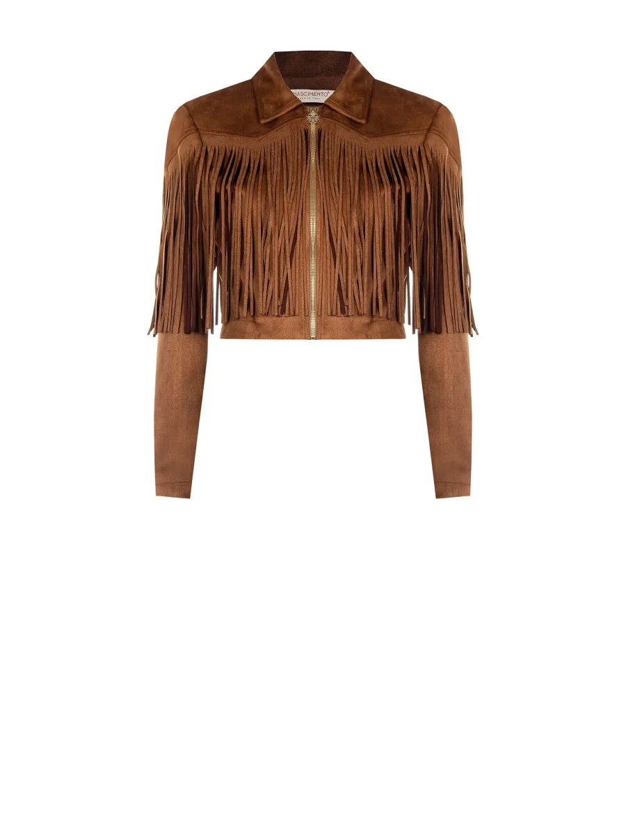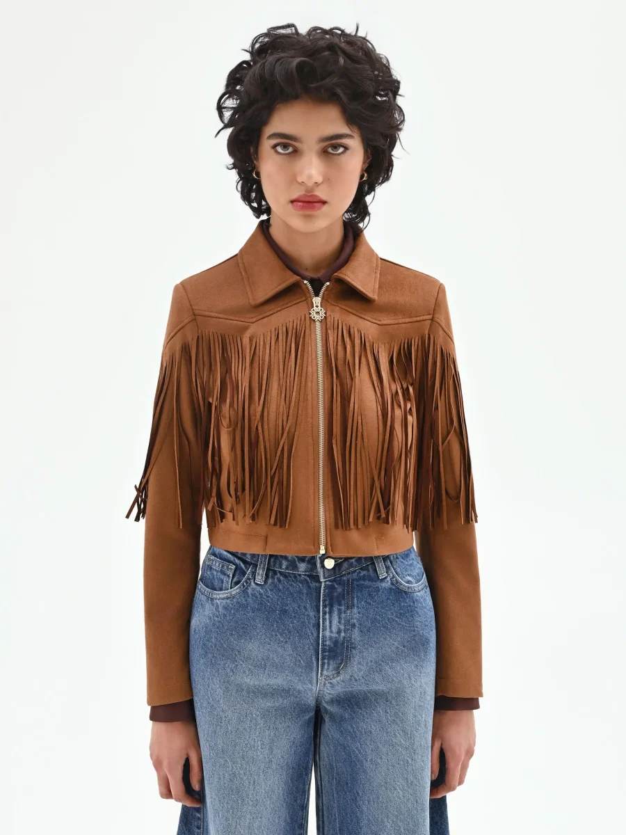 Lo spirito western si fonde con un’allure contemporanea nella giacca corta color cammello beige, un capo dal carattere deciso pensato per reinventare i look per il tempo libero e le occasioni informali. Realizzata in un morbido tessuto effetto camoscio, piacevole al tatto, questa giacca si distingue per il suo design dinamico e ricco di dettagli. La silhouette corta e grintosa è definita dal classico colletto a punta e dalla pratica chiusura frontale con zip metallica a vista, che aggiunge un tocco luminoso al capo. Le vere protagoniste sono le lunghe frange, applicate con cura sul carré e lungo le maniche, che danzano a ogni movimento creando un effetto scenografico e di tendenza. Il taglio cropped è studiato per valorizzare il punto vita, rendendola ideale da abbinare a pantaloni e gonne a vita alta. Indossala su un look total black per farla risaltare, oppure con un abito stampato per un mix&match di ispirazione folk-chic. È il capo perfetto per chi non vuole rinunciare a uno stile unico e personale nella quotidianità.