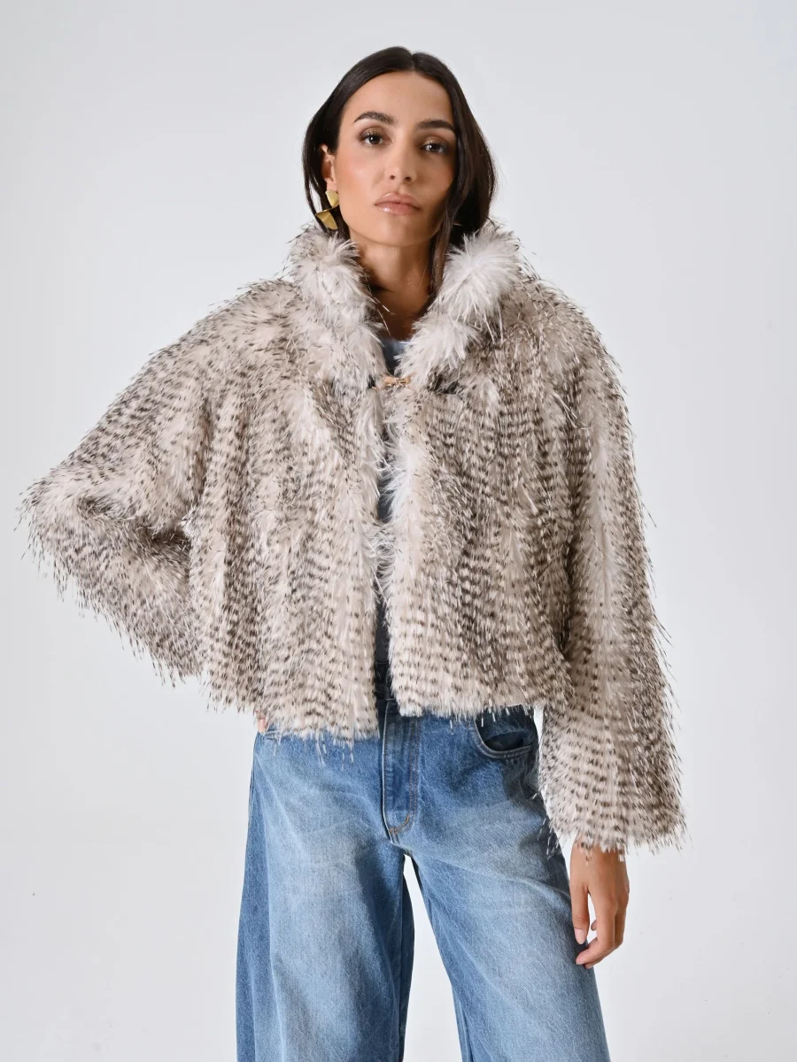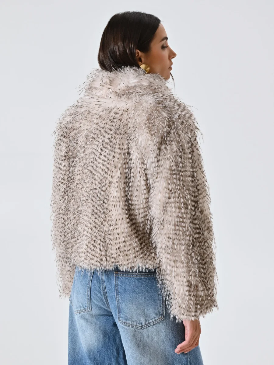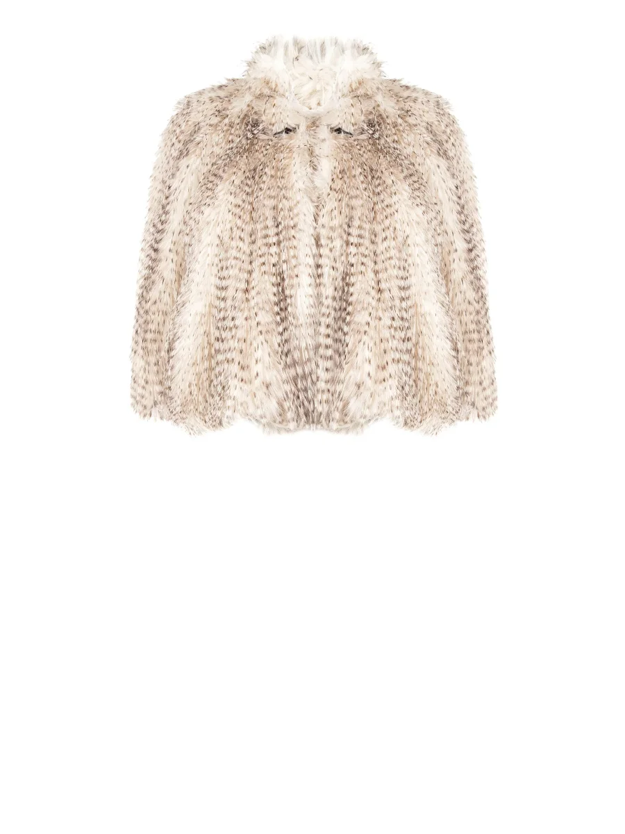 Realizzata in morbido tessuto sintetico effetto pelliccia, la Giacca effetto pelliccia si distingue per il pattern animalier nei toni naturali, l’effetto piumato e la chiusura con fiocco al collo, che esalta il design corto e raffinato.