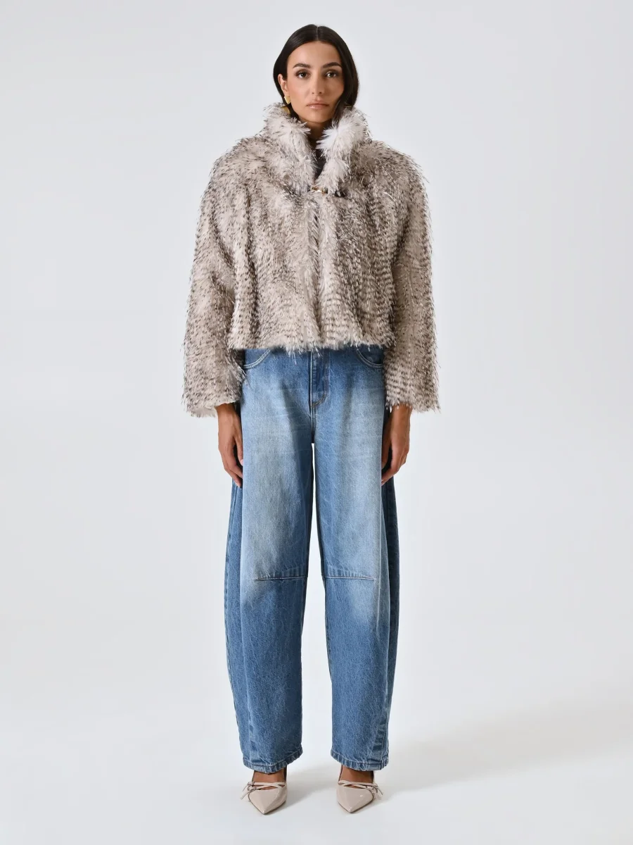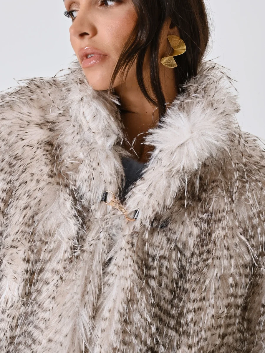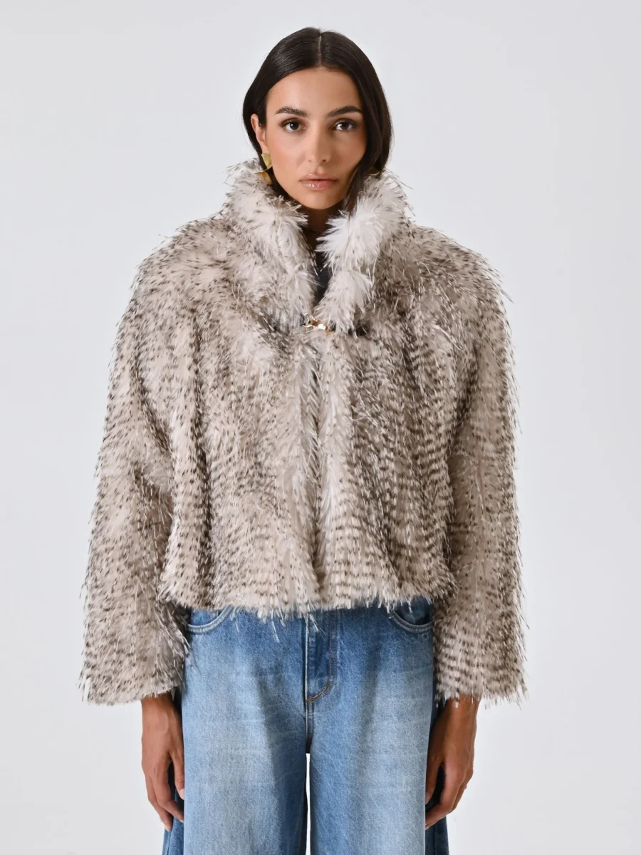 Realizzata in morbido tessuto sintetico effetto pelliccia, la Giacca effetto pelliccia si distingue per il pattern animalier nei toni naturali, l’effetto piumato e la chiusura con fiocco al collo, che esalta il design corto e raffinato.