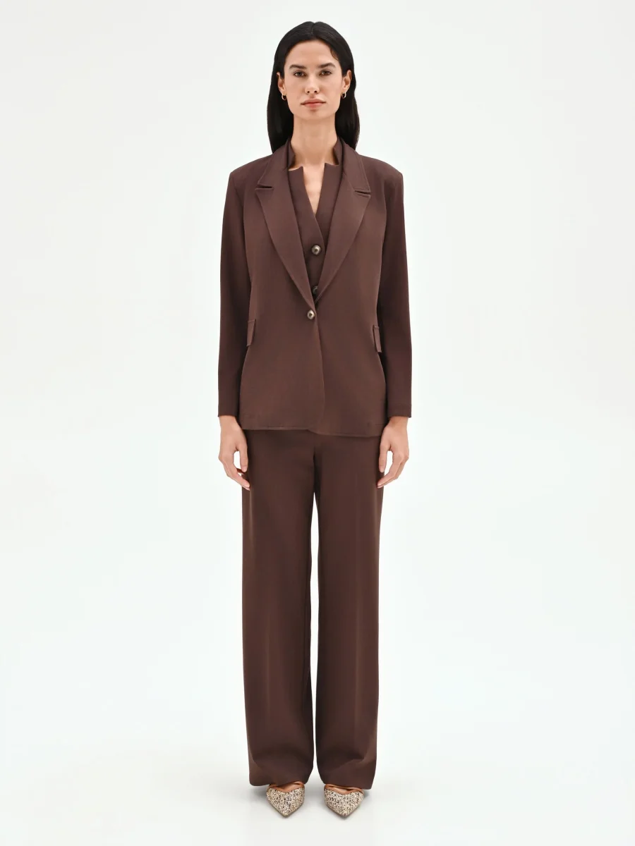 Linee pulite e una vestibilità impeccabile definiscono la giacca monopetto color cioccolato, un capo essenziale per la donna che cerca un’eleganza funzionale e contemporanea. La sua tonalità calda e intensa la rende una valida alternativa al classico nero, facile da abbinare e perfetta per l’intera stagione. Realizzata in punto milano, un tessuto che assicura comfort e una caduta perfetta, presenta un design classico con revers, spalle strutturate che donano carattere e maniche lunghe. La chiusura frontale è affidata a un unico bottone che sottolinea delicatamente la silhouette, mentre il taglio dritto e le due tasche a filetto con pattina sui fianchi completano un’estetica curata e professionale. Pensata per l’ufficio o per appuntamenti formali, questa giacca diventa il fulcro di un look impeccabile se abbinata al gilet (CFC0128709003B401) e ai pantaloni coordinati (CFC0128724003B401), creando un completo sofisticato. Indossala anche su un abito tubino o con un denim per interpretare uno stile più disinvolto, confermando la sua natura di capo trasversale.