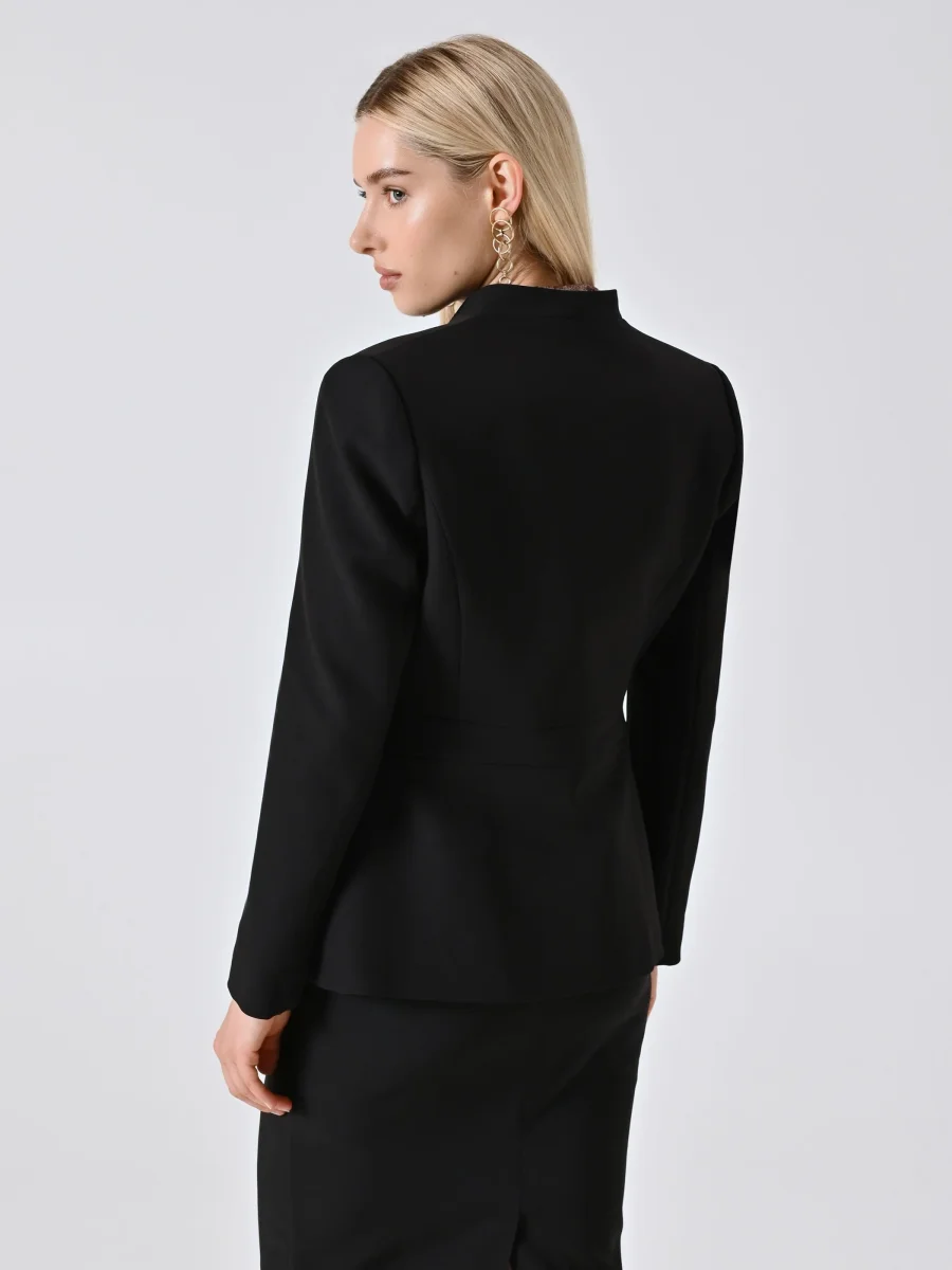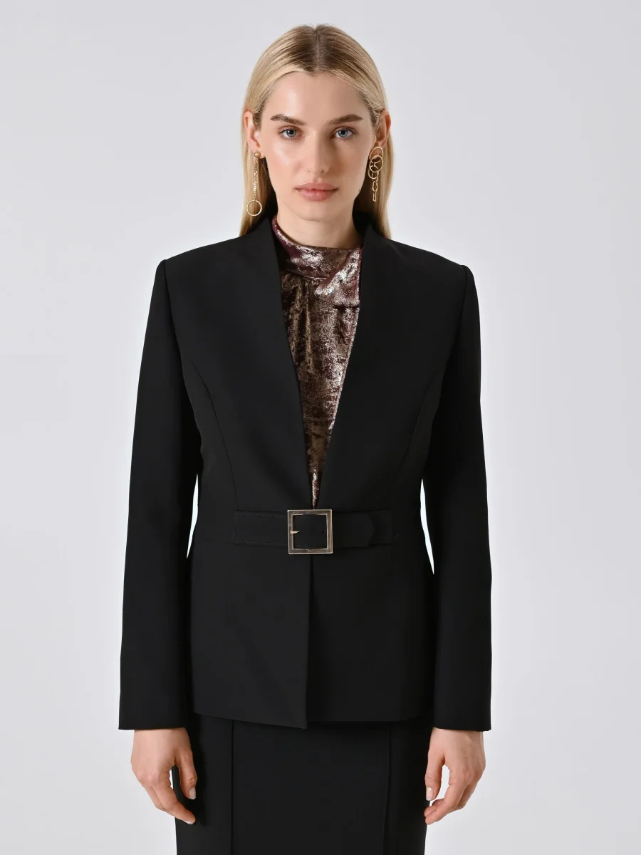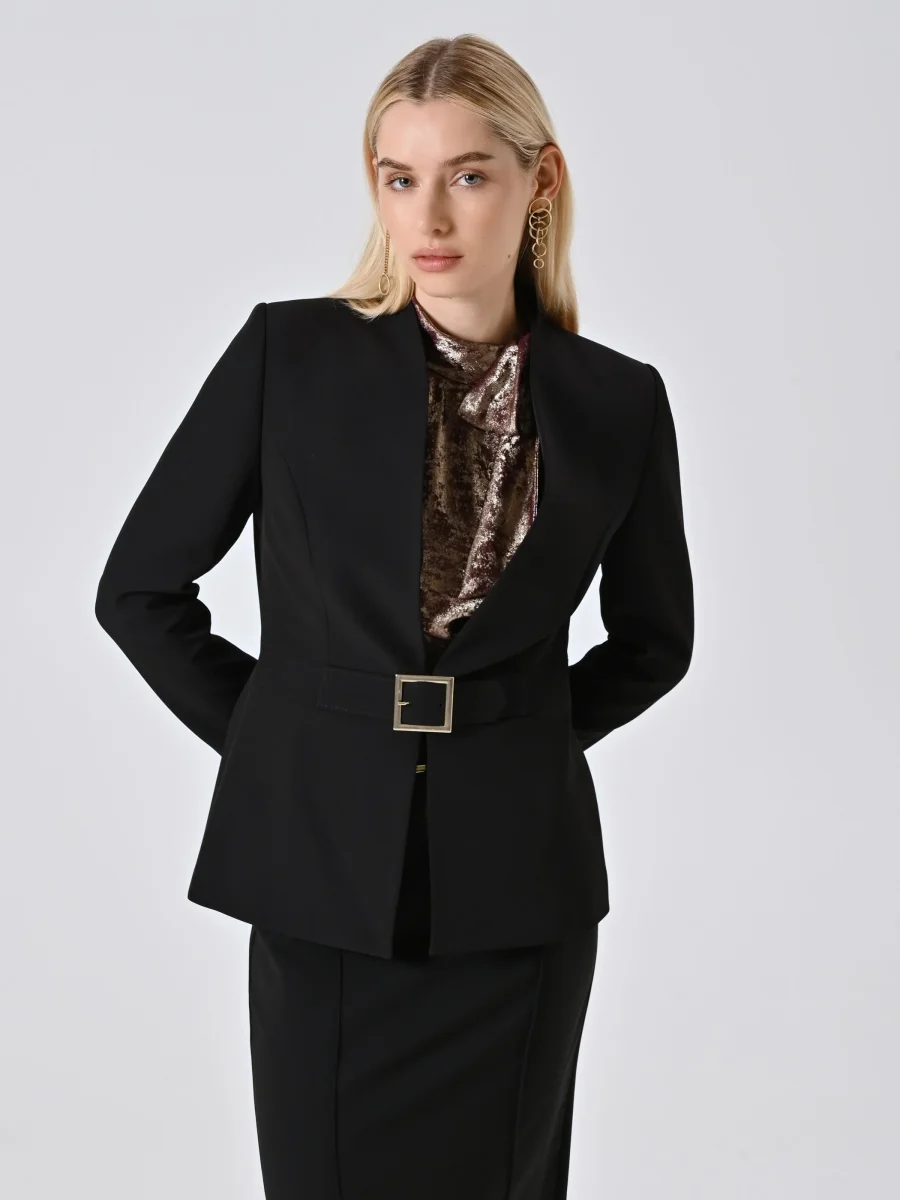 La Giacca con Fibbia Geometrica in Tessuto Tecnico è un capo dal carattere deciso e dalla linea elegante, pensato per valorizzare con stile la silhouette femminile.
