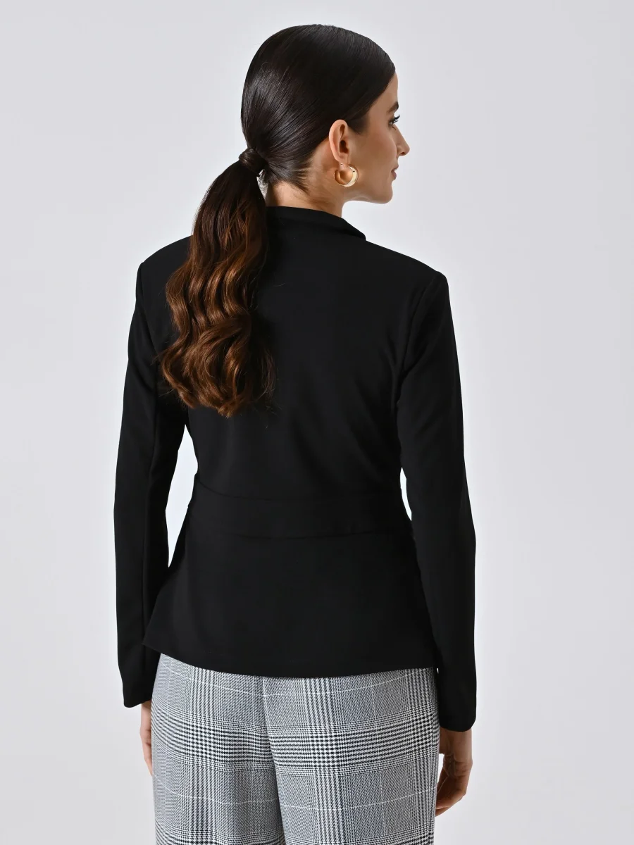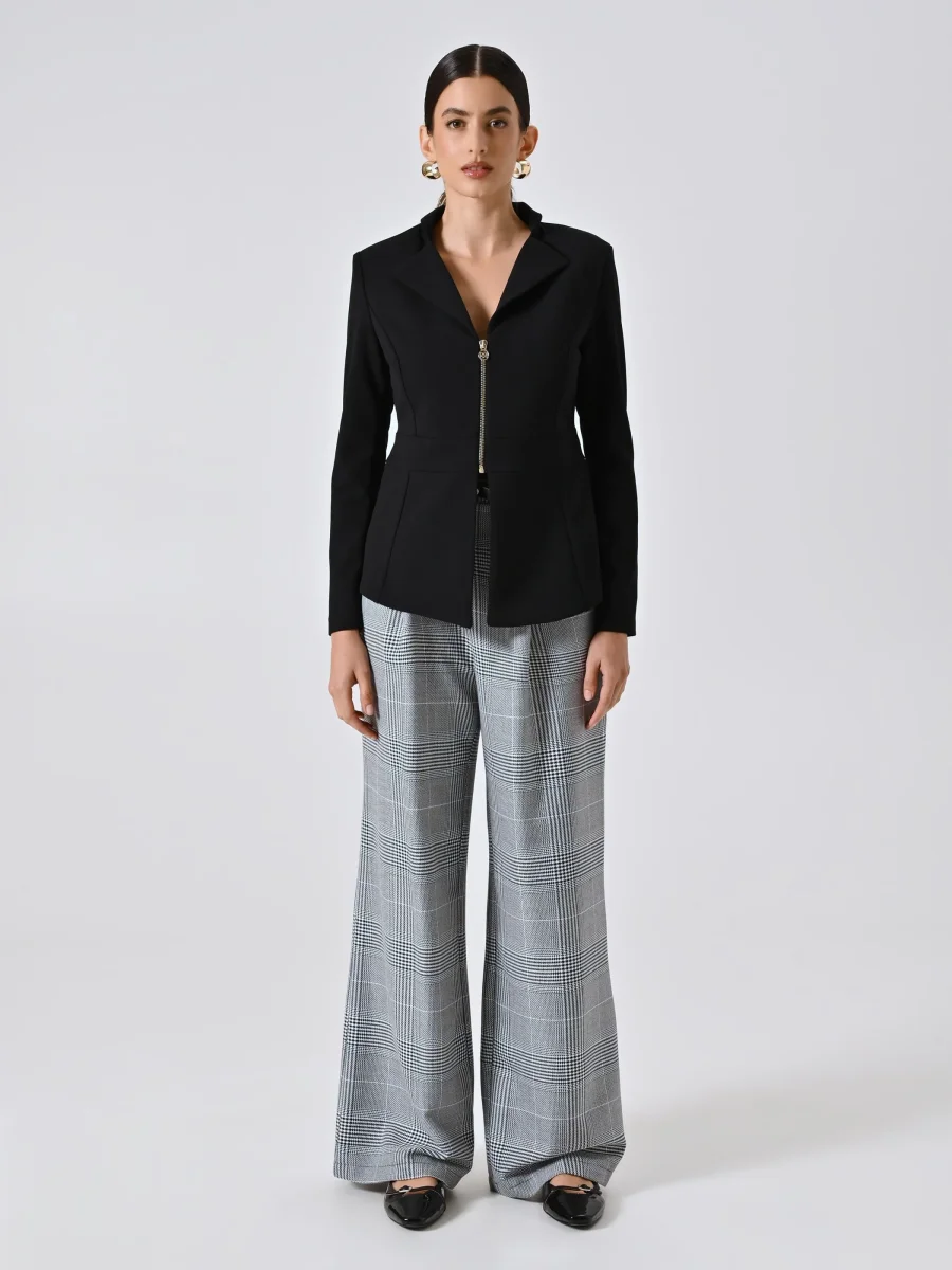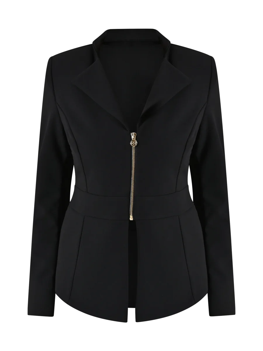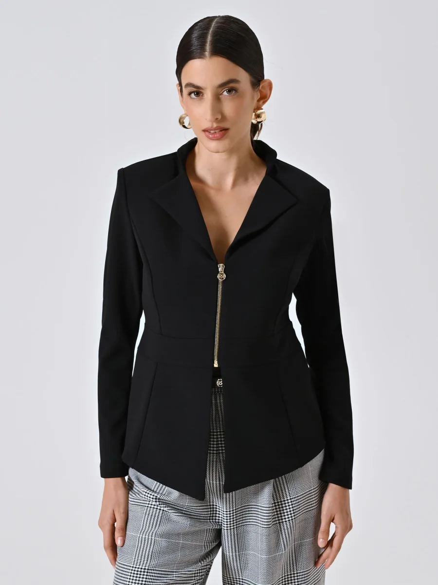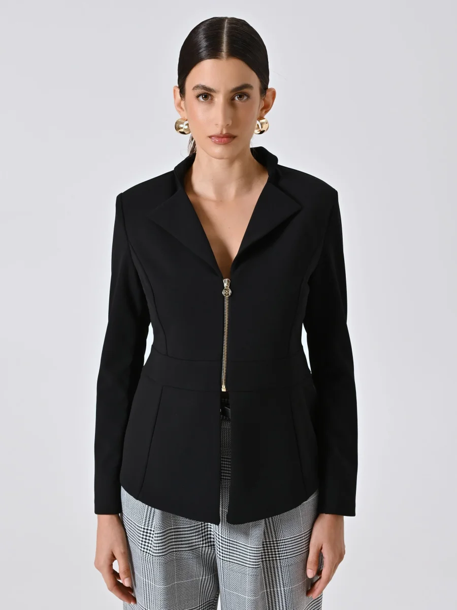 Realizzata in scuba mano crepe, presenta un design strutturato con colletto classico parzialmente in piedi, bordi effetto baschina al fondo e zip dorata. Le spalline leggermente imbottite donano definizione alla figura, mentre la costruzione sfoderata rende il capo leggero e confortevole.
