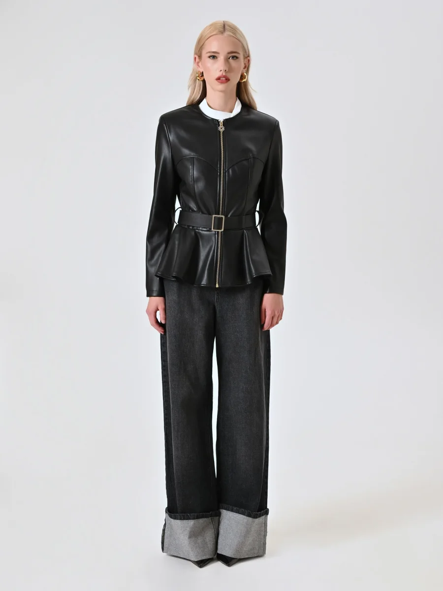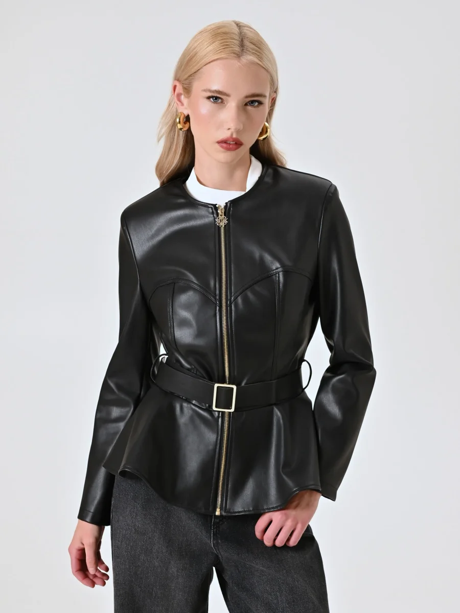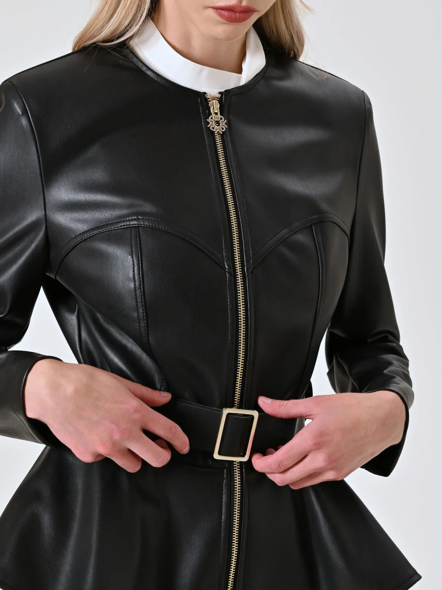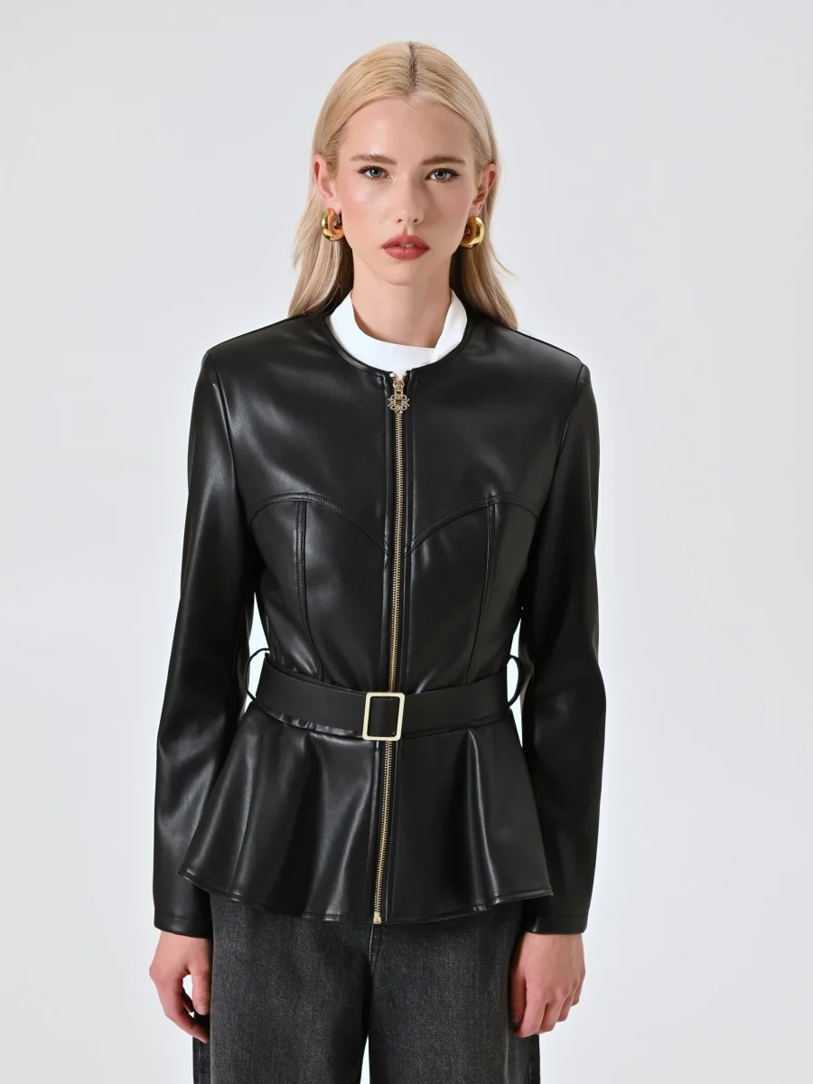 La Giacca in Similpelle con Baschina è una proposta femminile e decisa, perfetta per completare look contemporanei pensati per occasioni speciali. Realizzata in similpelle, la Giacca in Similpelle con Baschina presenta una struttura definita da baschina, cintura con fibbia removibile e passanti, spalline imbottite e impunture a vista che ne valorizzano la linea. La chiusura frontale è una zip con cursore monogram che aggiunge un tocco distintivo. La Giacca in Similpelle con Baschina si abbina facilmente a pantaloni aderenti o gonne midi e si completa con calzature e accessori di collezione. Indossa la Giacca in Similpelle con Baschina per serate dal carattere deciso, eventi after-dark o occasioni in cui desideri un look forte e sofisticato. • Il capo è Made in Italy • La modella è alta 1,74 m e indossa la taglia S.