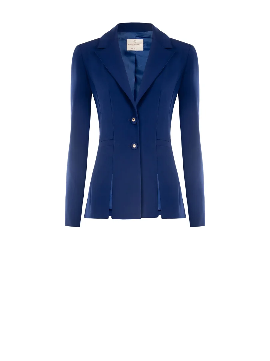 Realizzata in un tessuto tecnico dalla caduta liscia e compatta, la giacca presenta una modellistica sciancrata studiata per enfatizzare il punto vita, incorniciata da spalle definite e maniche lunghe dritte. L’ispirazione classica si ritrova nei revers a lancia e nelle due tasche a filetto orizzontali con pattina sui fianchi. Elemento distintivo del design è la chiusura frontale con spacchetti che creano un effetto baschina.
