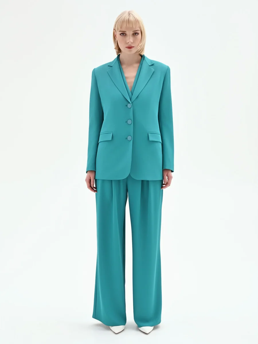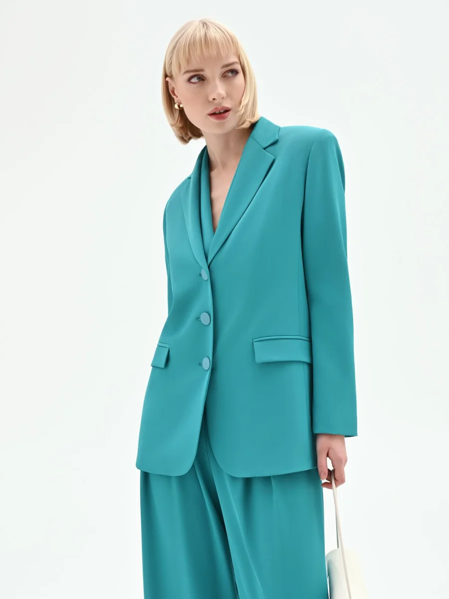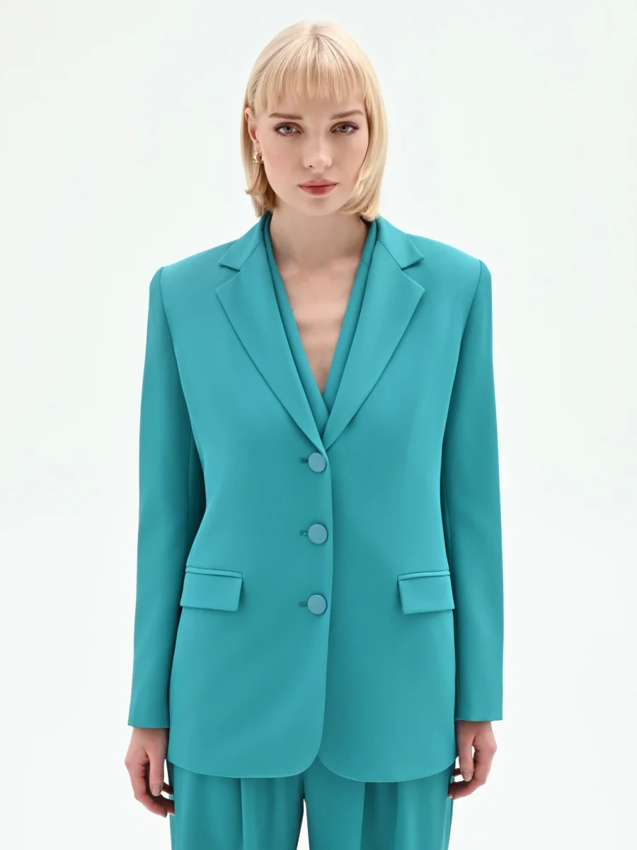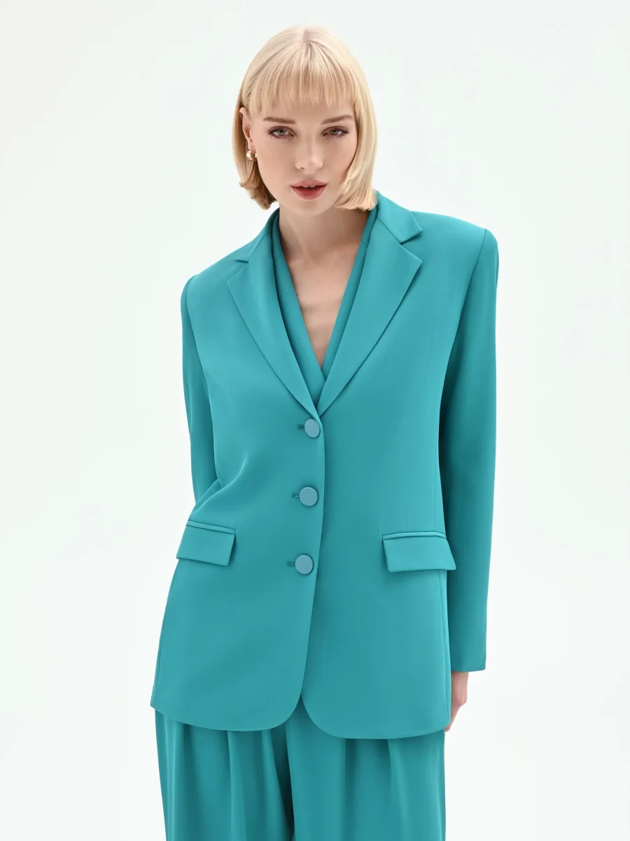 Immaginata per la donna dinamica che passa dagli impegni lavorativi agli appuntamenti serali, la giacca monopetto verde smeraldo è ideale per costruire tailleur di carattere. Per un total look d’impatto, si consiglia l’abbinamento con i pantaloni coordinati, creando un completo a tre pezzi di moderna eleganza.
