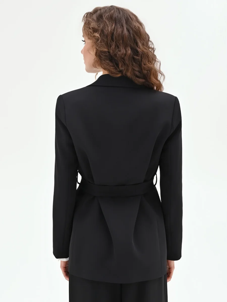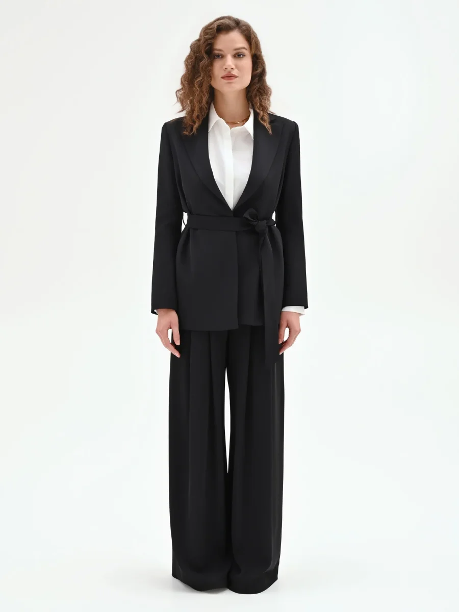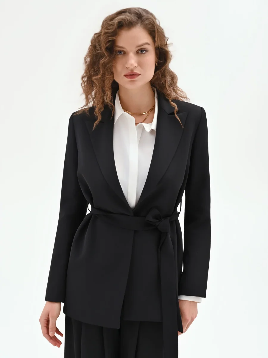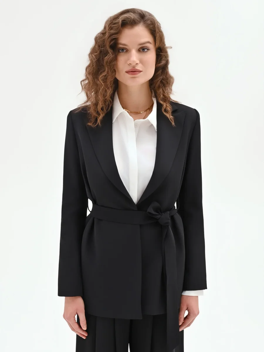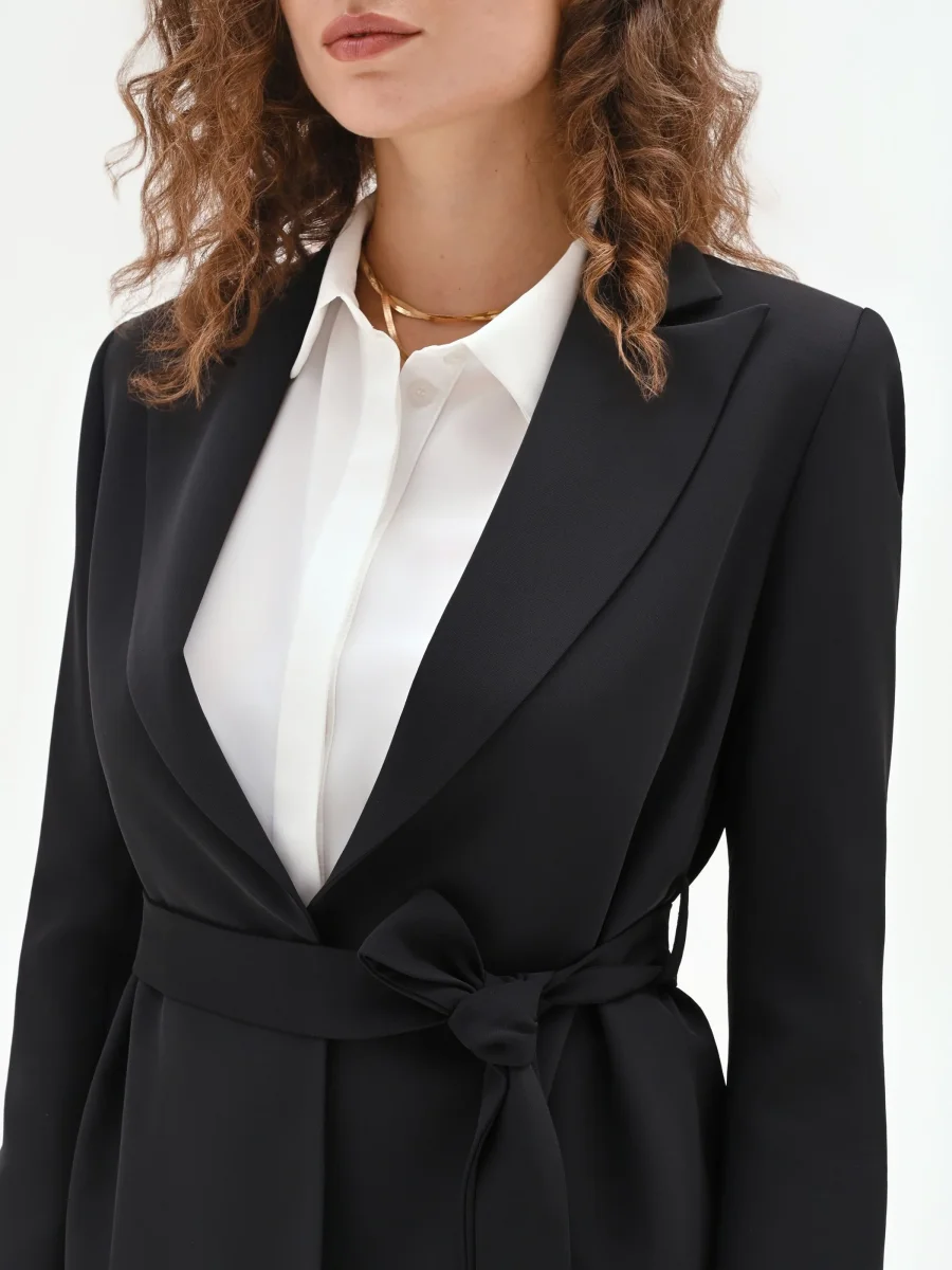 Elegante e versatile, la giacca vestaglia nera è la scelta perfetta per completare look raffinati con un tocco moderno. Caratterizzata da una linea scivolata e senza bottoni, si chiude con cintura in tessuto removibile, con passanti, da annodare in vita per valorizzare la silhouette. Indossala in coordinato con pantaloni neri per un total look sofisticato e armonioso, ideale per cerimonie, eventi o occasioni speciali.
