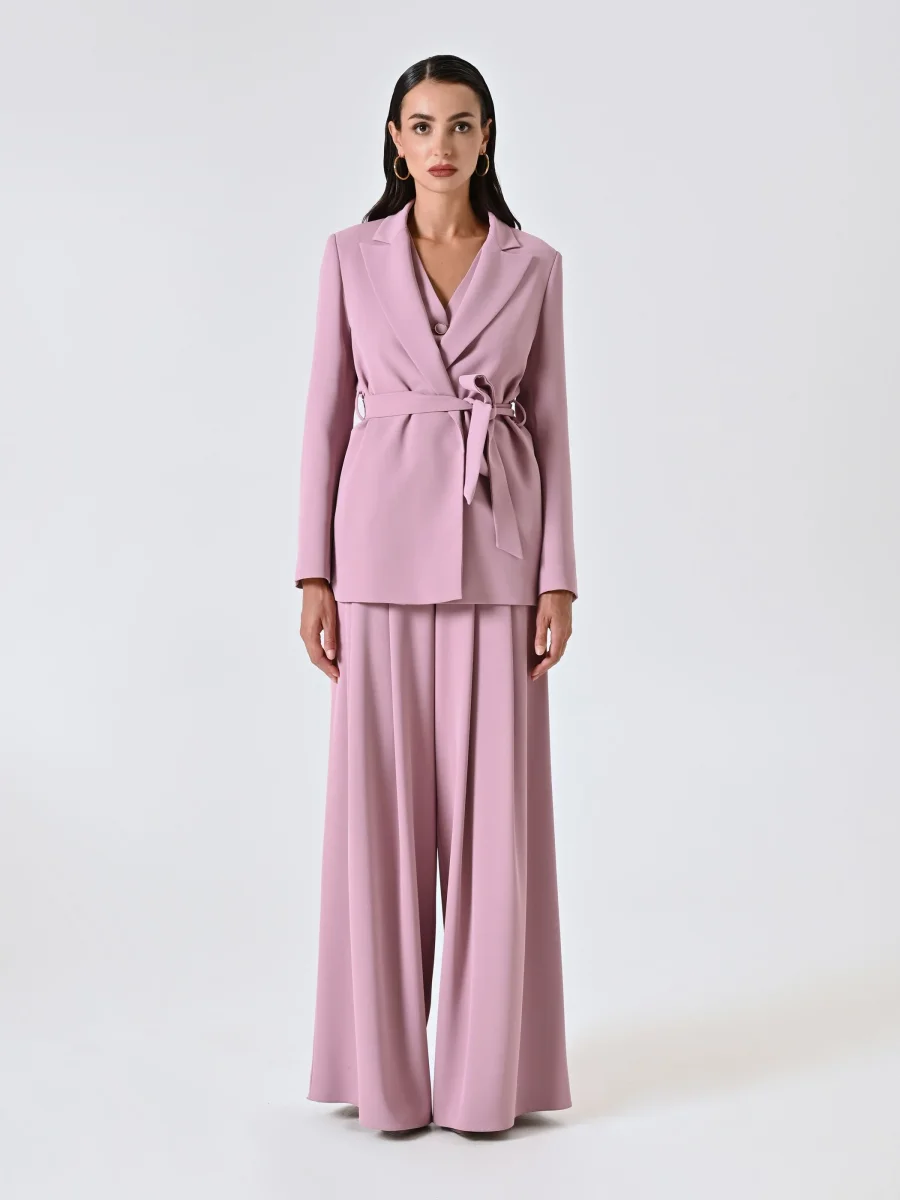 Elegante e versatile, la giacca vestaglia in cadi fluido è la scelta perfetta per completare look raffinati con un tocco moderno. Caratterizzata da una linea scivolata e senza bottoni, si chiude con cintura in tessuto removibile, con passanti, da annodare in vita per valorizzare la silhouette. Il tessuto fluido e la nuance rosa malva donano al capo un’eleganza femminile e disinvolta. Indossala in coordinato con il gilet (CFC0125488003B373) e i pantaloni (CFC0125495003B373) per un total look sofisticato e armonioso, ideale per cerimonie, eventi o occasioni speciali.