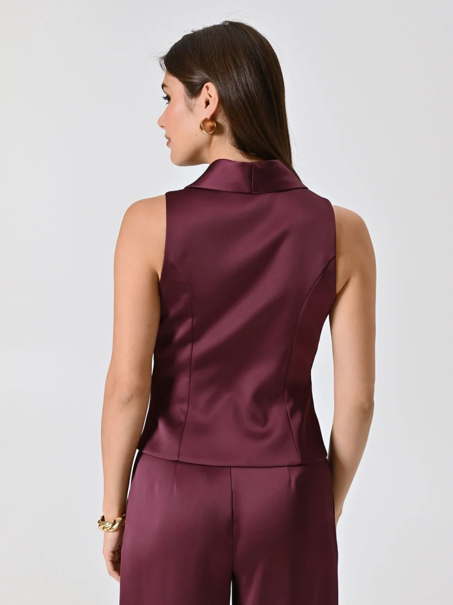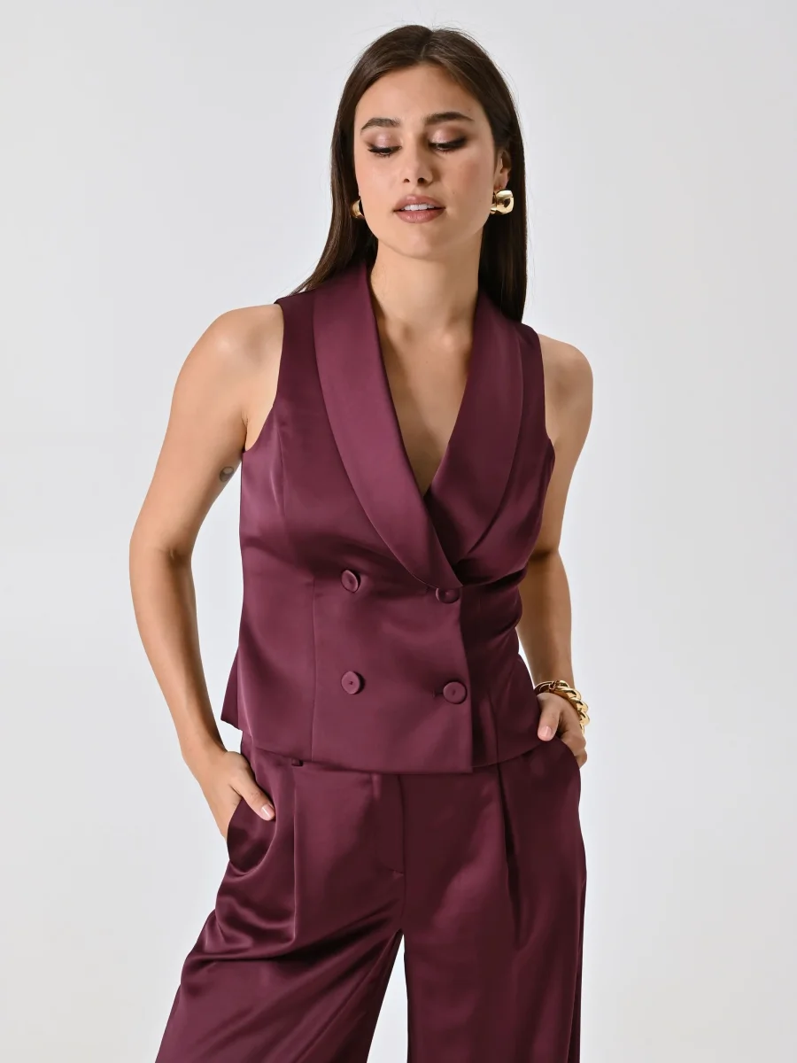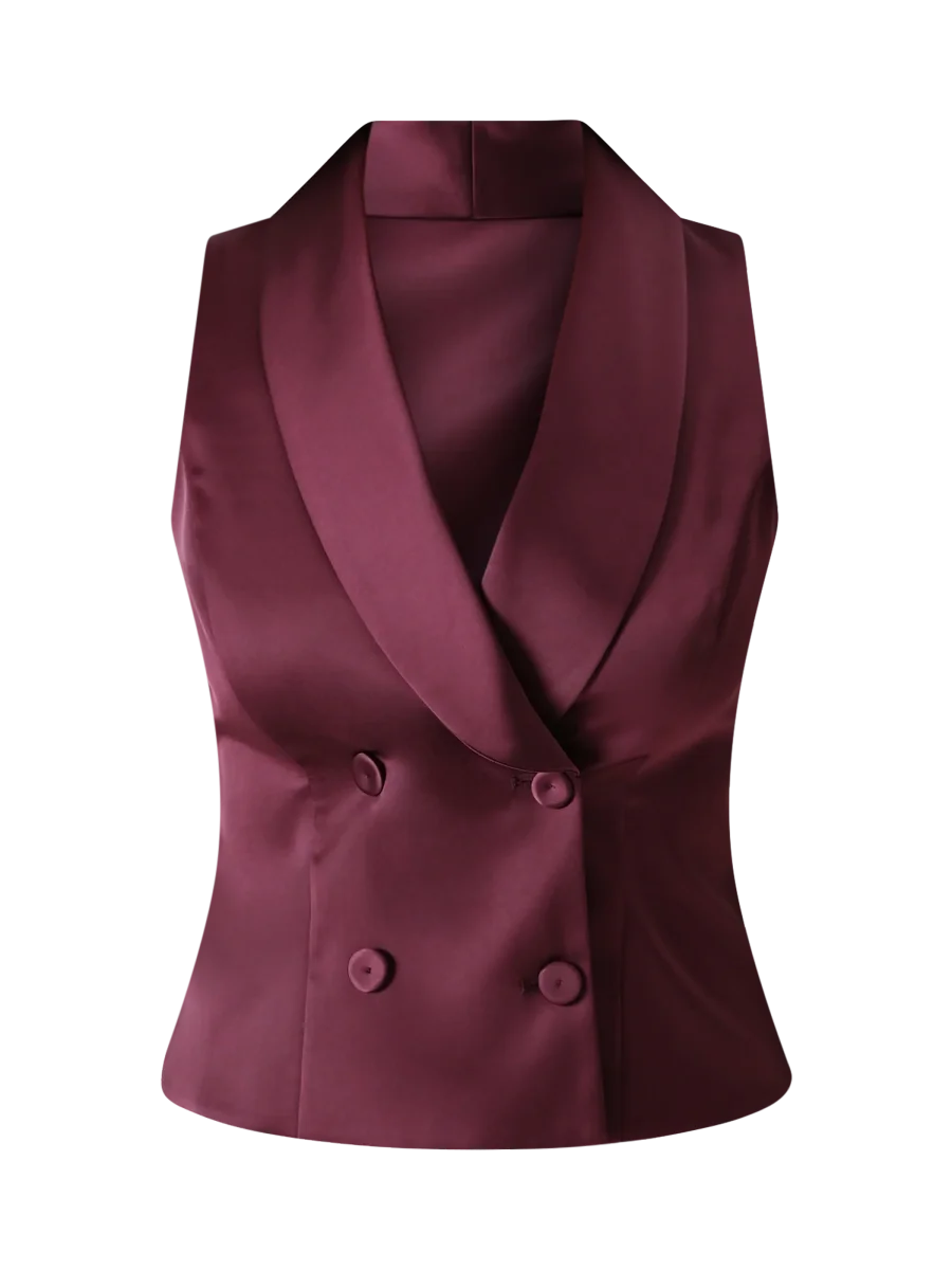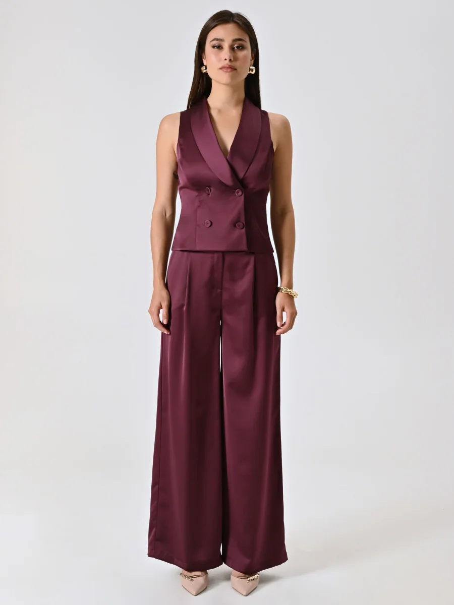Il Gilet Bordeaux in Raso è un capo raffinato e contemporaneo, pensato per aggiungere un tocco elegante ai look delle occasioni speciali.
