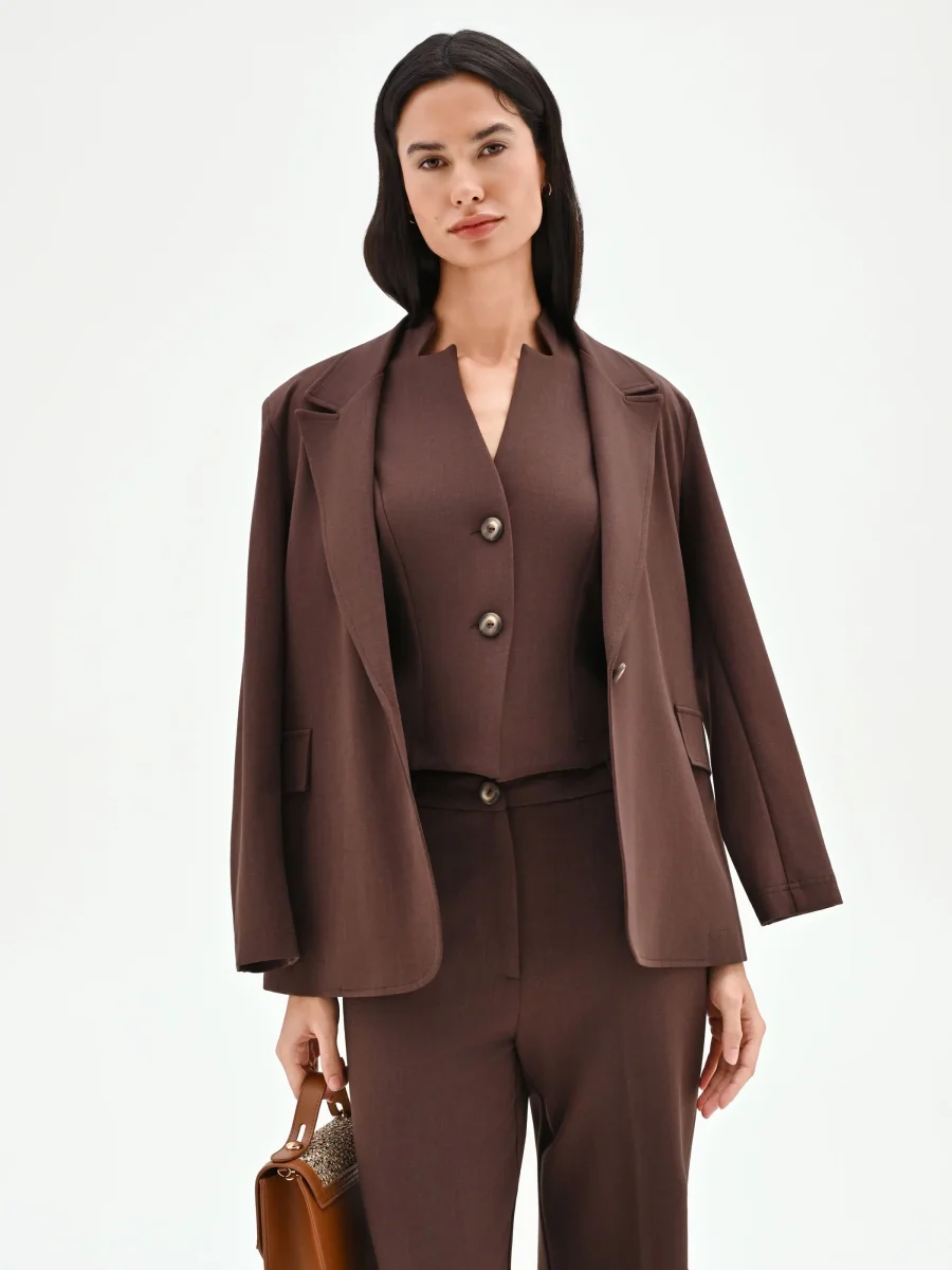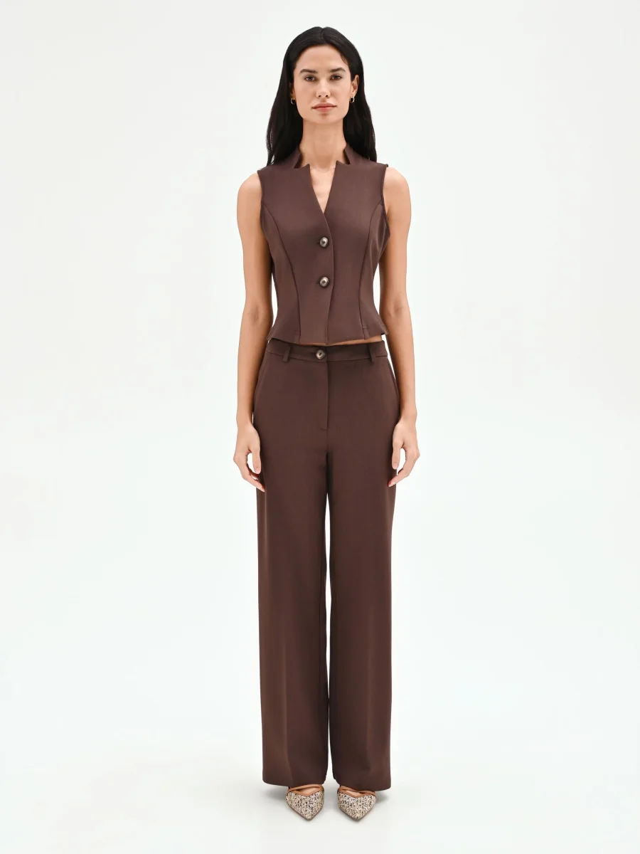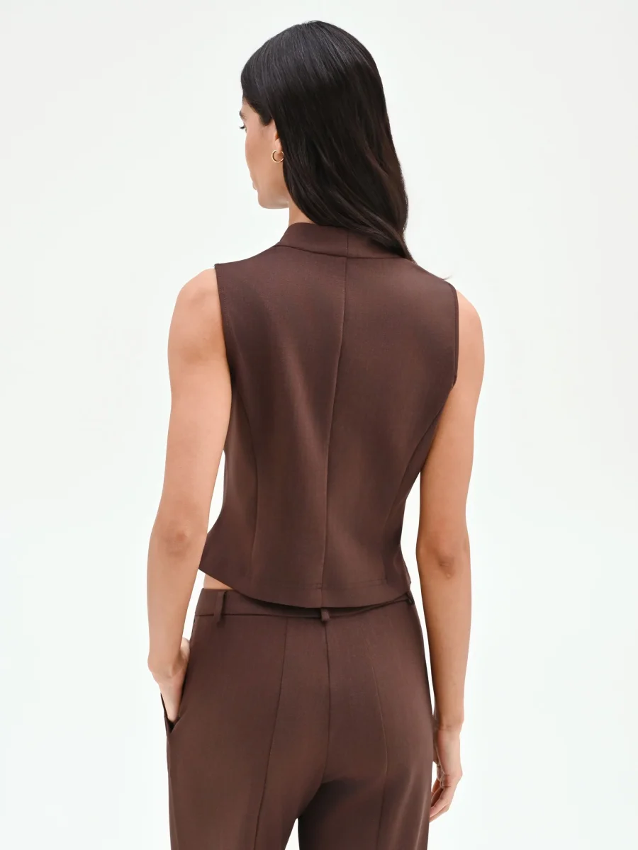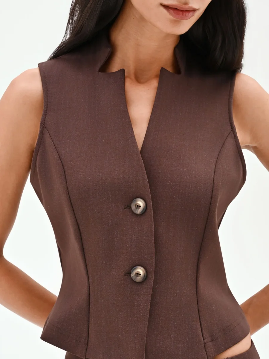 Un’interpretazione contemporanea e femminile del guardaroba formale, il gilet color cioccolato è il capo perfetto per chi cerca un’eleganza strutturata dal carattere deciso. Realizzato in confortevole punto milano, la sua vestibilità aderente è studiata per seguire e valorizzare la silhouette, grazie anche alle cuciture verticali che ne definiscono la forma. Il design si distingue per il profondo scollo a V, arricchito da un colletto con revers a punta che slancia la figura con un tocco di rigore. La chiusura frontale con due bottoni a vista color argento aggiunge un dettaglio luminoso e ricercato. Questo gilet è pensato per essere l’elemento centrale di un look coordinato: abbinalo alla sua giacca (codice CFC0128726003B401) e ai pantaloni coordinati (codice CFC0128724003B401) per un completo tre pezzi di grande impatto, ideale per l’ufficio o per occasioni di lavoro importanti. Versatile e moderno, può essere indossato anche da solo sopra una camicia leggera, per completare un outfit con un’alternativa sofisticata al classico blazer.