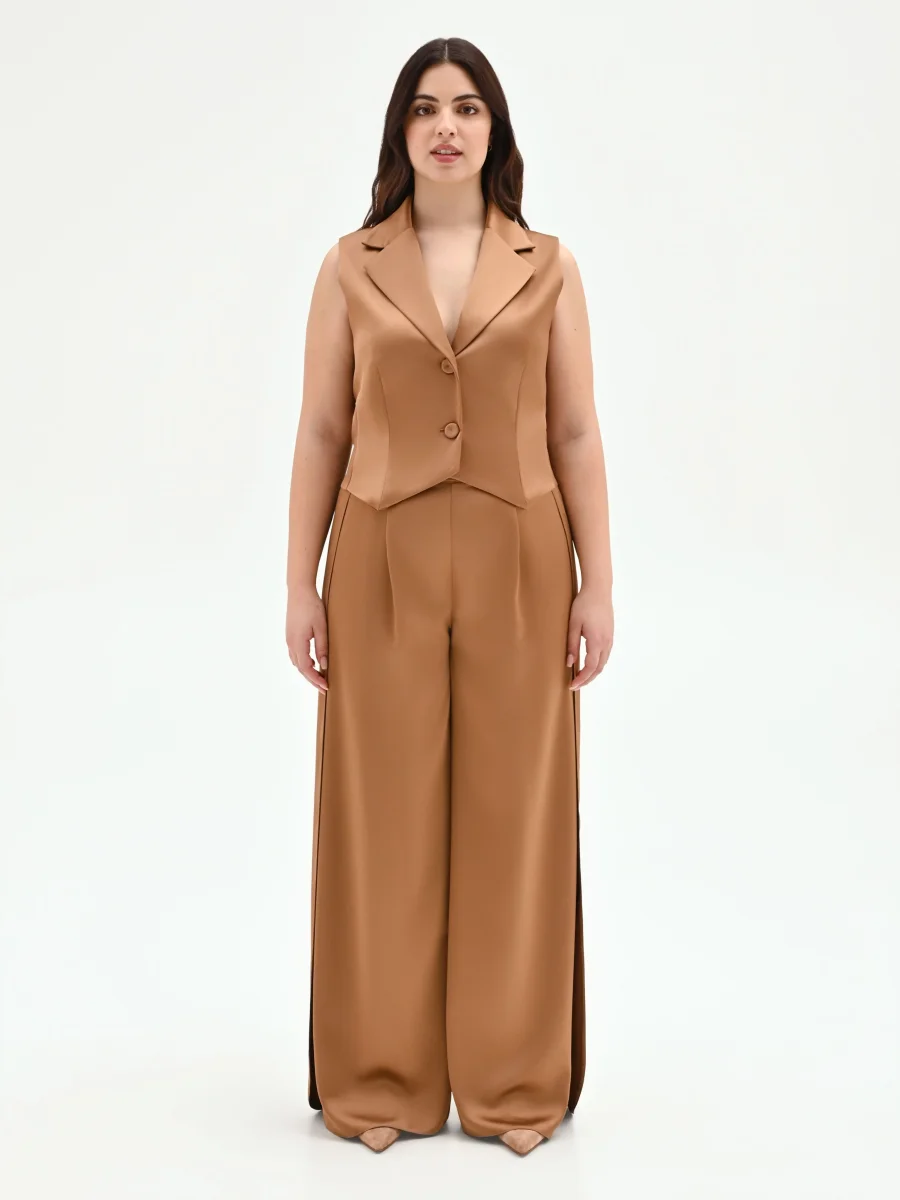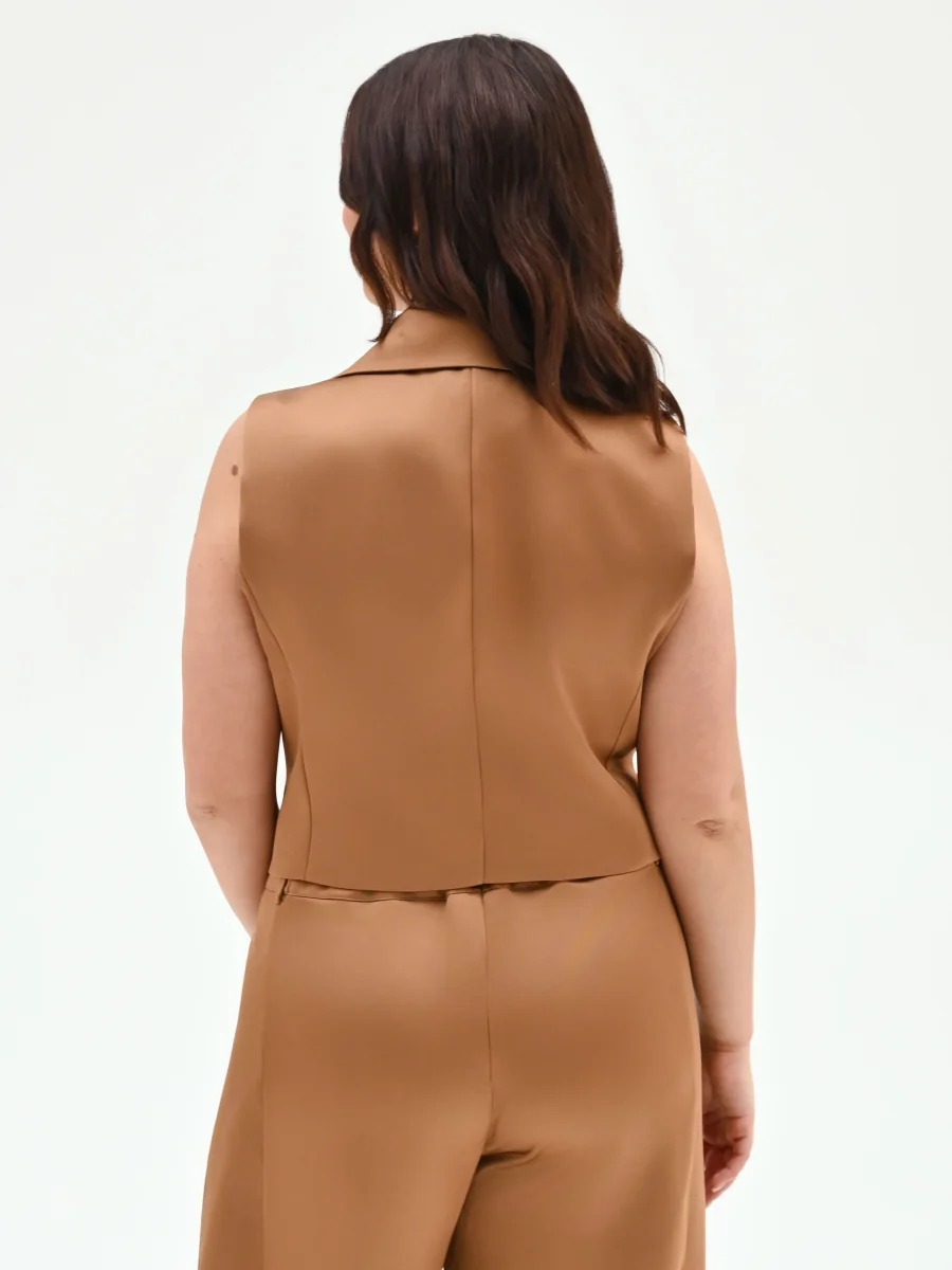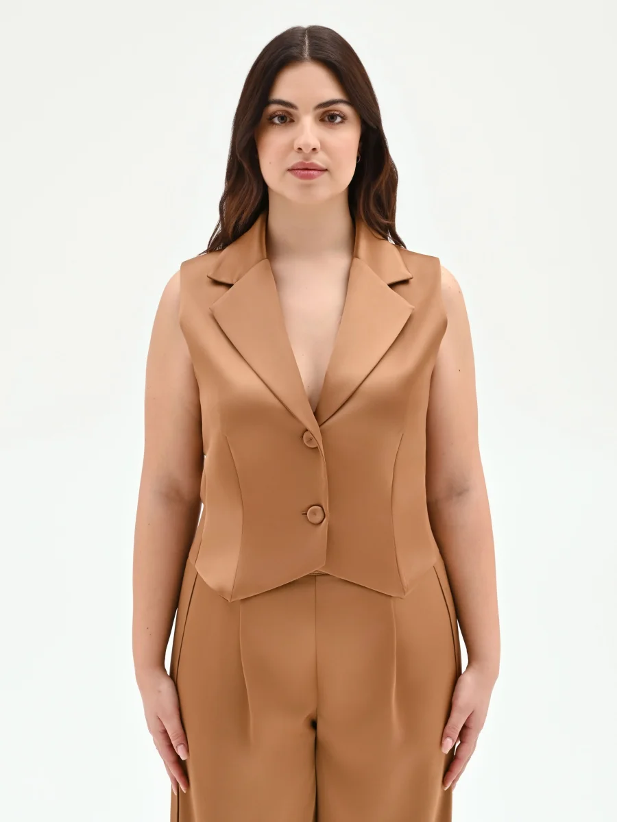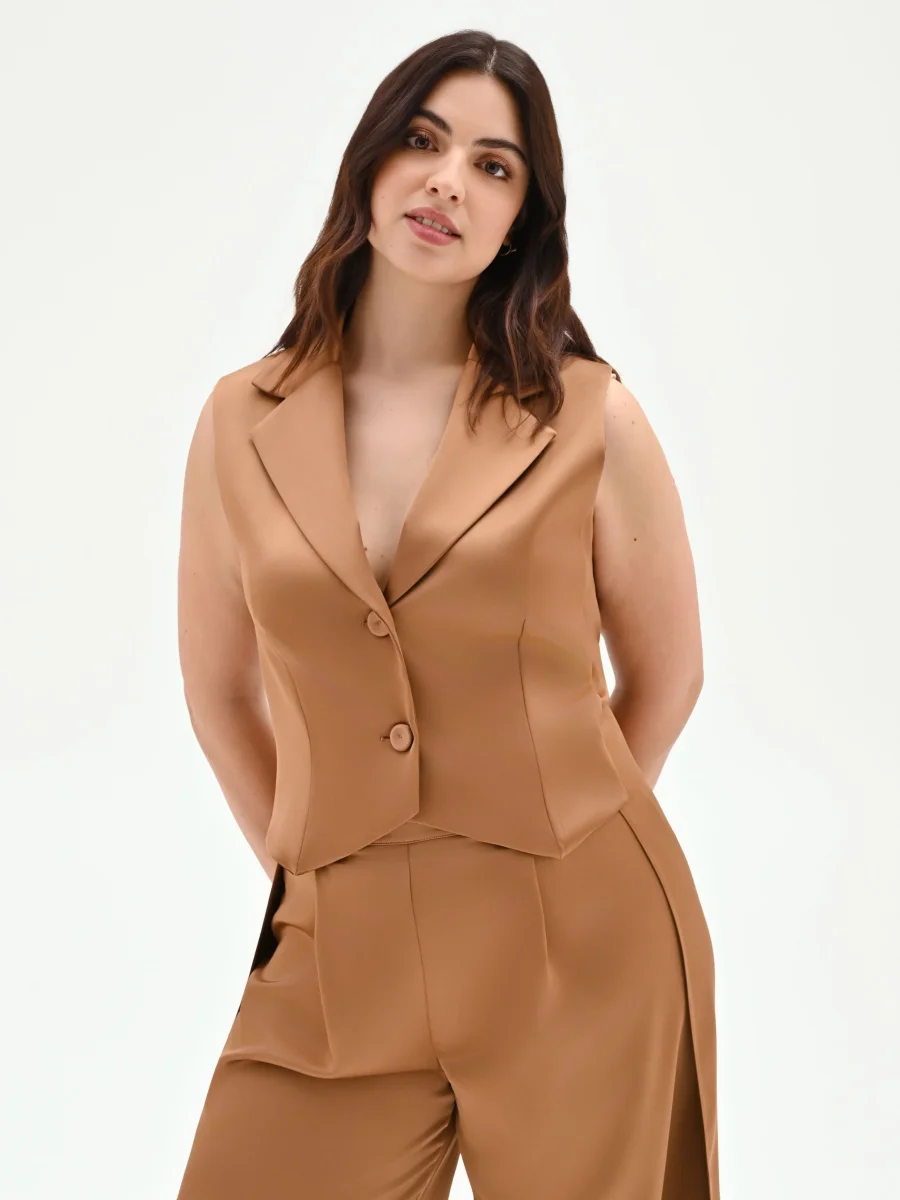 L’eleganza di ispirazione maschile incontra la fluidità del raso in questo gilet marrone bronzo, un capo chiave per costruire look ricercati e di tendenza, perfetto interprete di una femminilità contemporanea. Realizzato in un tessuto liscio dalla finitura delicatamente satinata, il modello presenta una linea pulita che segue e valorizza la silhouette grazie a studiate cuciture verticali. Lo scollo a V profondo è definito da rever classici che incorniciano il décolleté, mentre la chiusura frontale è affidata a due bottoni tono su tono. Il fondo, disegnato con due punte centrali, aggiunge un ulteriore dettaglio di stile. Pensato per essere indossato con i suoi pantaloni coordinati (cod. CFC0128719003B267), crea un completo dalla forte personalità, ideale per l’ufficio o per un evento che richiede un’eleganza non convenzionale. Sfrutta la sua versatilità anche abbinandolo a un denim o a una gonna longuette per un look più informale ma sempre curato.